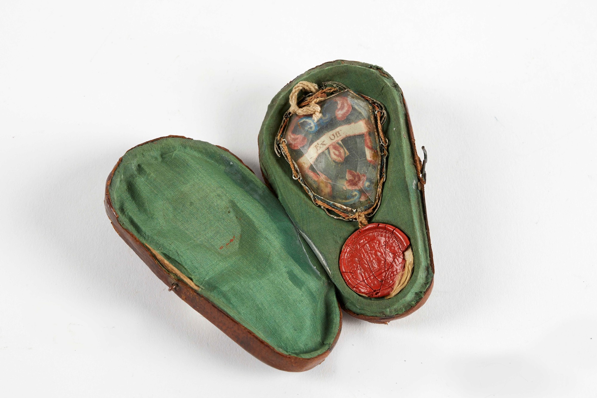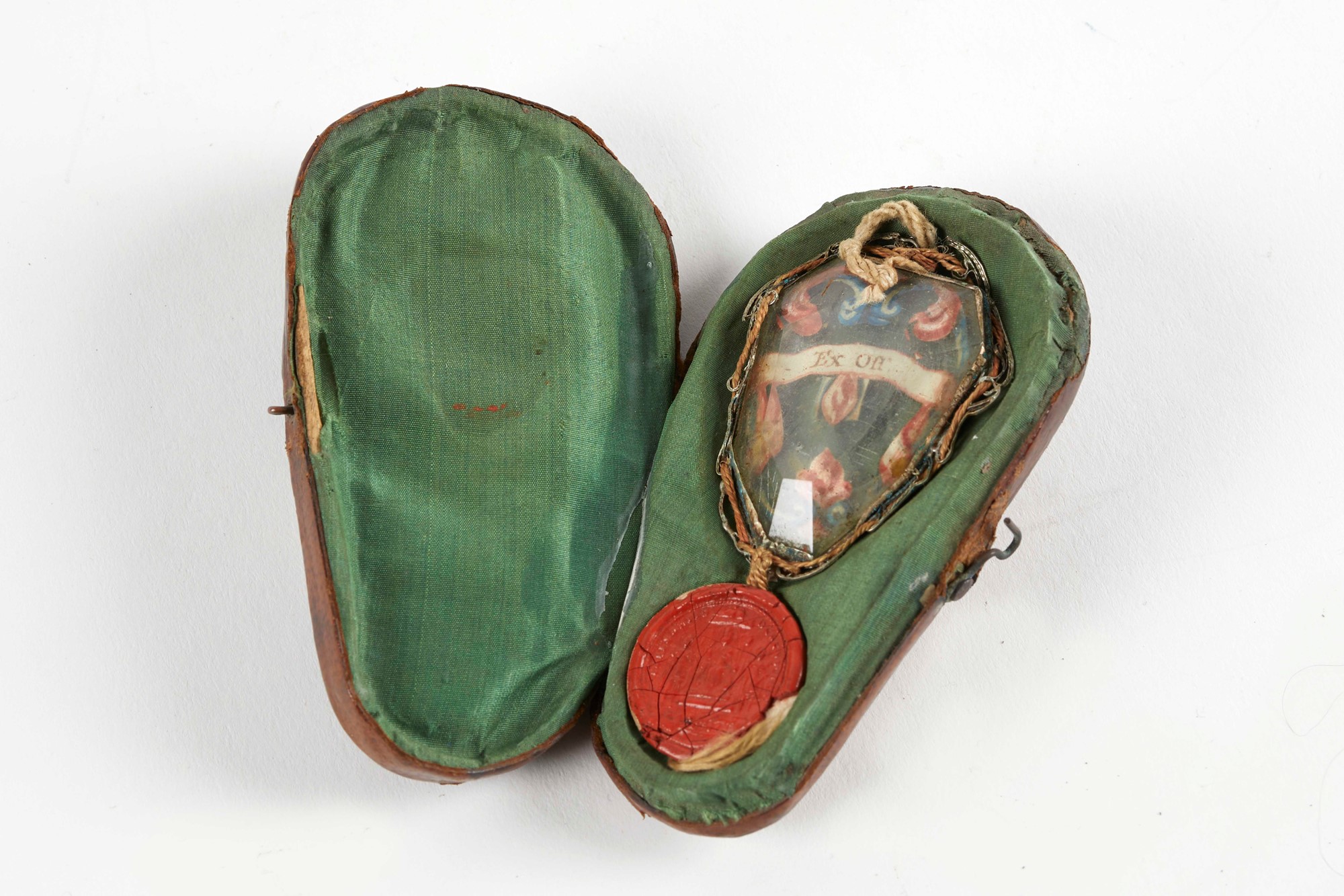 Reliquia custodita entro cristallo di rocca contornato da filigrana d'argento, contenuta in custodia in marocchino. All'interno reca cartiglio "S. Annae Mat.B.V. - Ex. Off.". Accompagnata da sigillo papale in ceralacca. Italia, XVII - XVIII secolo. Cm 9x5. (difetti)