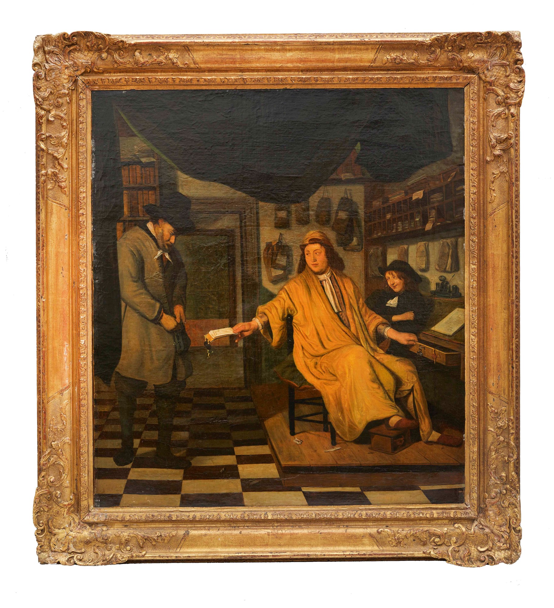 Maestro del XVII secolo. "Notaio presenta la parcella". Olio su tela. Cm 71x63.