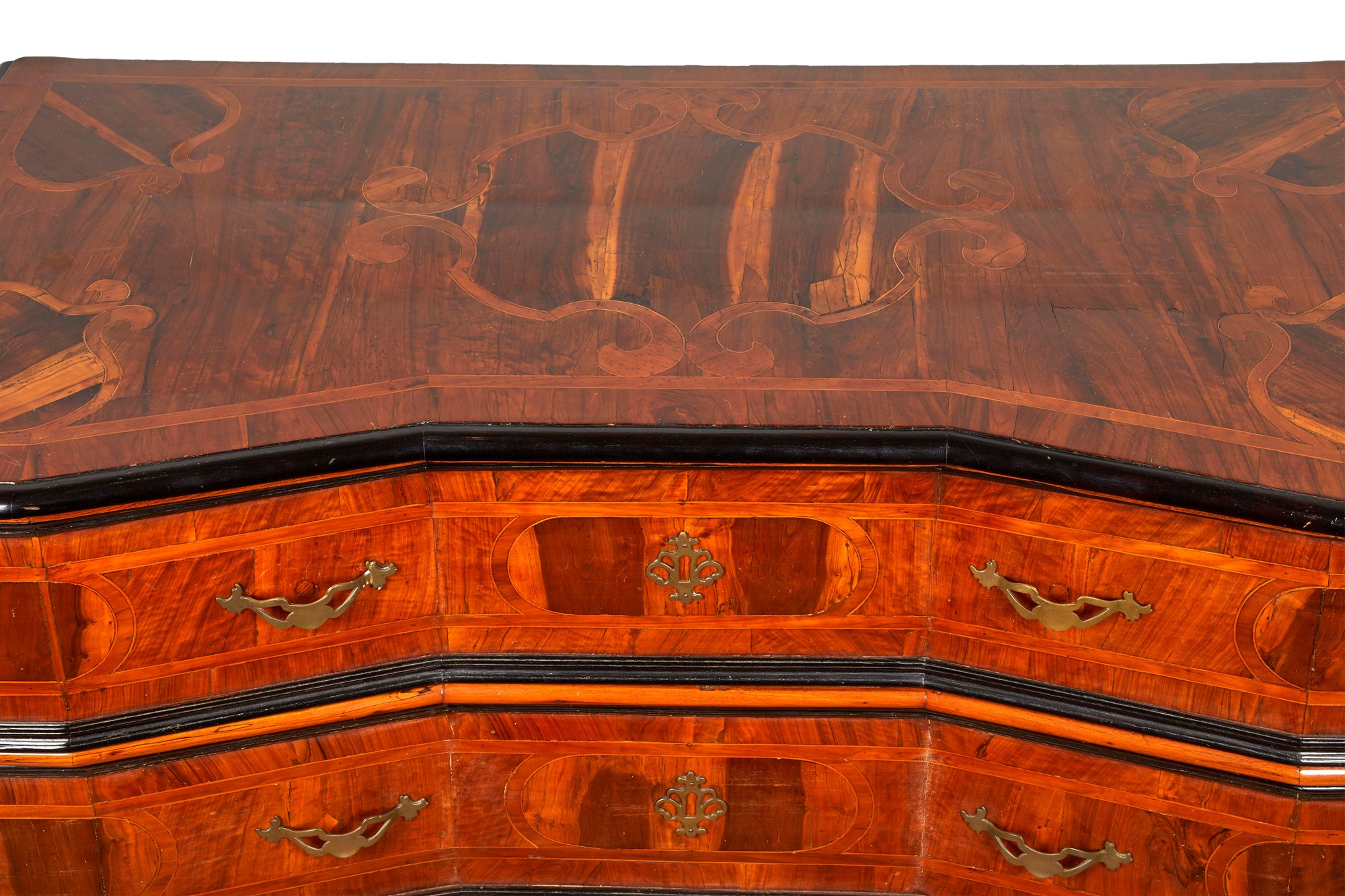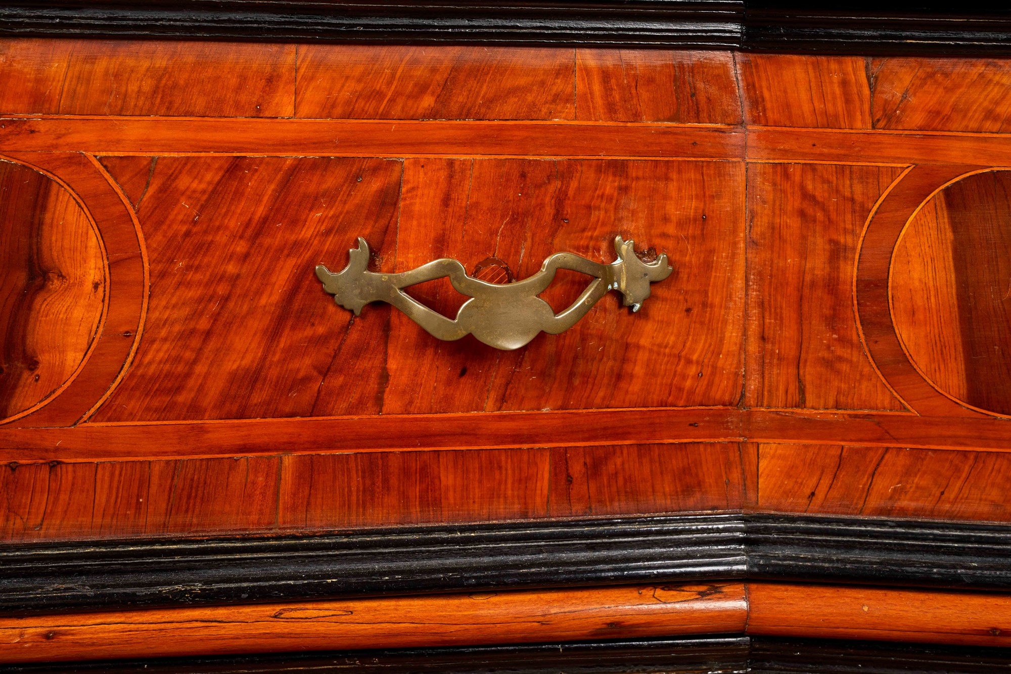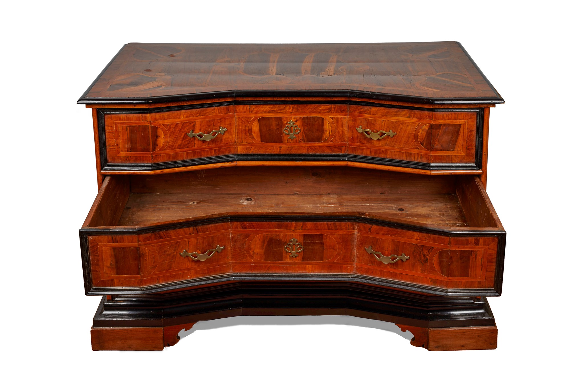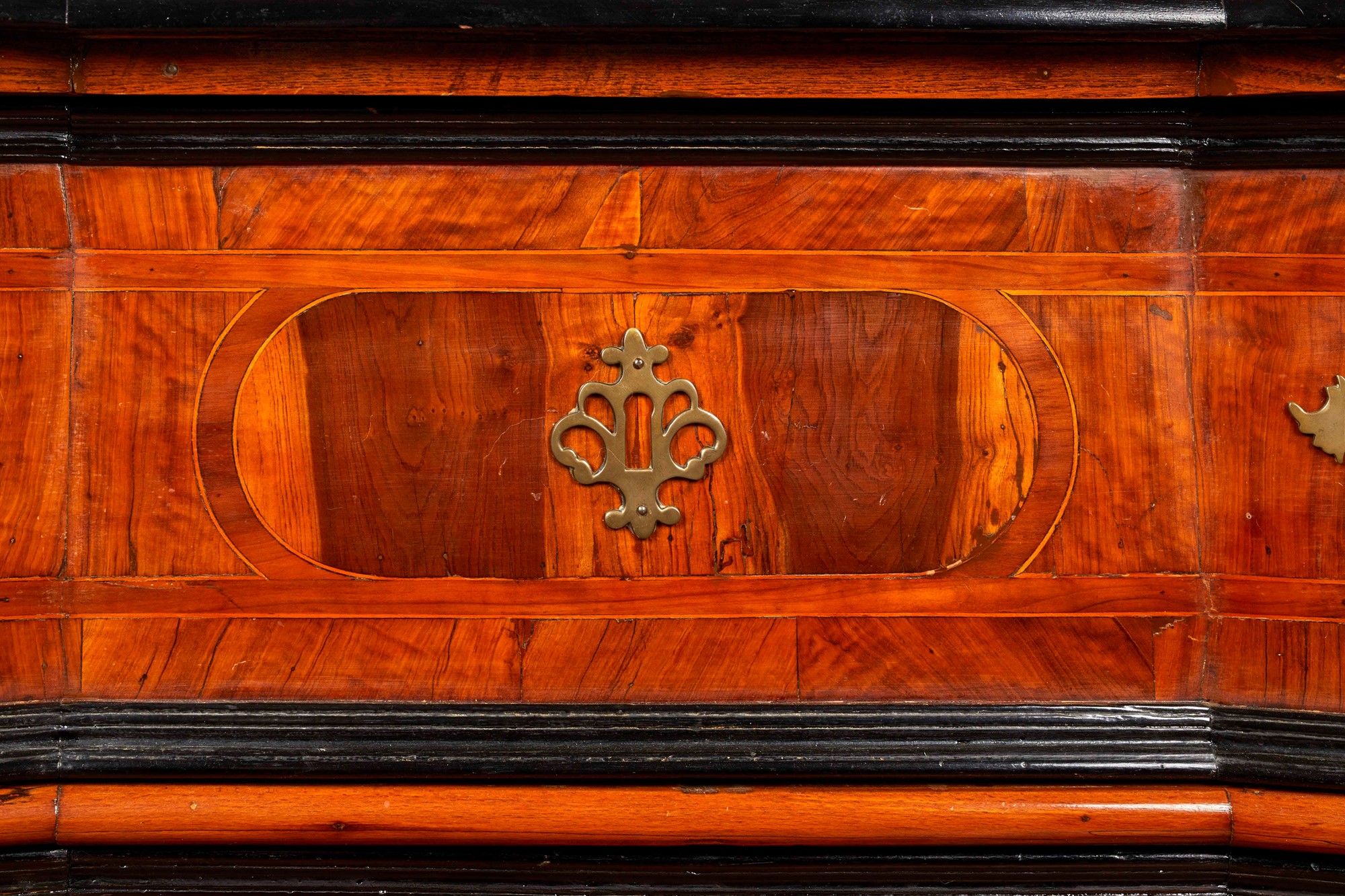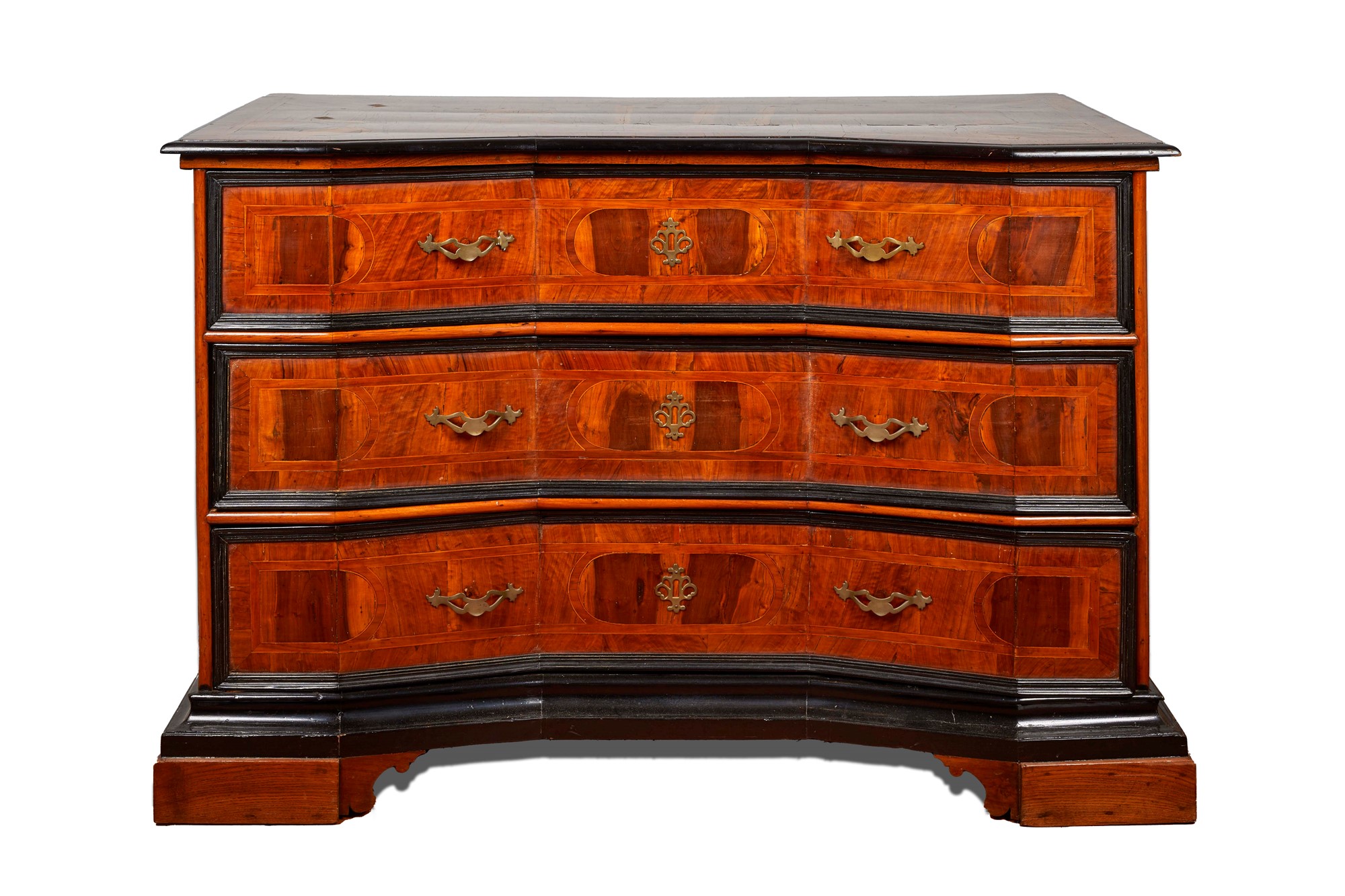Canterano a fronte mosso, lastronato e filettato, con cornice dei cassetti ebanizzata, Emilia, fine del XVII secolo. Cm 97x148x68. (Maniglie non coeve).