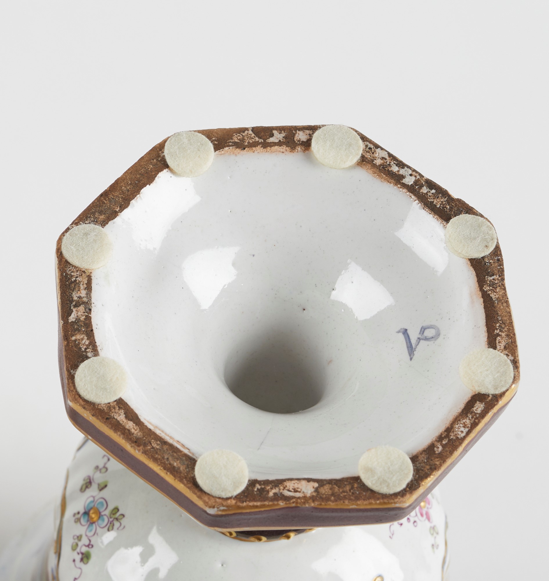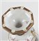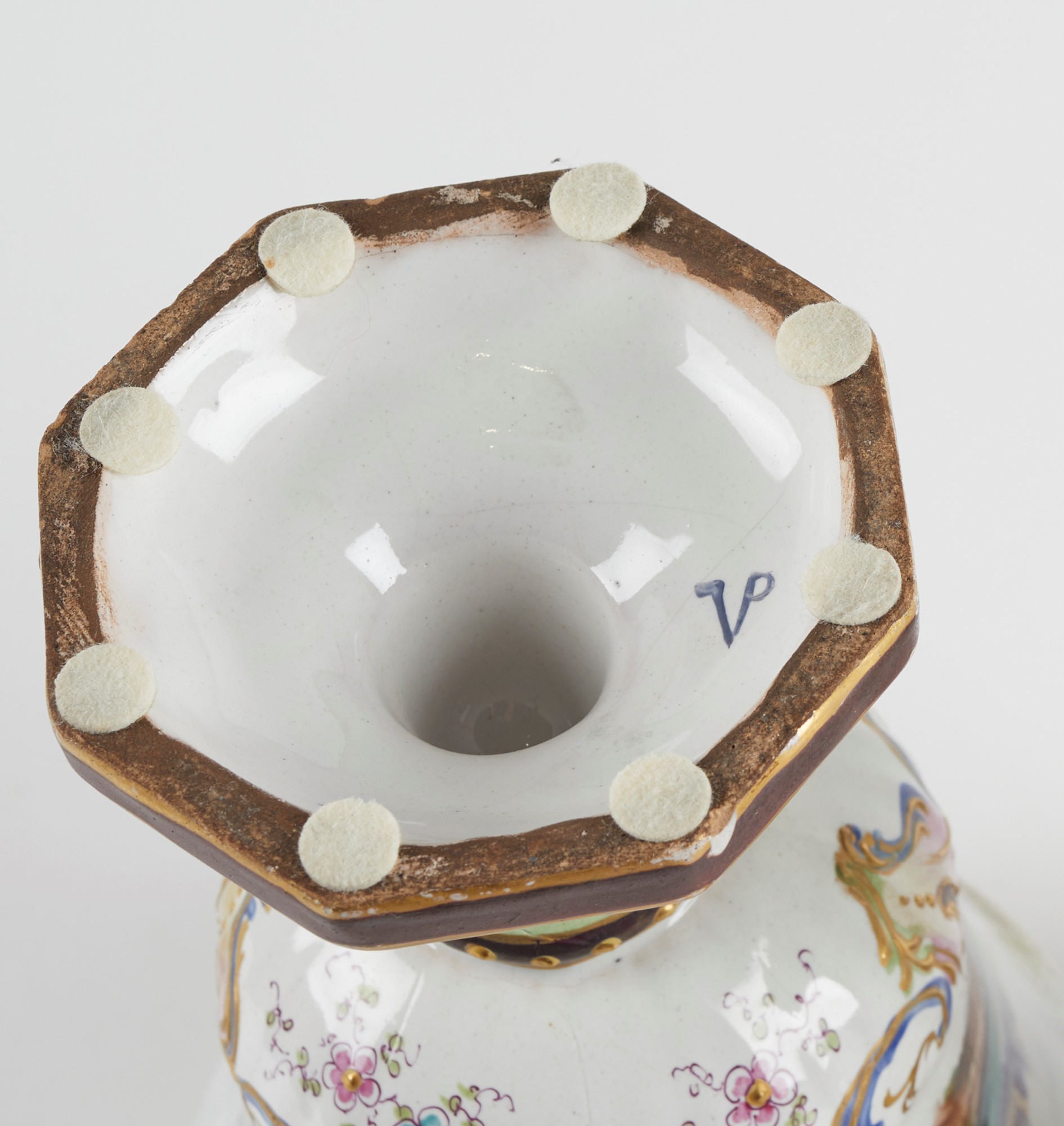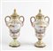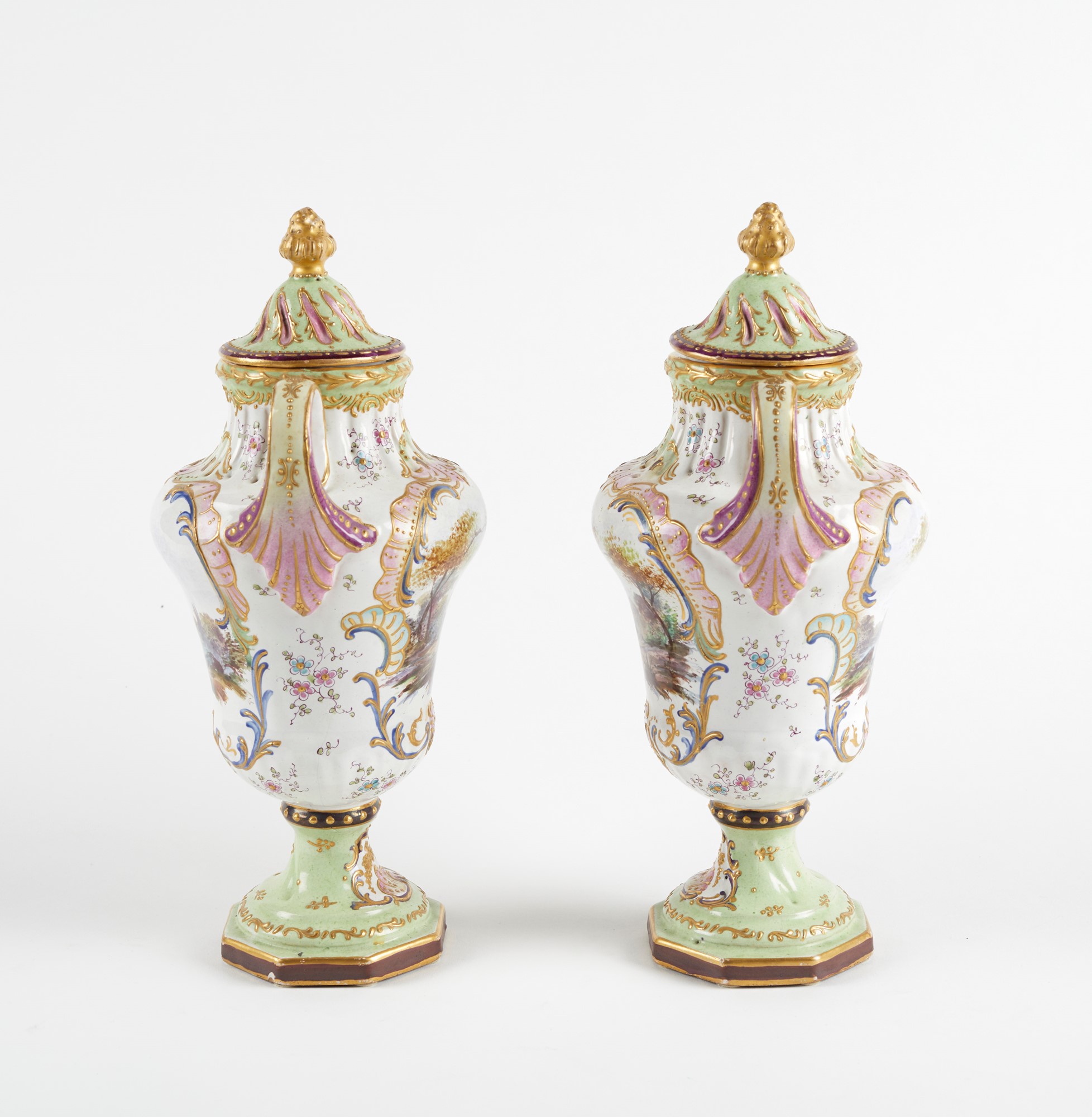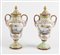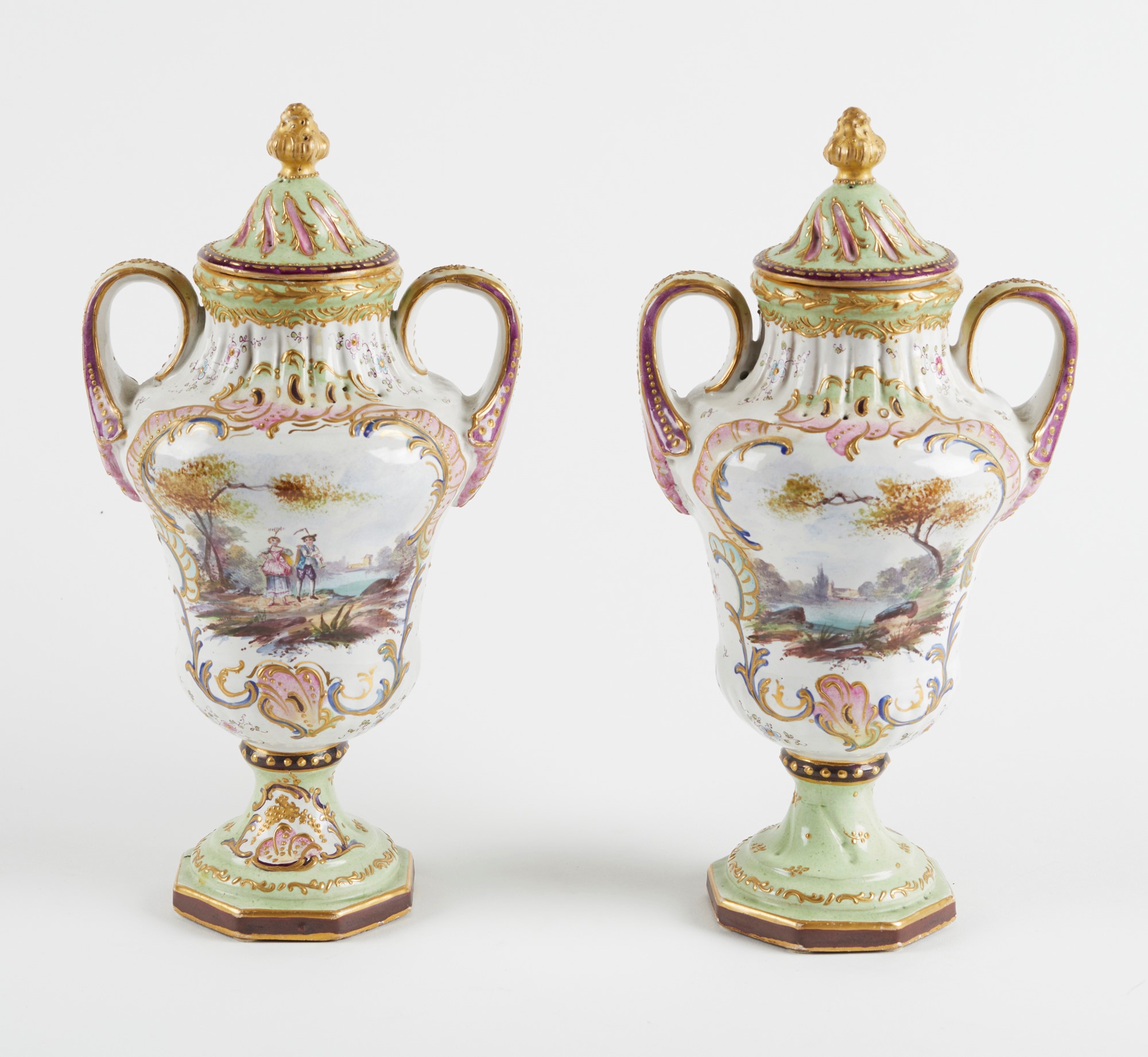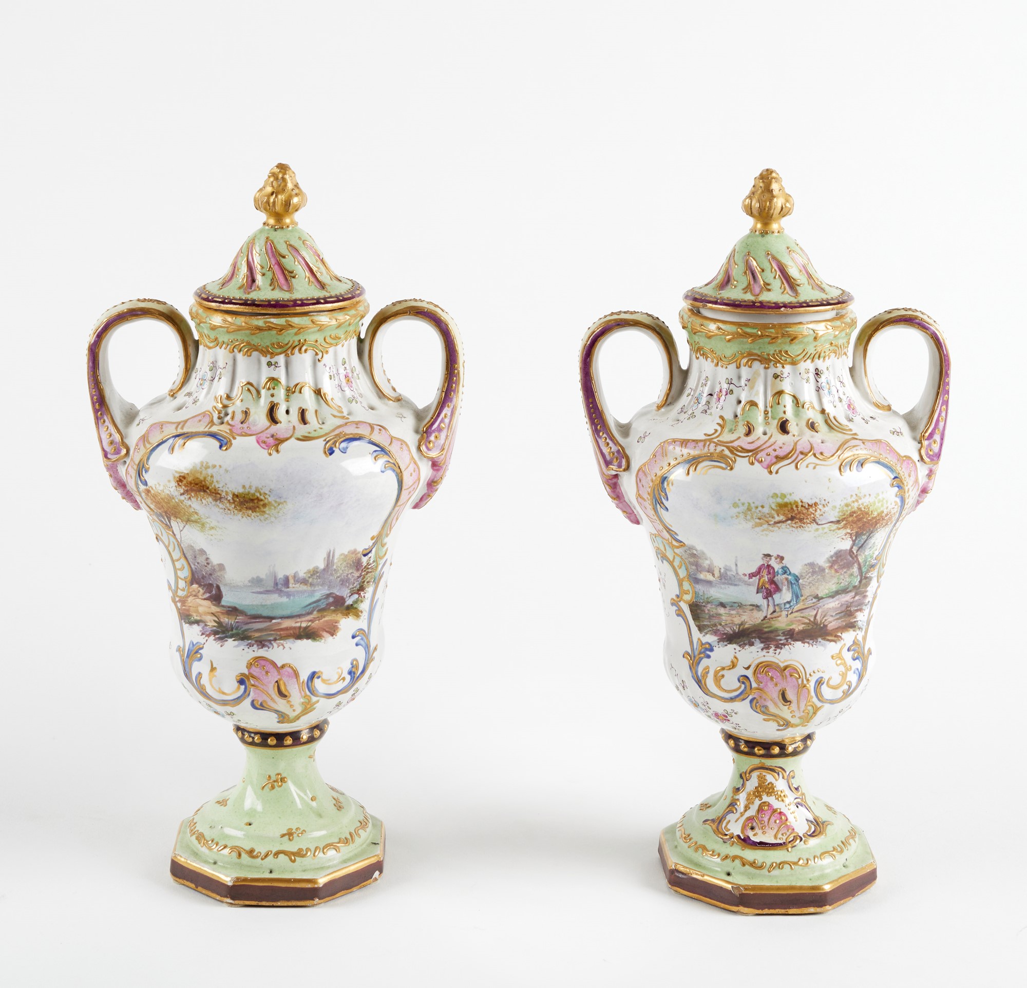 Coppia di vasi in ceramica policroma, dipinta con scene settecentesche e decori oro a rilievo. XX secolo. Cm 26x14x11. Sotto la base recano marchio. (lievi difetti)