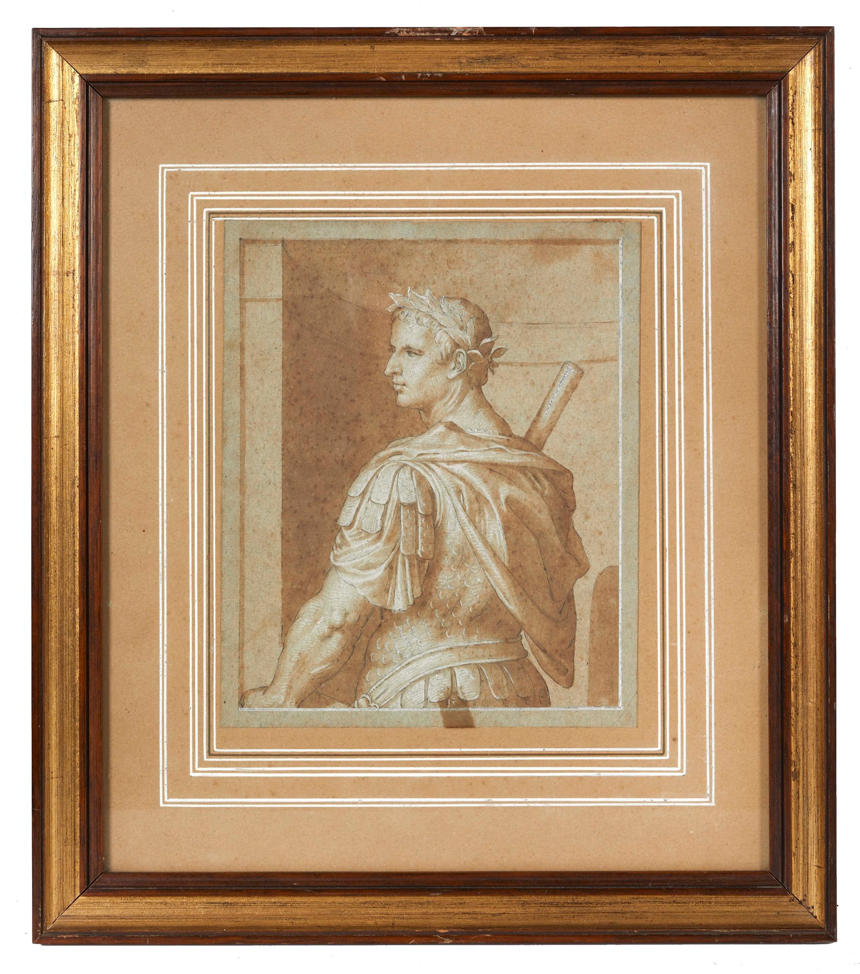 Maestro veneto del XVII secolo. "Ritratto dell'imperatore Tiberio". China acquerellata e biacca su carta. Cm 21x17.
