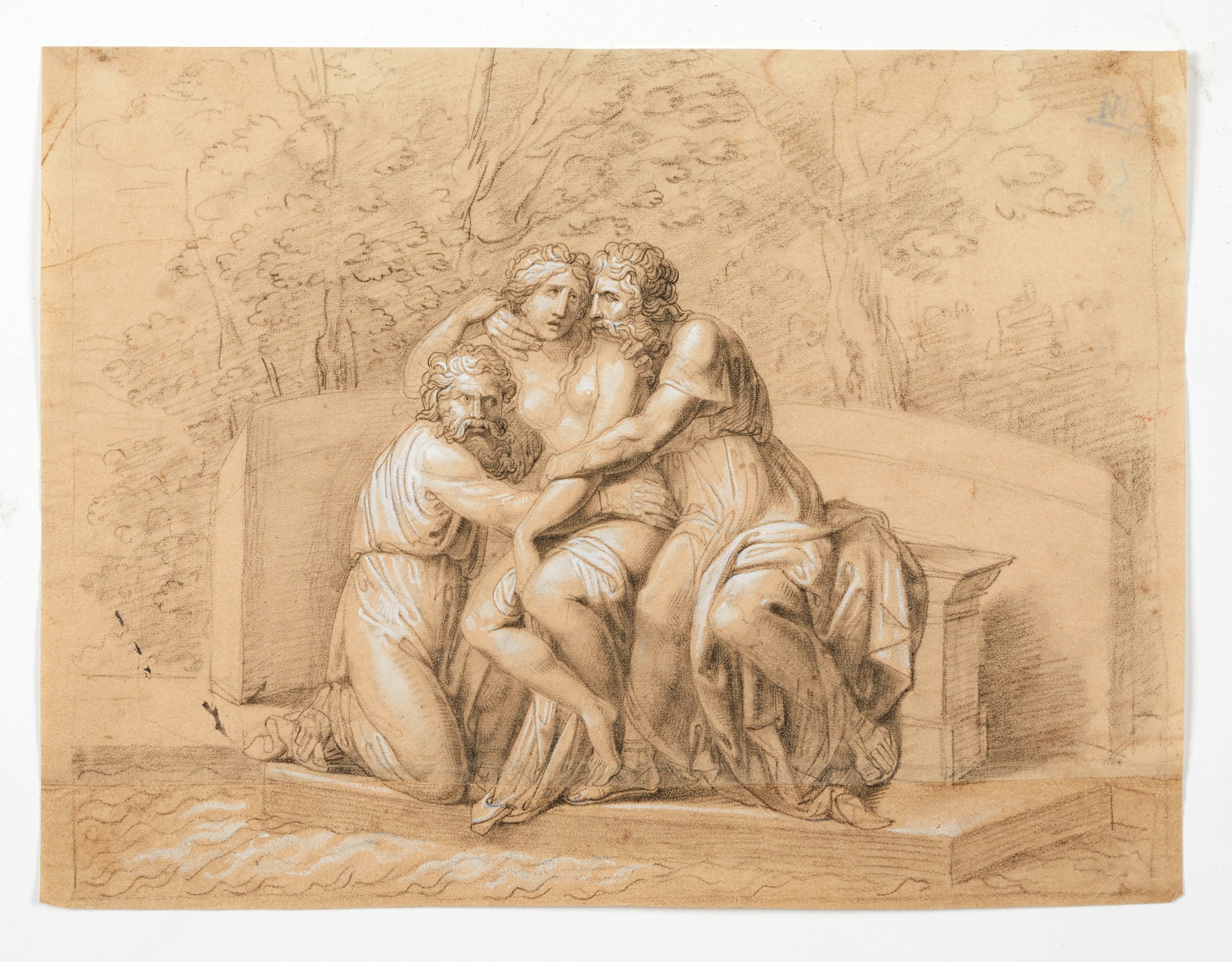 Maestro degli inizi del XIX secolo. "Studio di un gruppo scultoreo su paesaggio". Matita su carta. Cm 23x30,5