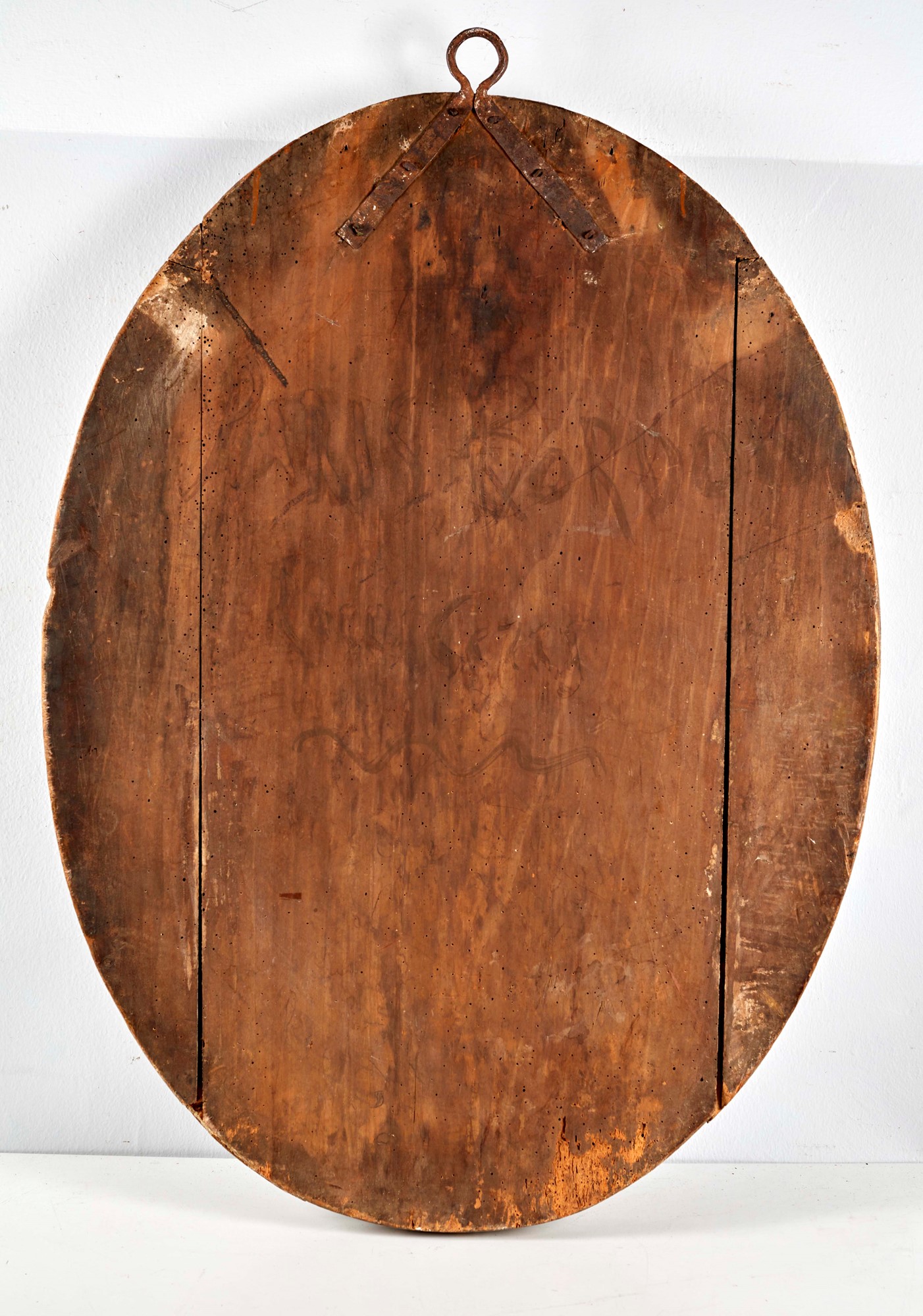 Maestro degli inizi del XVIII secolo. "Madonna in trono con i Santi Pietro e Rocco". Olio su tavola ovale. Cm 86x58.