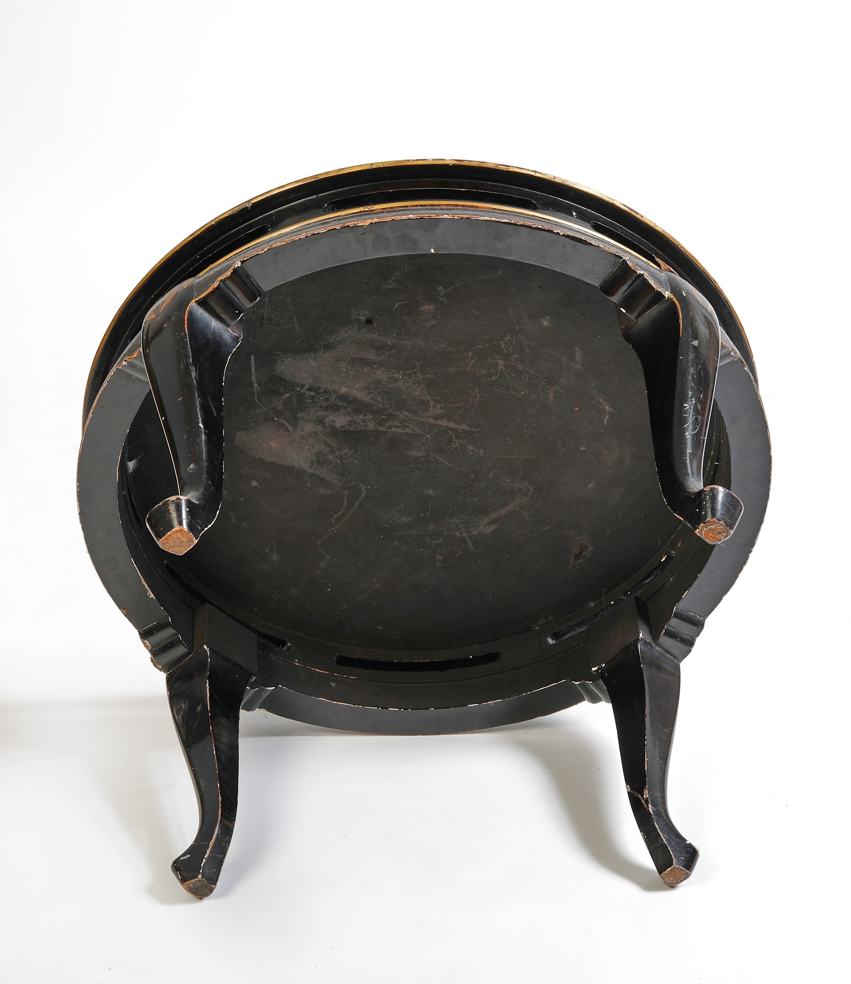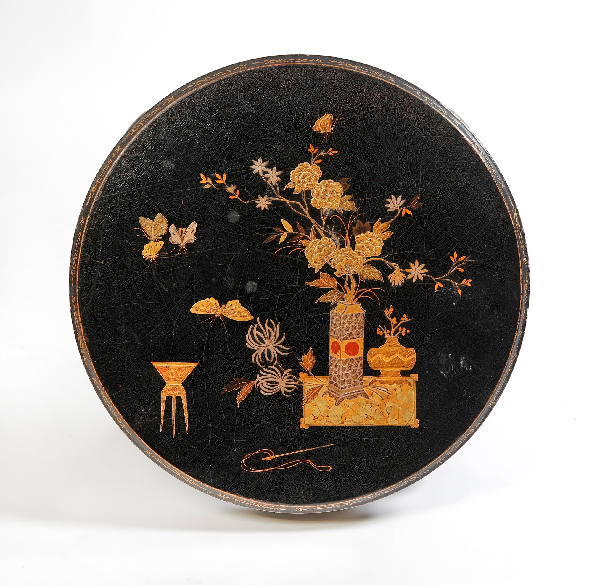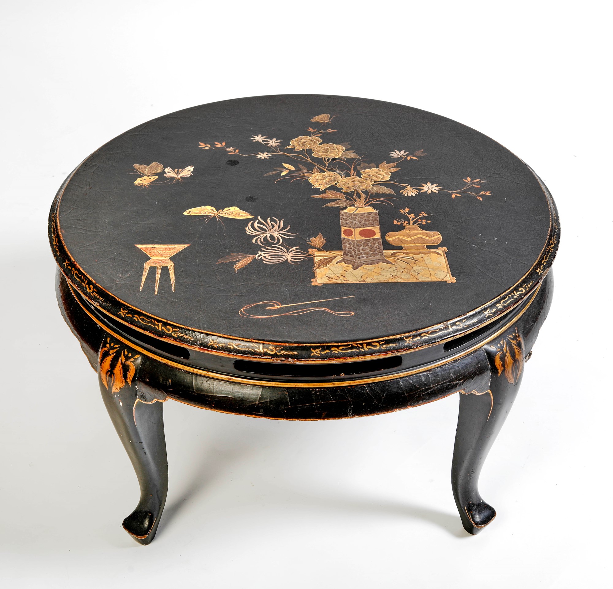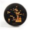 Tavolino in stile orientale in legno dipinto nero e a decori ornamentali. Metà del XX secolo. Cm 43x72.