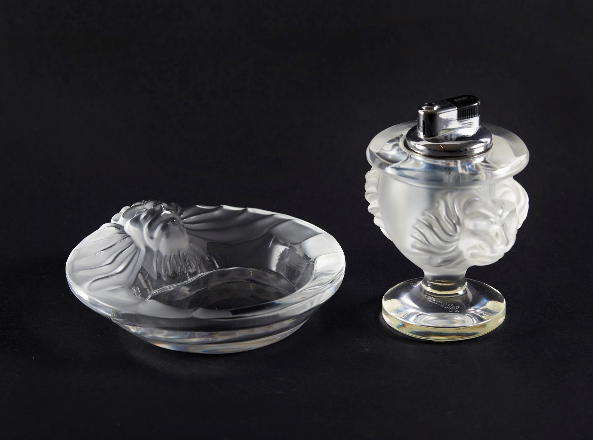 LALIQUE Set posacenere e accendino con testa di leone. 1970 circa, Francia. Rispettivamente cm 5x15;12x9,5. Entrambi gli oggetti recano firma a punta di diamante Lalique France.