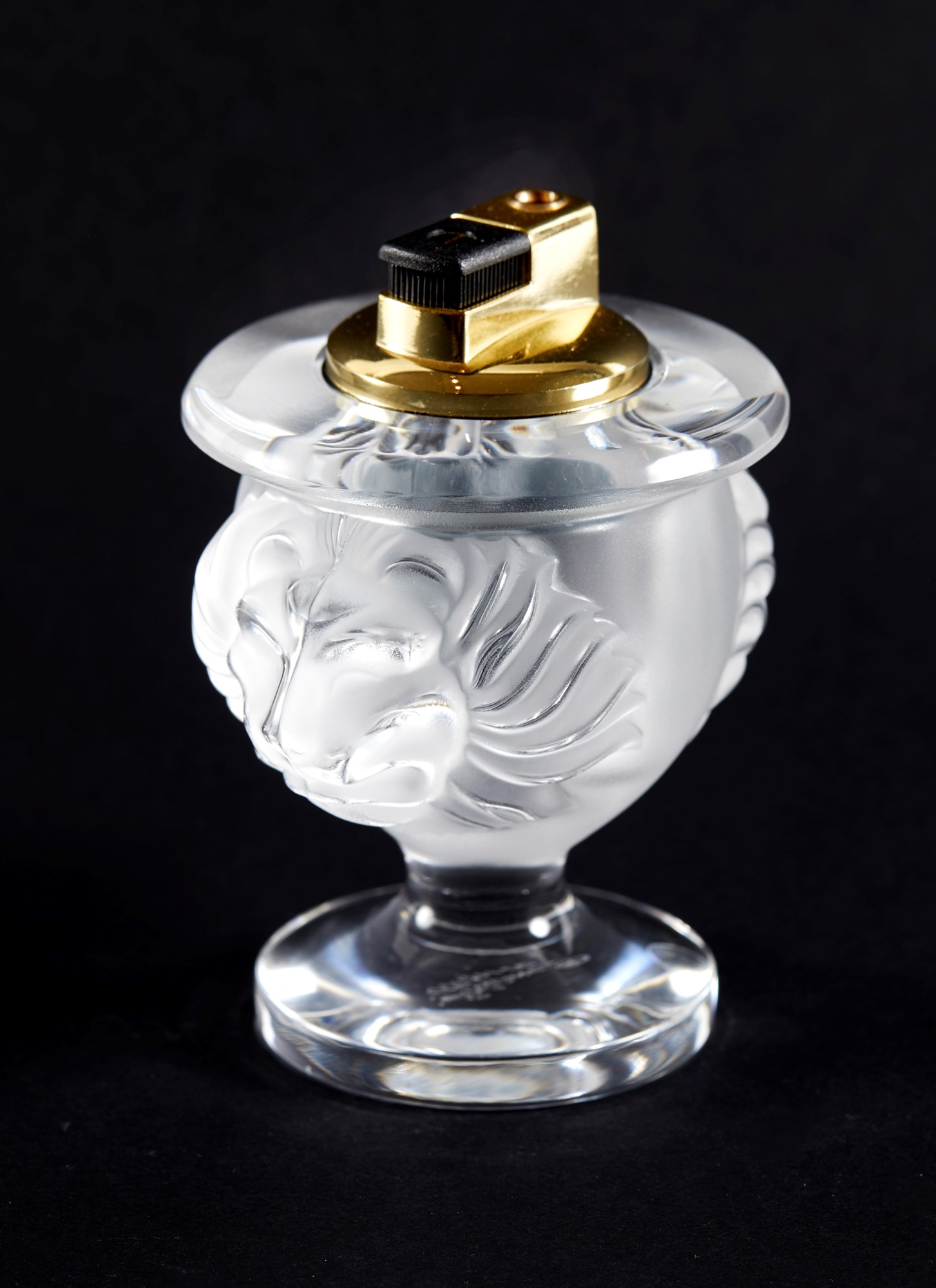 LALIQUE Accendino in vetro satinato con teste di leone. 1970 circa, Francia. Cm 12x9,5. Reca sulla la base firma a punta di diamante Lalique Francia.