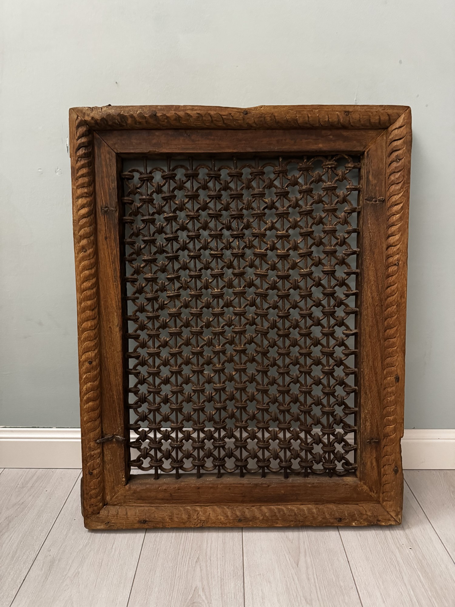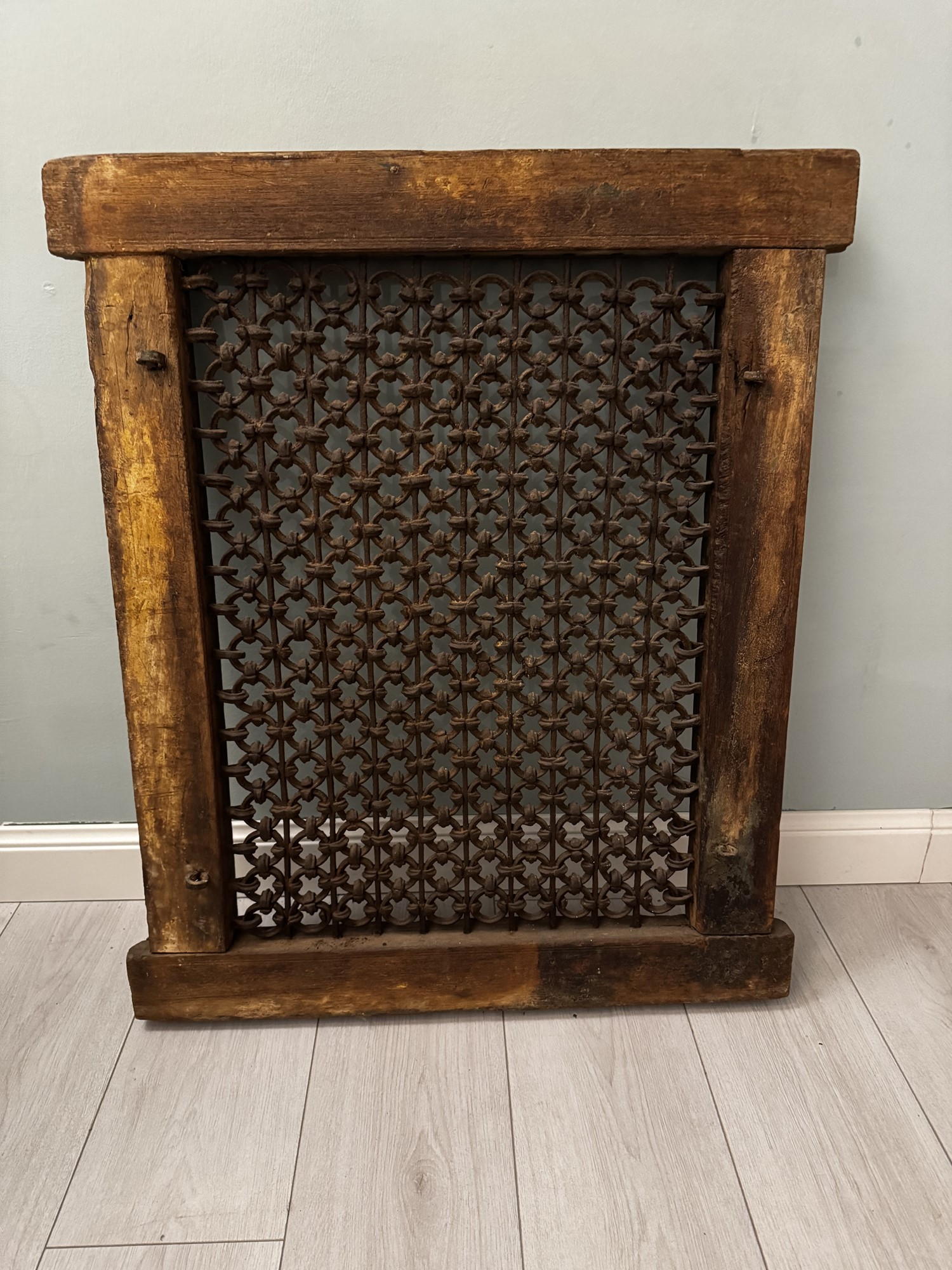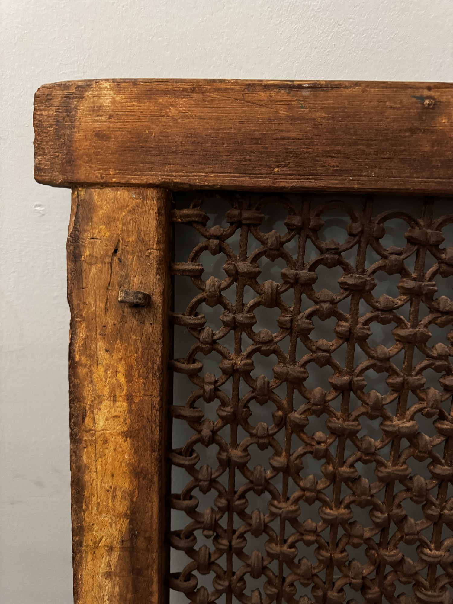 Antica finestra in legno massello e grata in ferro battuto. XIX secolo. Cm 82x68x7,5.