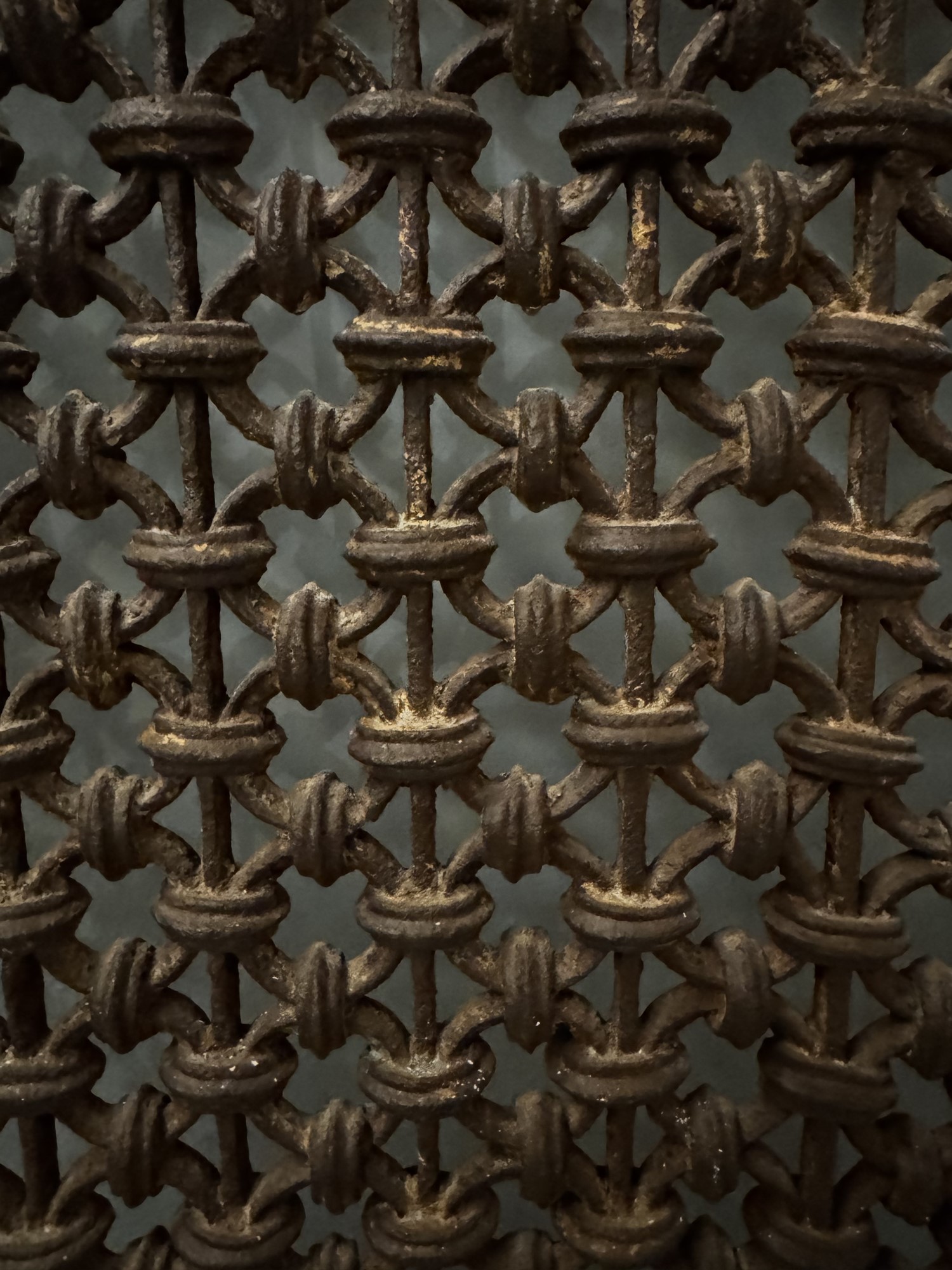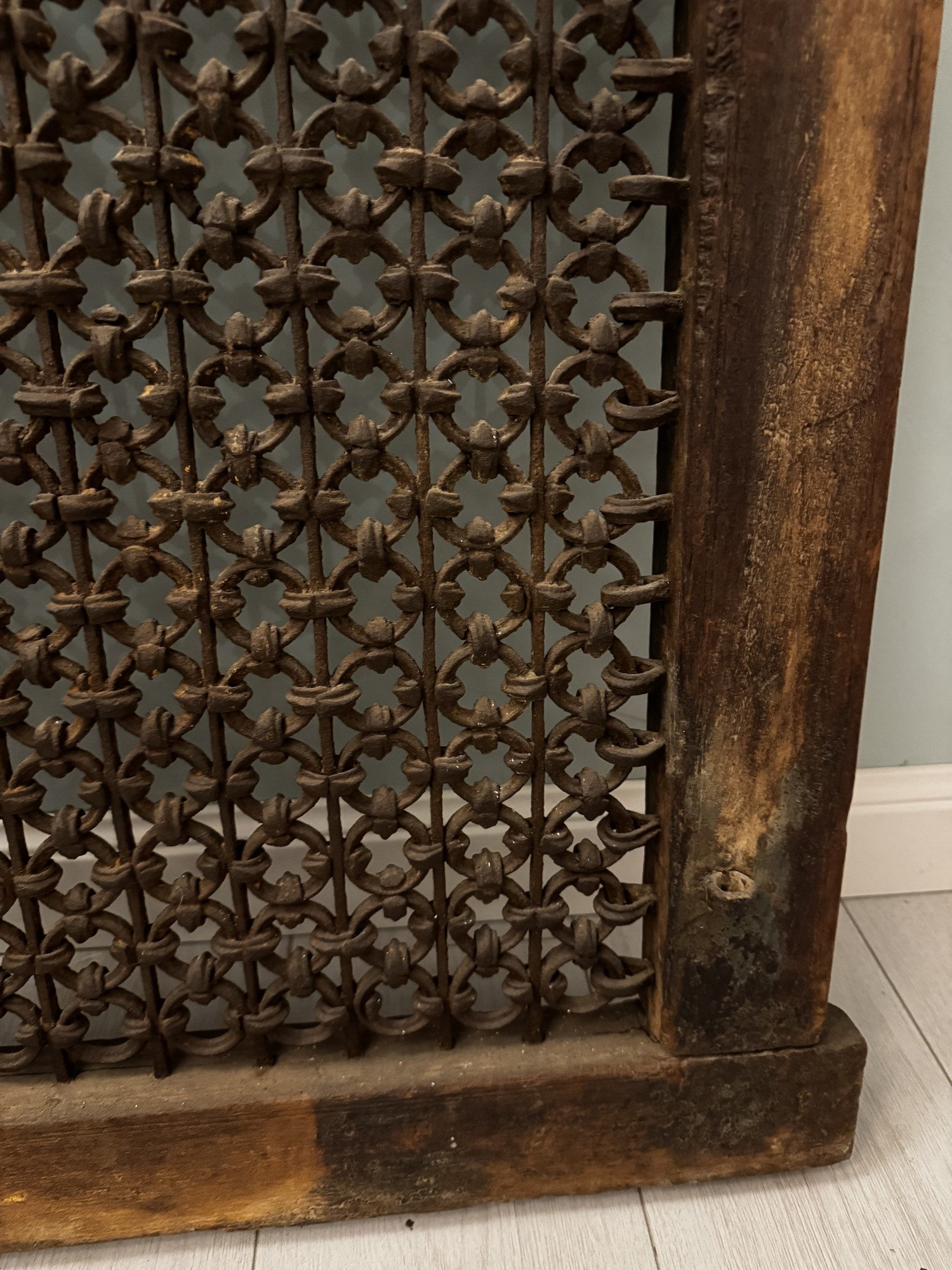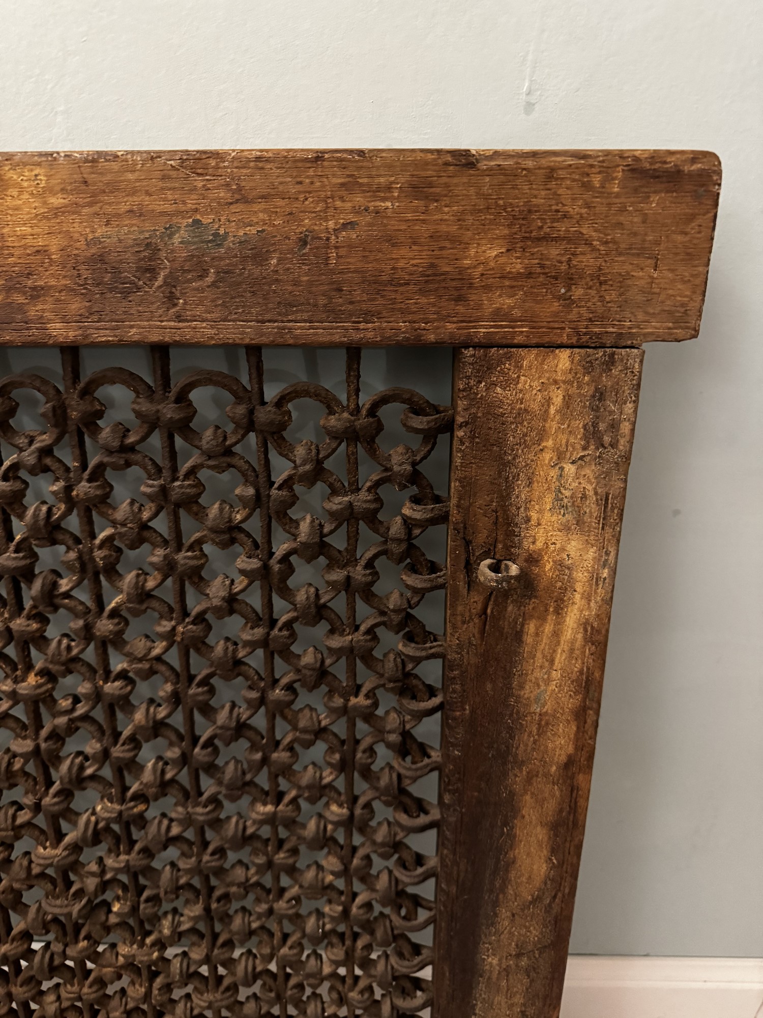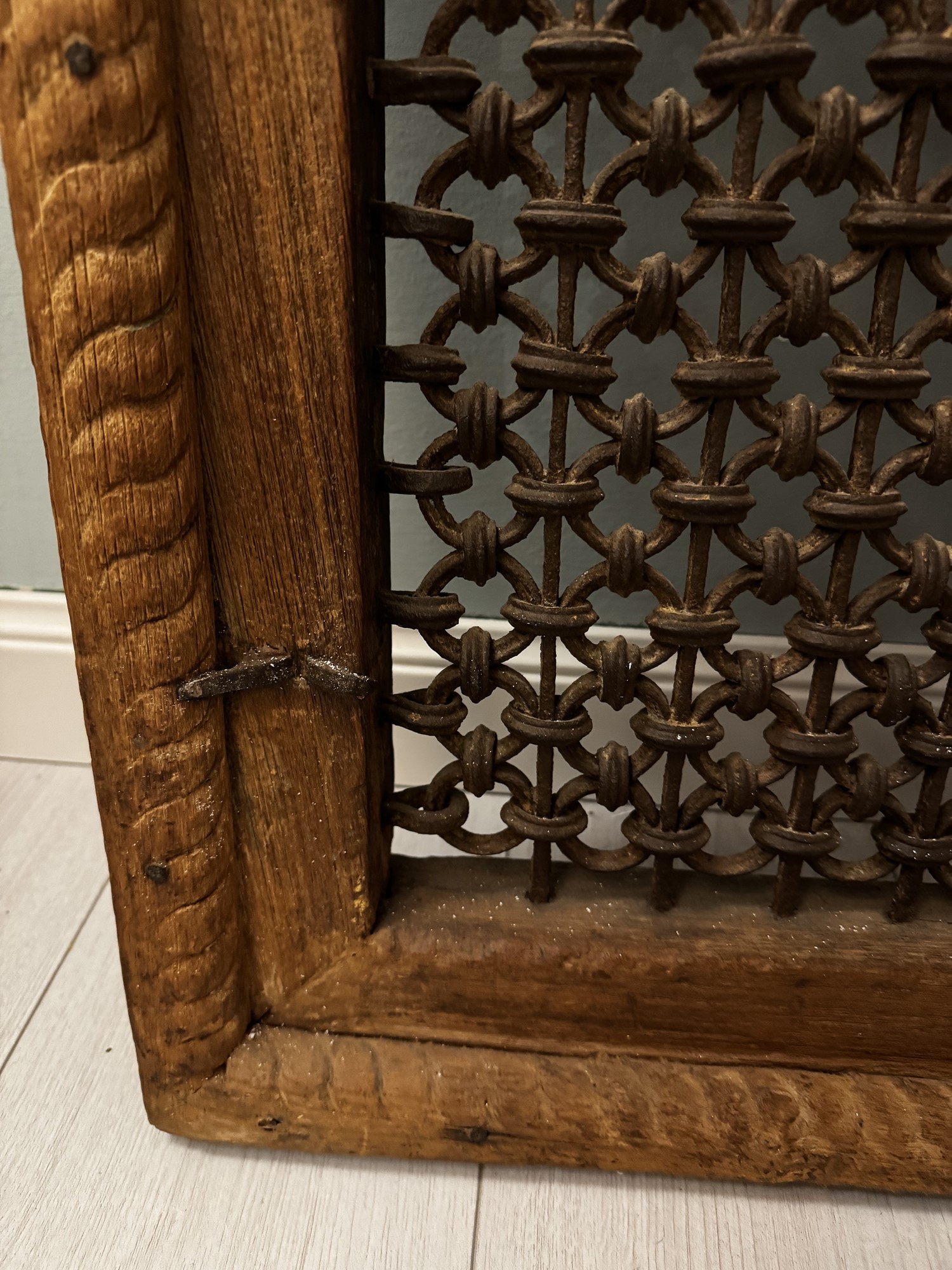 Antica finestra in legno massello e grata in ferro battuto. XIX secolo. Cm 82x68x7,5.