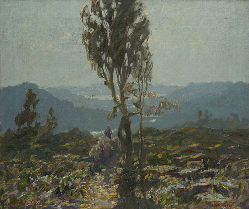 Carlo Prada (Milano 1884 - Santa Margherita Ligure 1960) - "Paesaggio con lago sullo sfondo" 18-XII-1922 olio su tela (cm 80x95) Firmato e datato in basso a destra; dedicato all'amico Giorgio in basso a sinistra In cornice