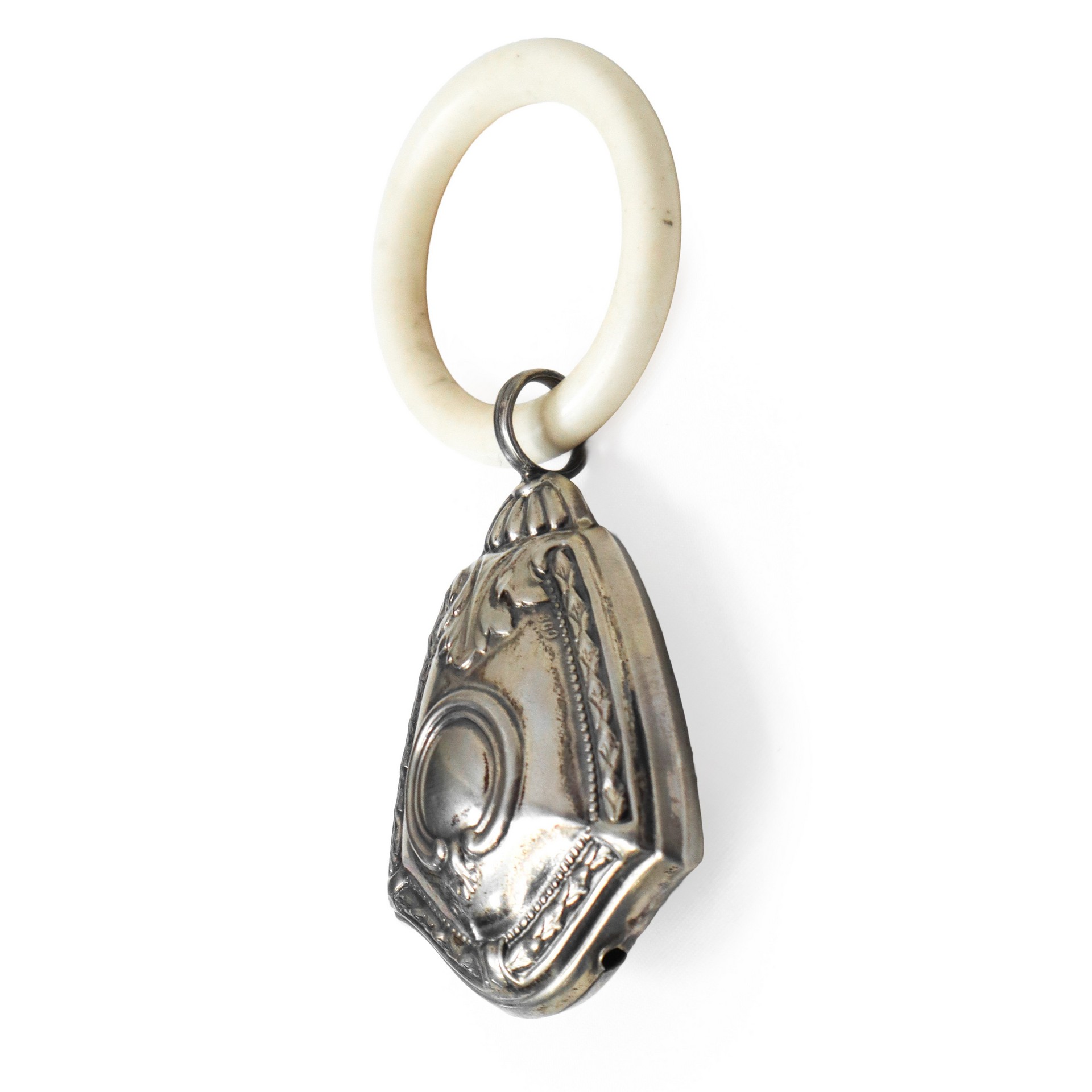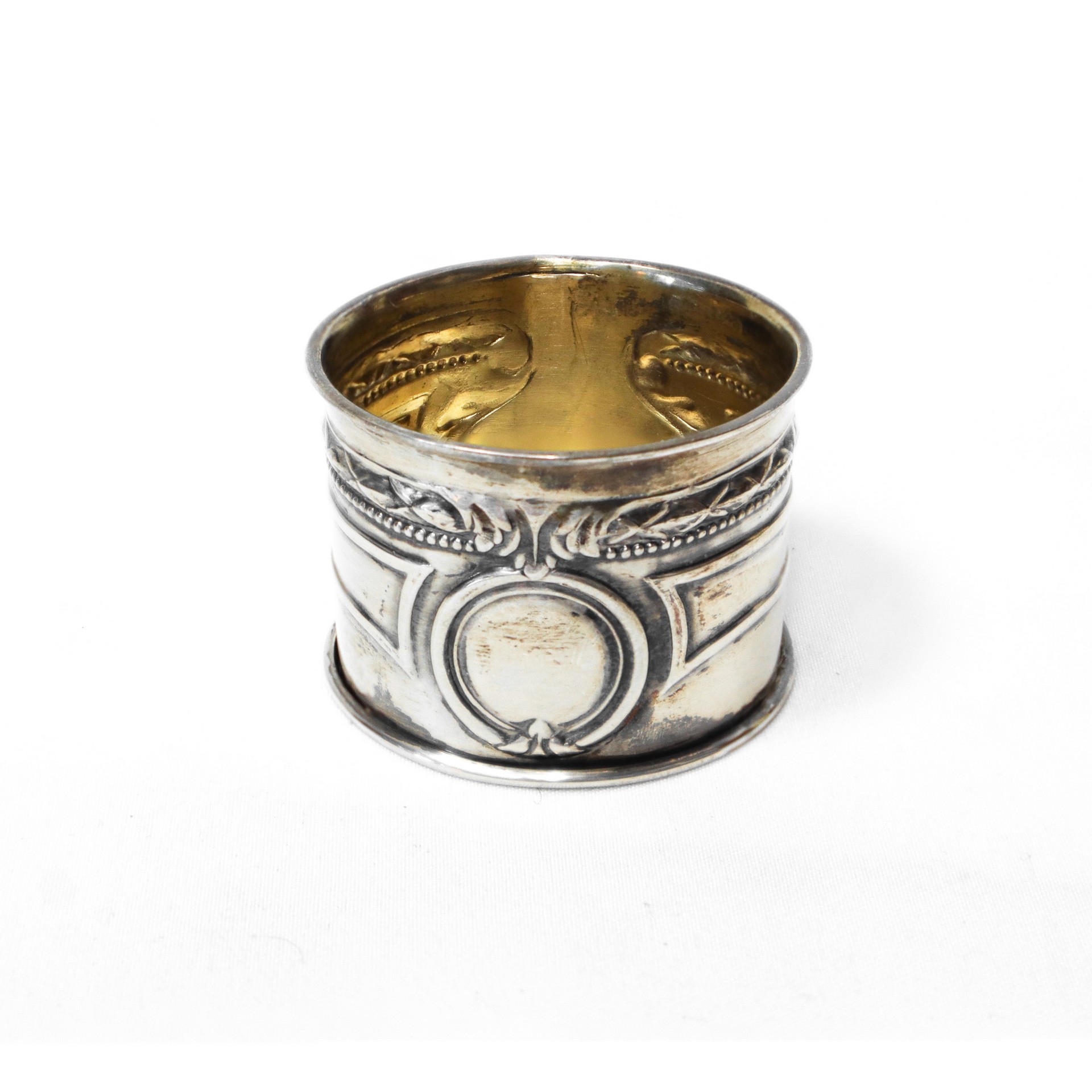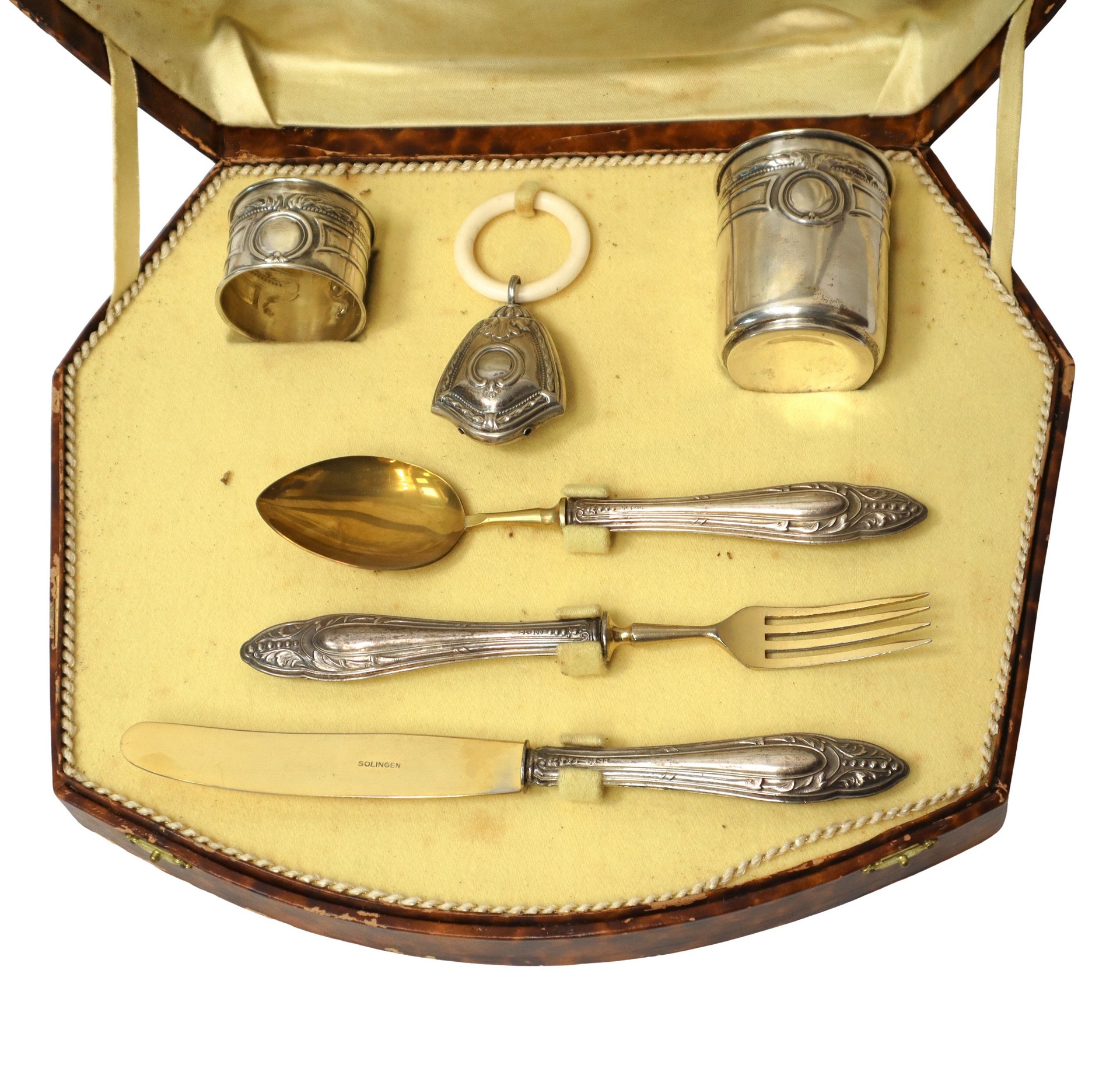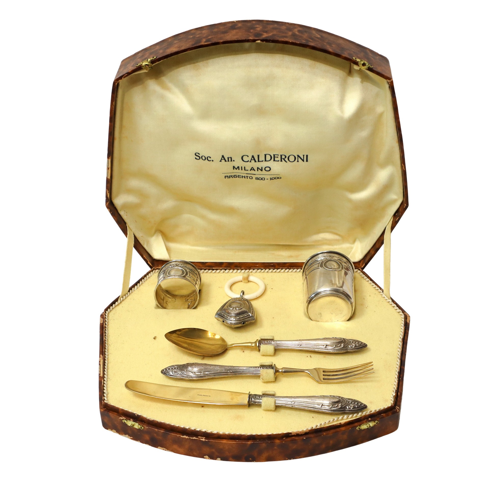 Società Anonima Calderoni Milano - Set da Battesimo in argento 800 peso argento gr. 50 Set composto da: cucchiaio, forchetta, coltello, portatovagliolo, sonaglio e bicchiere.