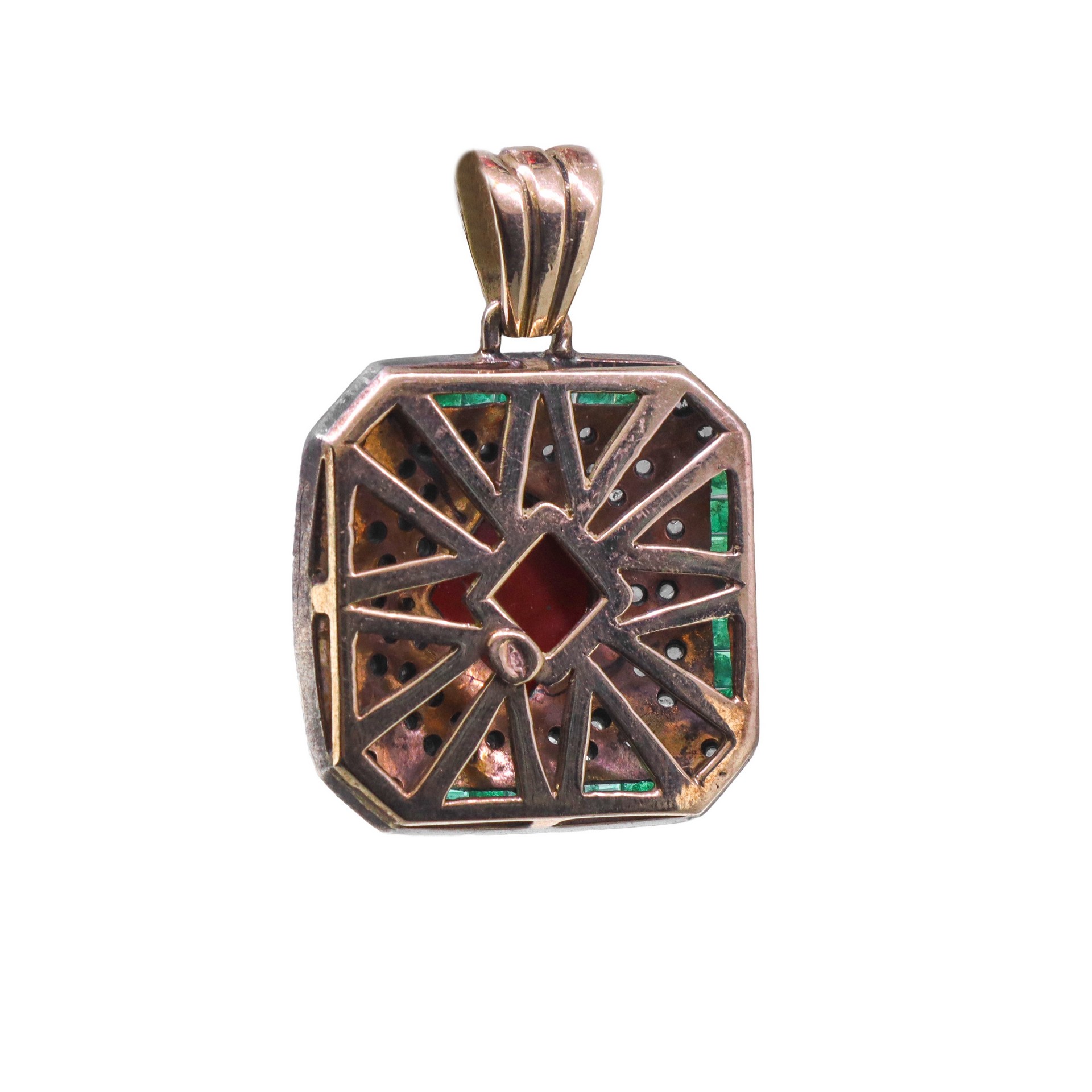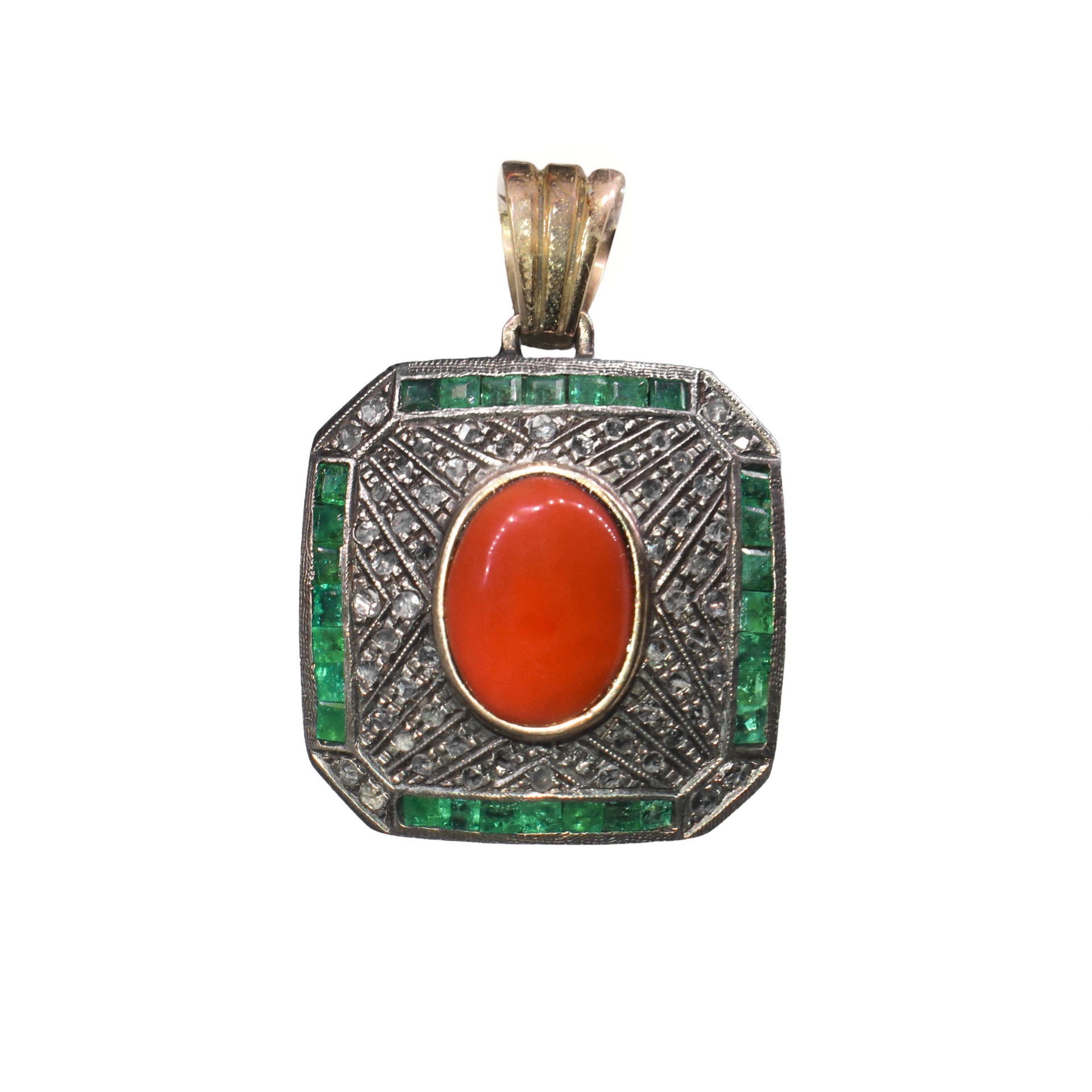 Ciondolo in oro bianco a basso titolo e argento con diamanti taglio antico, corallo giapponese e smeraldi Gr 25, cm 3x3
