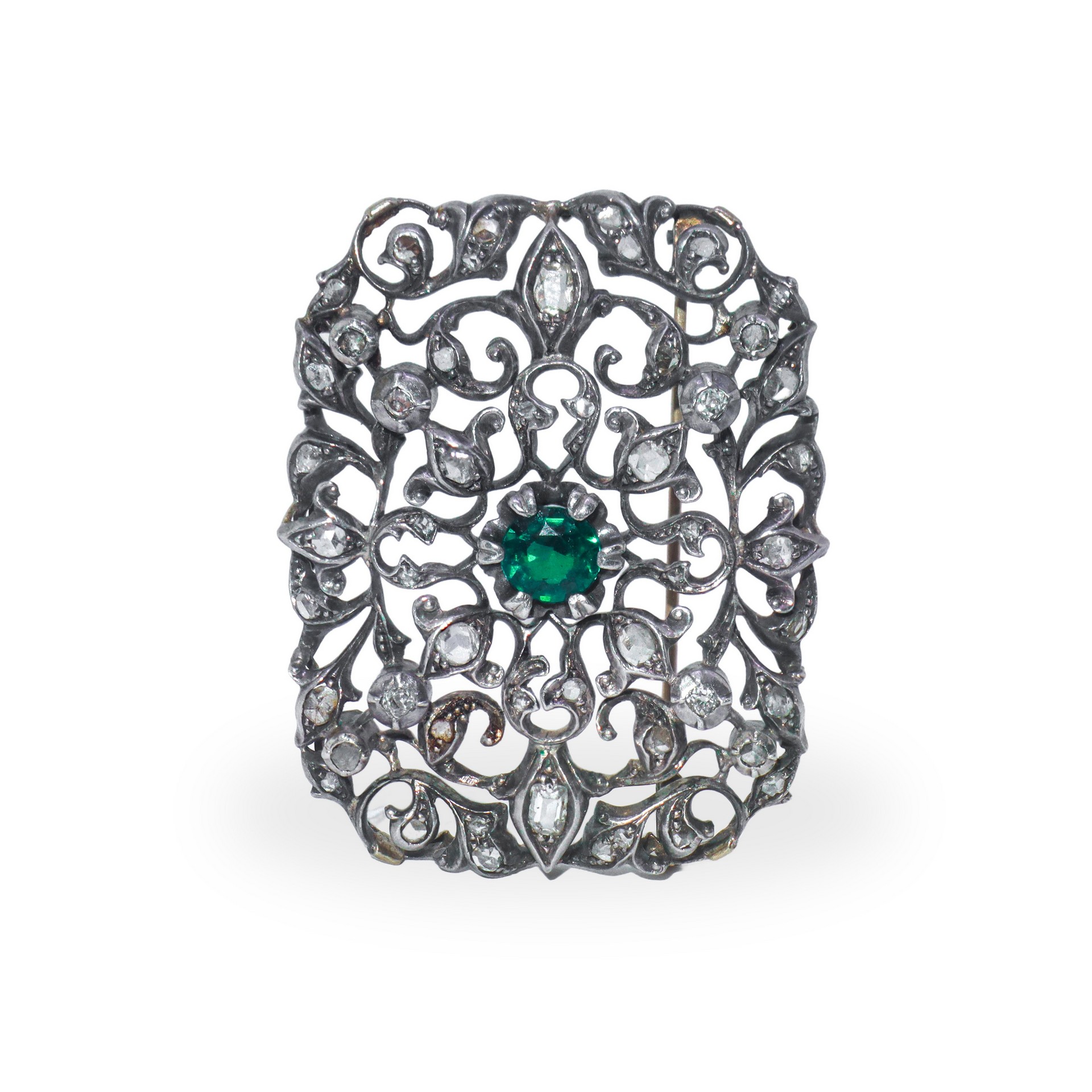 Spilla in oro e argento, con diamanti taglio brillante varie forme e pietra centrale