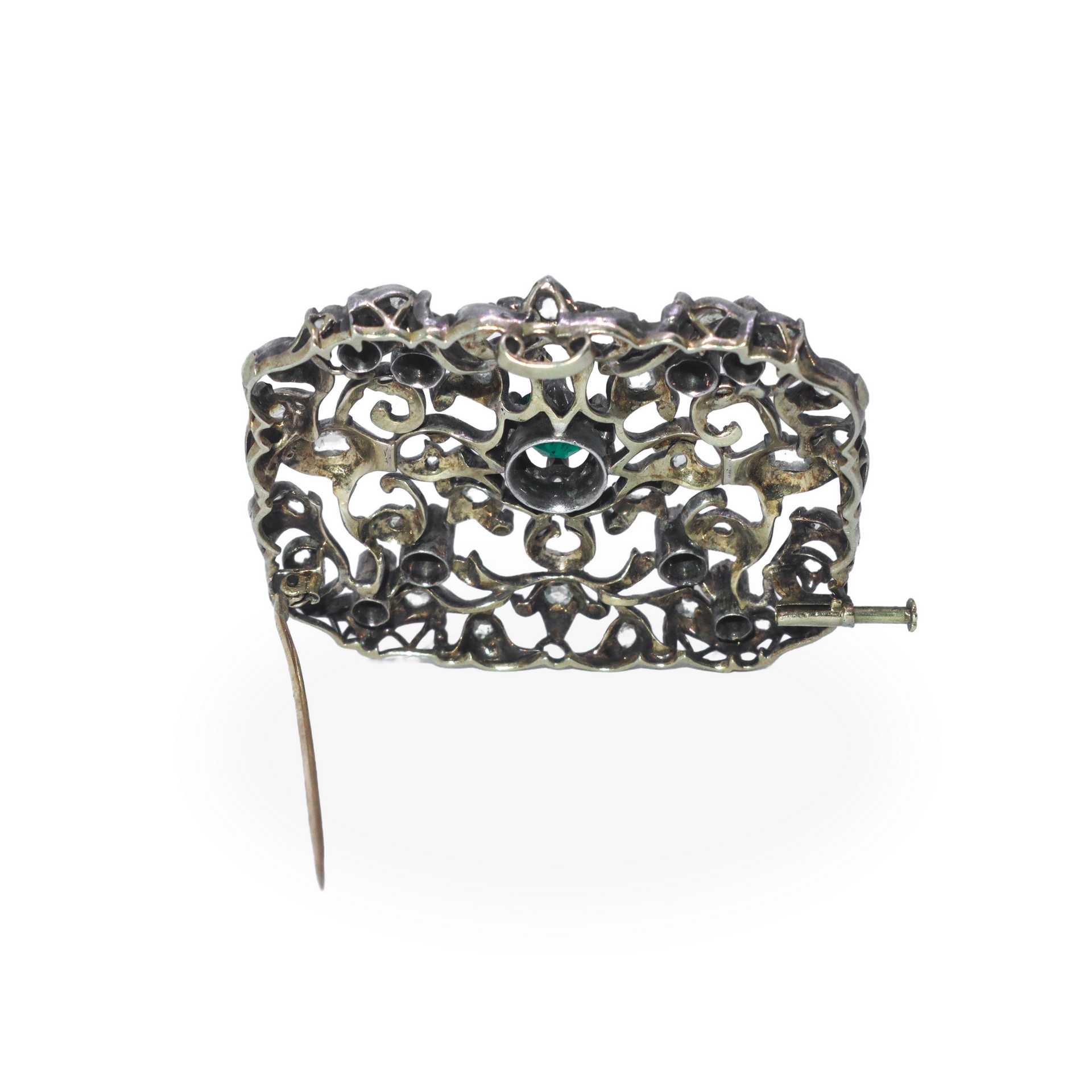 Spilla in oro e argento, con diamanti taglio brillante varie forme e pietra centrale Gr 21,4