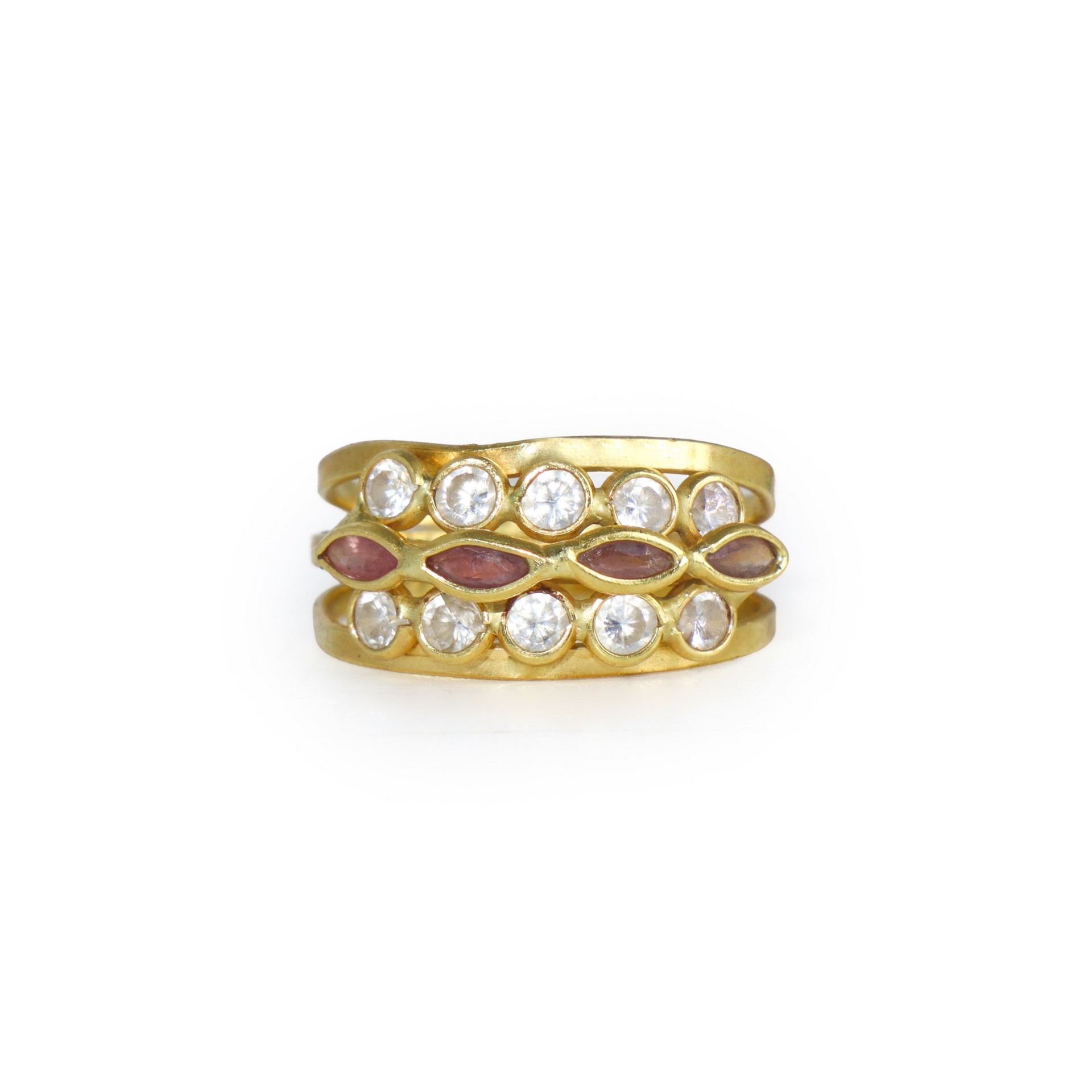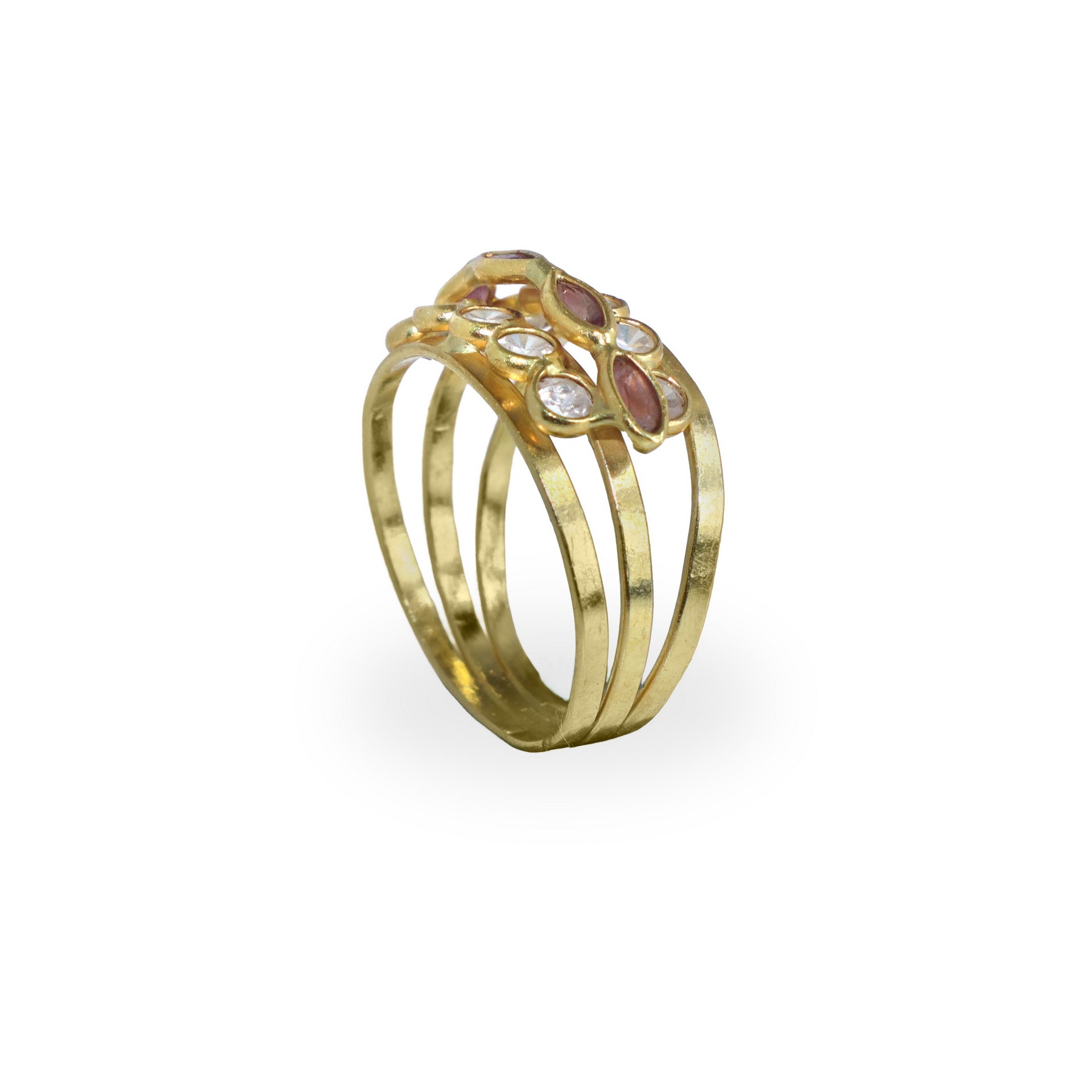 Anello in oro giallo 750 con diamanti e tormaline rosa sul fronte