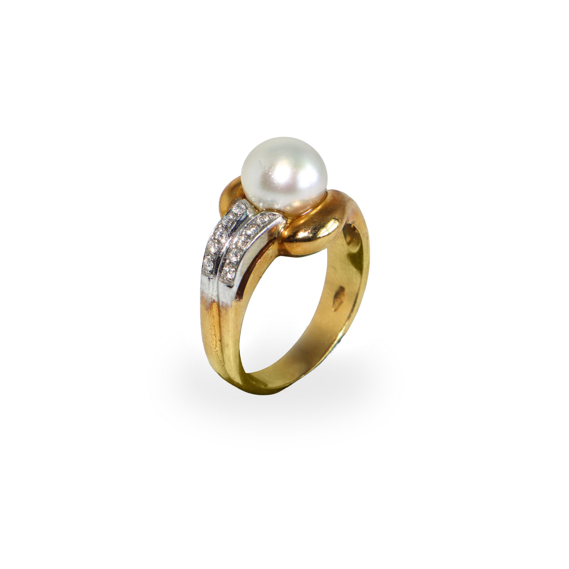 Anello in oro giallo e bianco 750 con perla e diamanti taglio brillante Gr 7.1