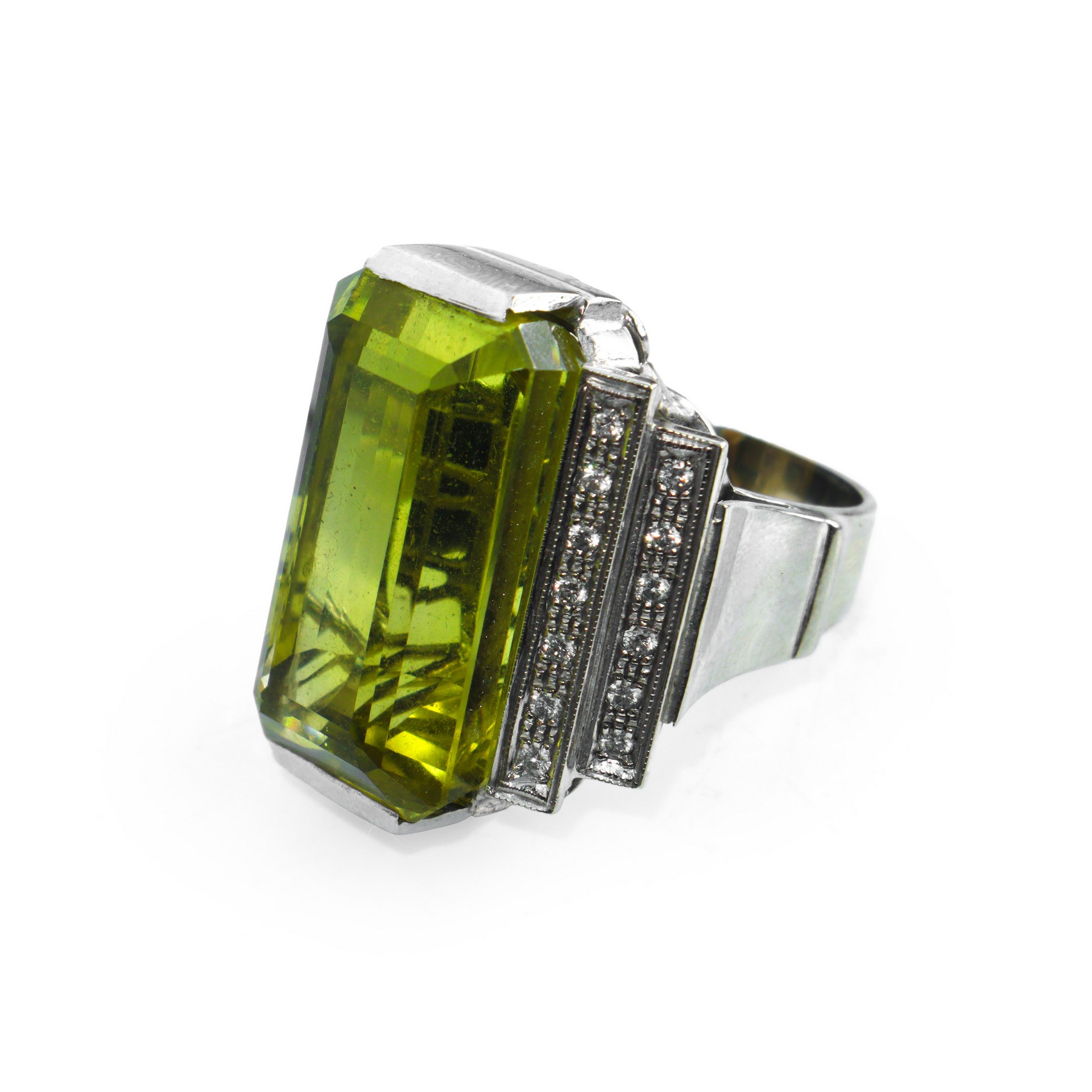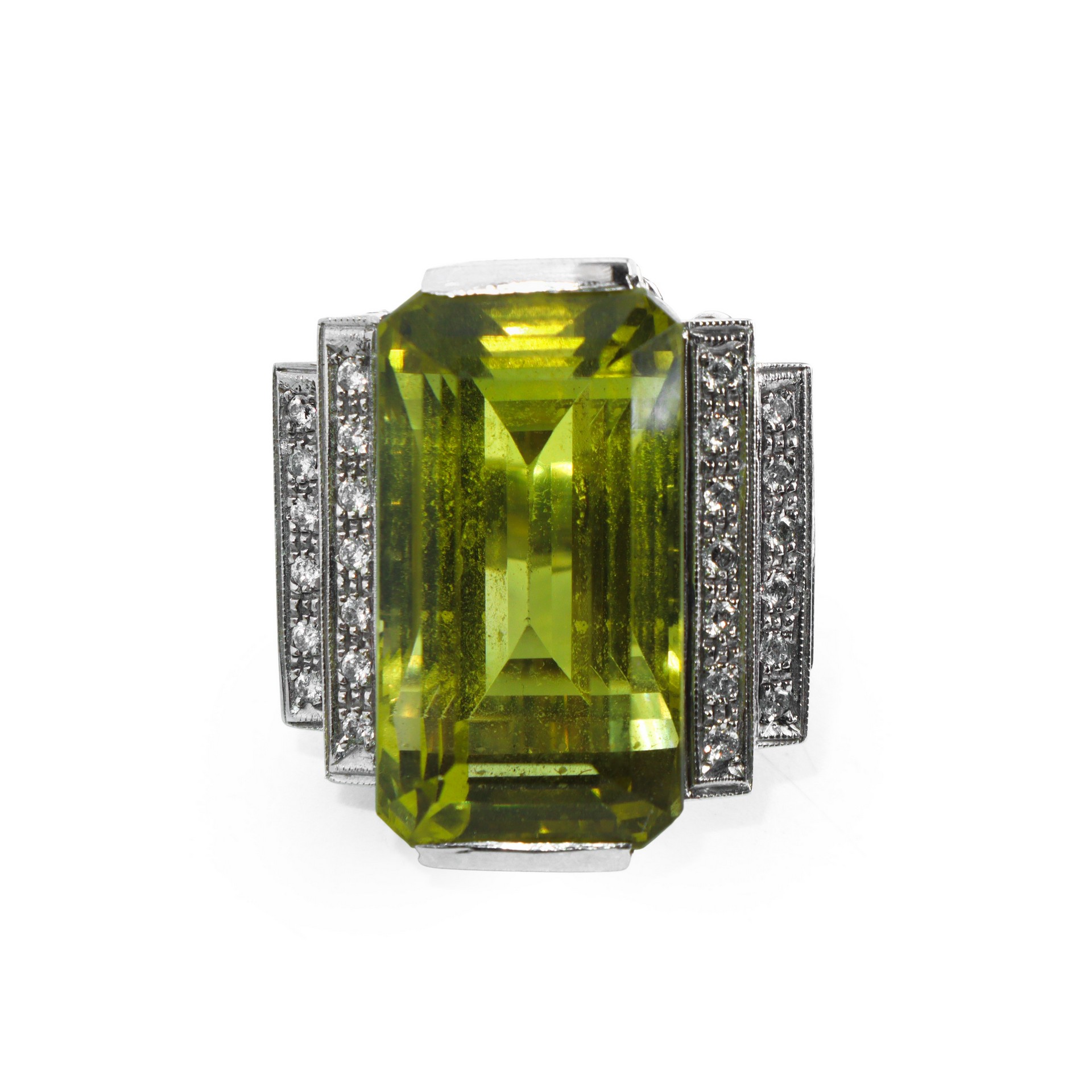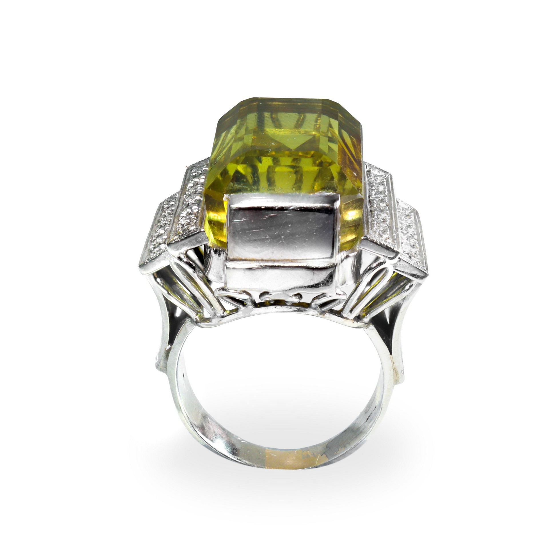 Anello da cocktail in oro bianco con corindone centrale affiancato da una doppia fila di brillanti per lato mis. 20 gr. (complessivi) 26,2