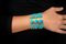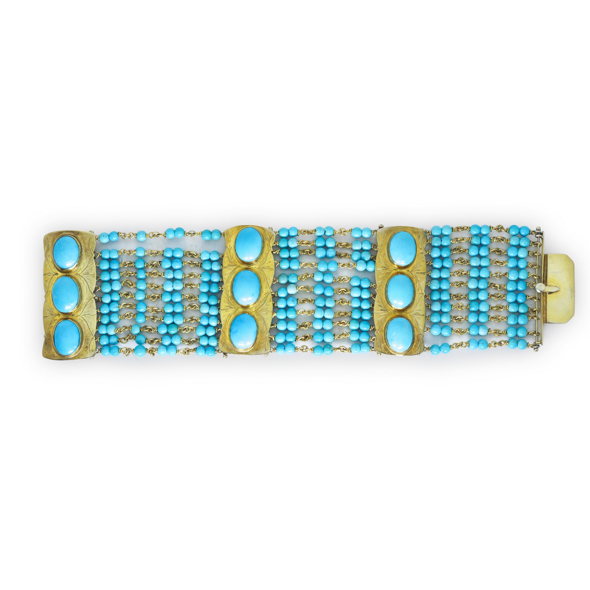 Bracciale in argento 925 a fascia con 11 fili con grani di turchesi intervallati da tre bande con medaglioni in turchese e chiusura di sicurezza