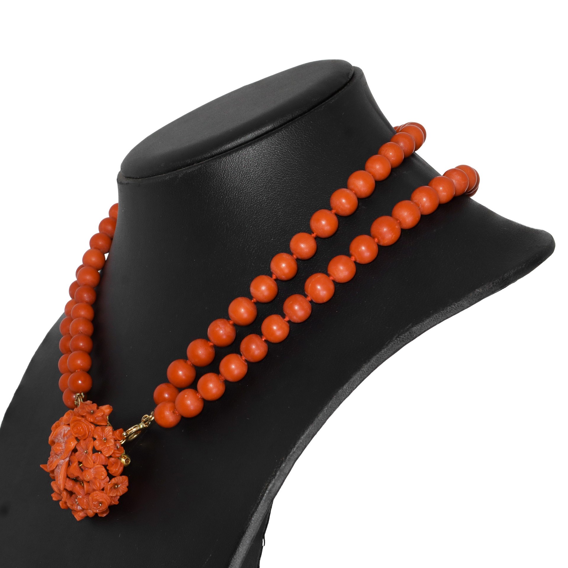 Lotto 168 | Collana a 2 fili di corallo Sardegna prima scelta e oro 750 con spilla centrale a fiori (separabile)