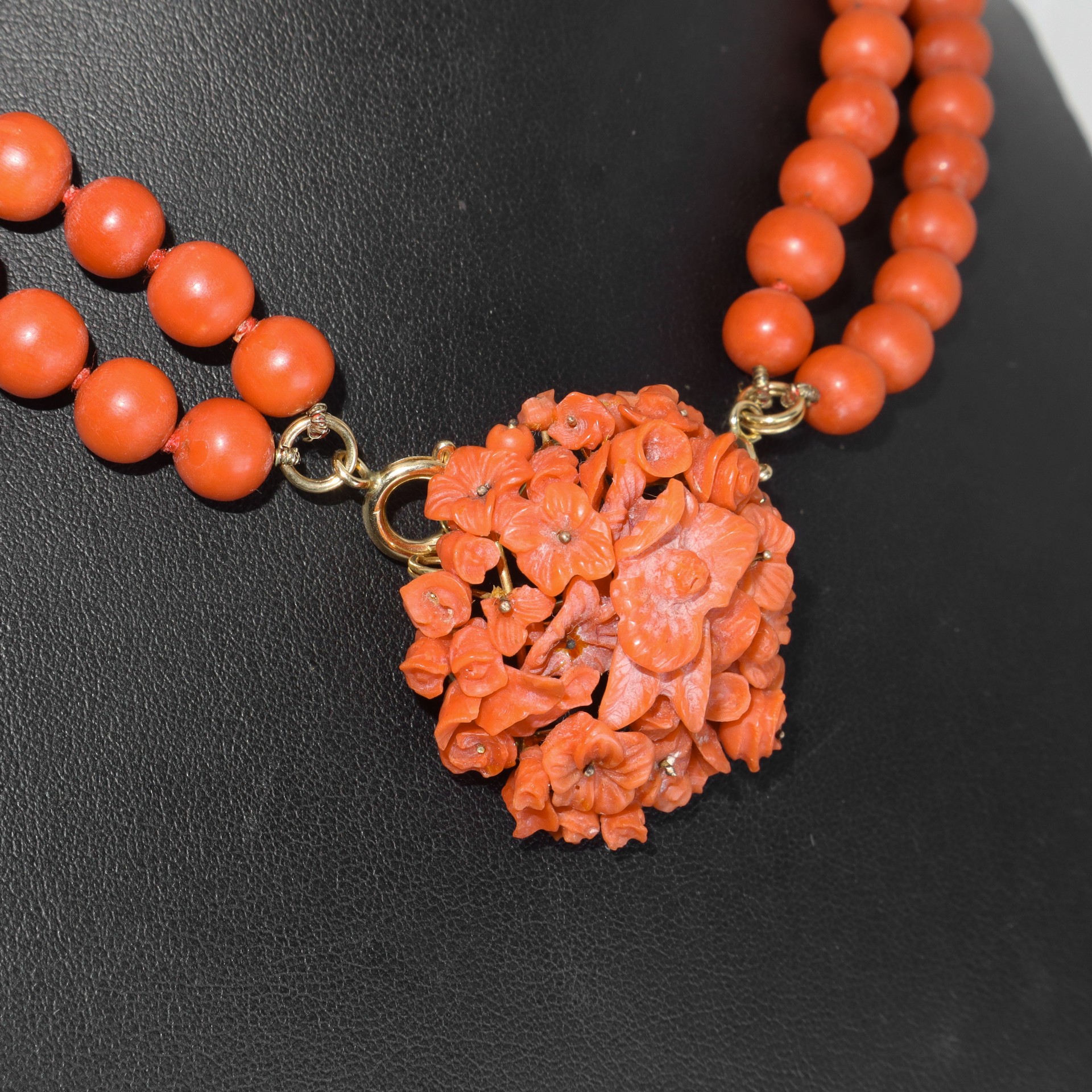 Collana a 2 fili di corallo Sardegna prima scelta e oro 750 con spilla centrale a fiori (separabile) Gr 108,2, lunga 50 (compreso di ciondolo)