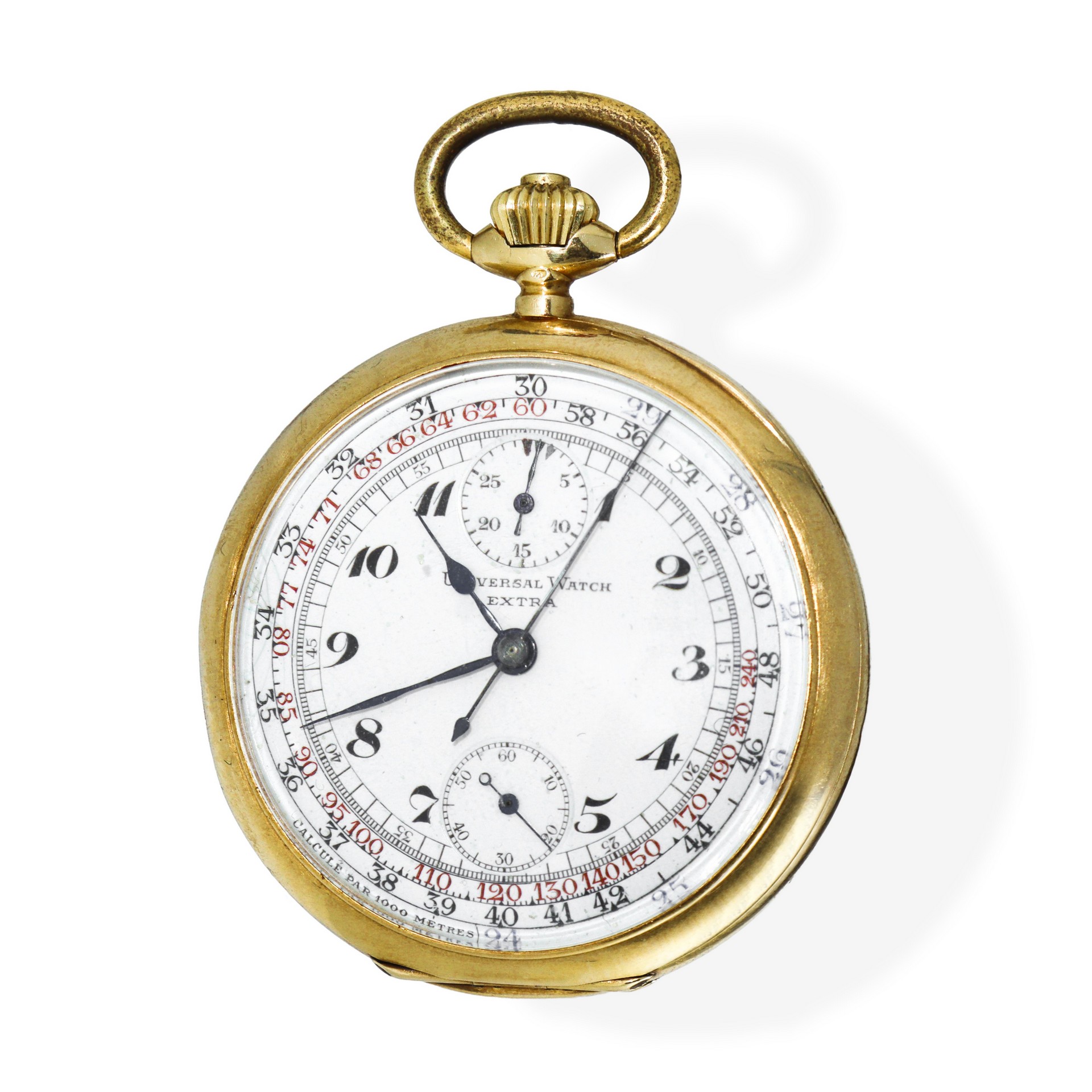 Lotto 208 | Universal Watch Extra - Orologio da tasca in oro 18 kt con numeri arabi in nero e contatore ausiliare dei secondi, 1920s/1930s