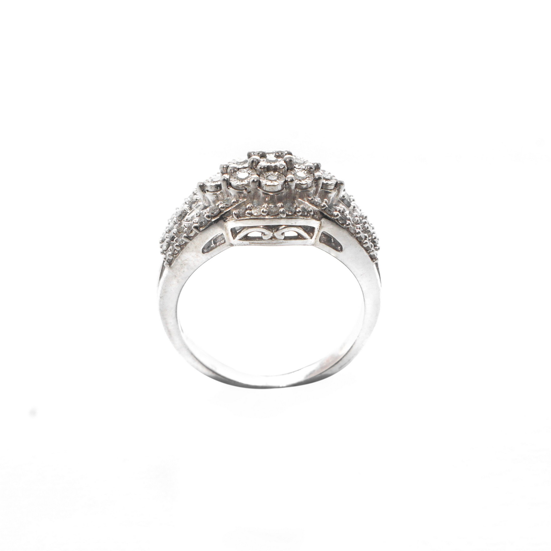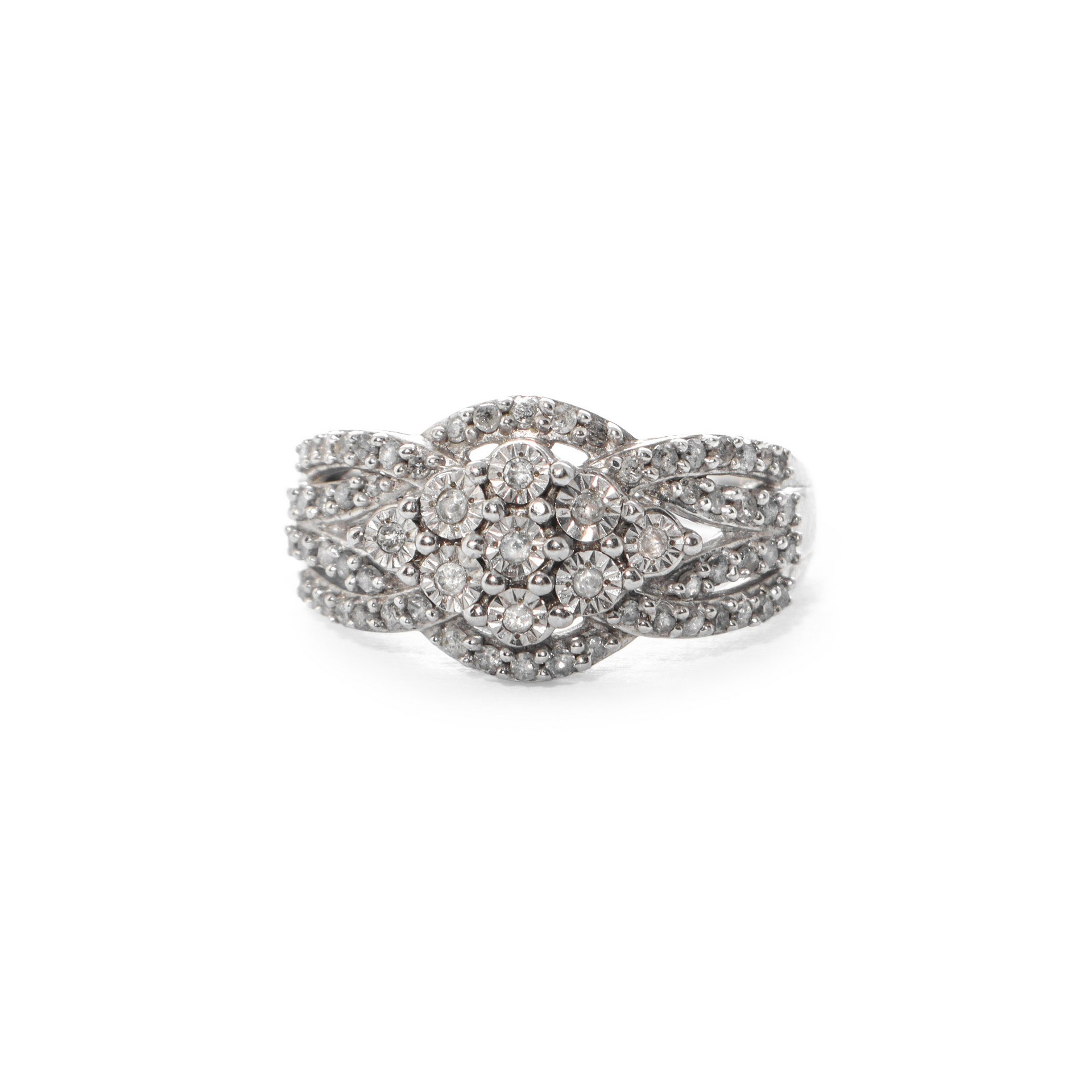 Anello a fascia intrecciata in argento 925 con diamanti naturali misura anello: 7,5 peso complessivo anello: 5,243 gr. caratura diamanti: 0,50 Anello dotato di certificato gemmologico di autenticità
