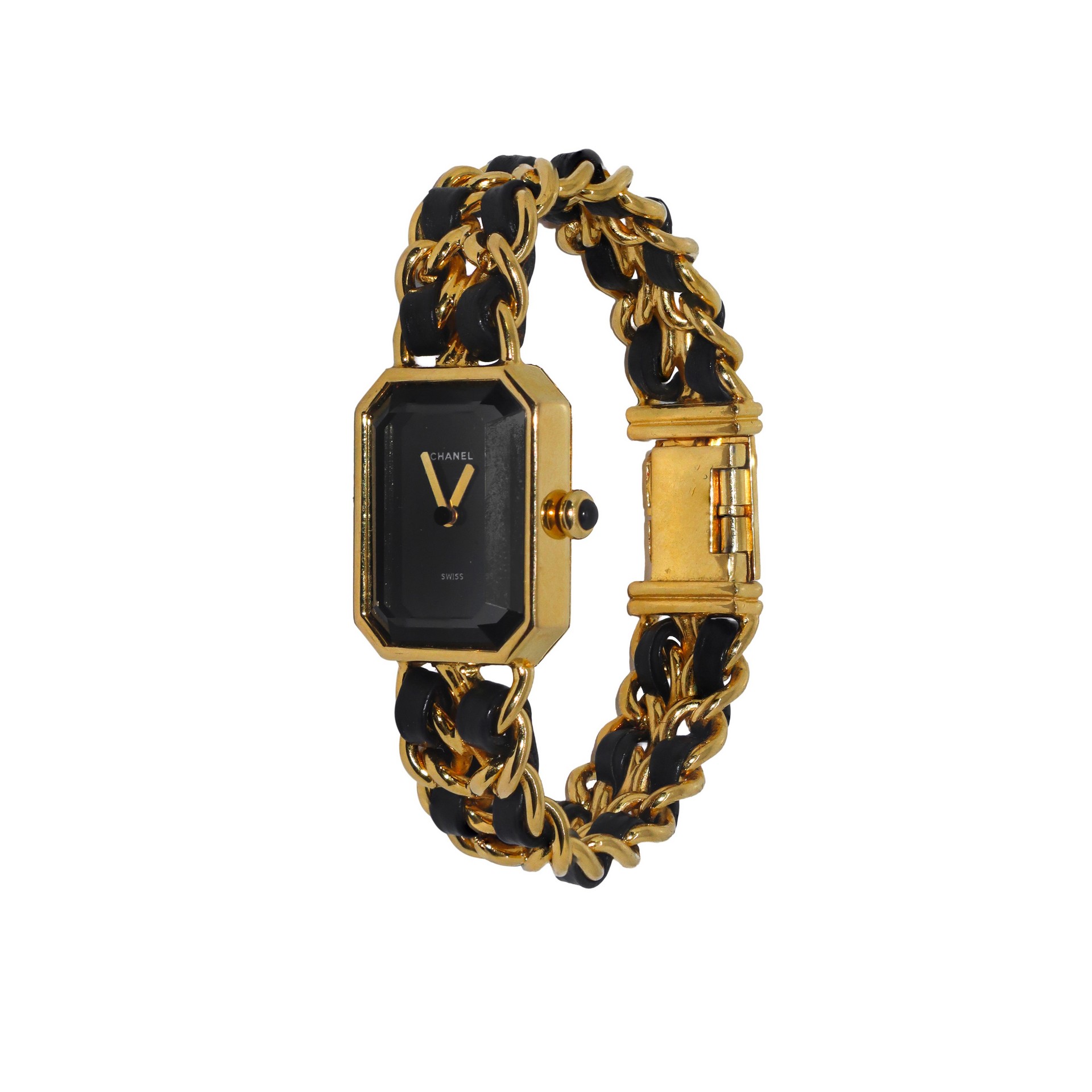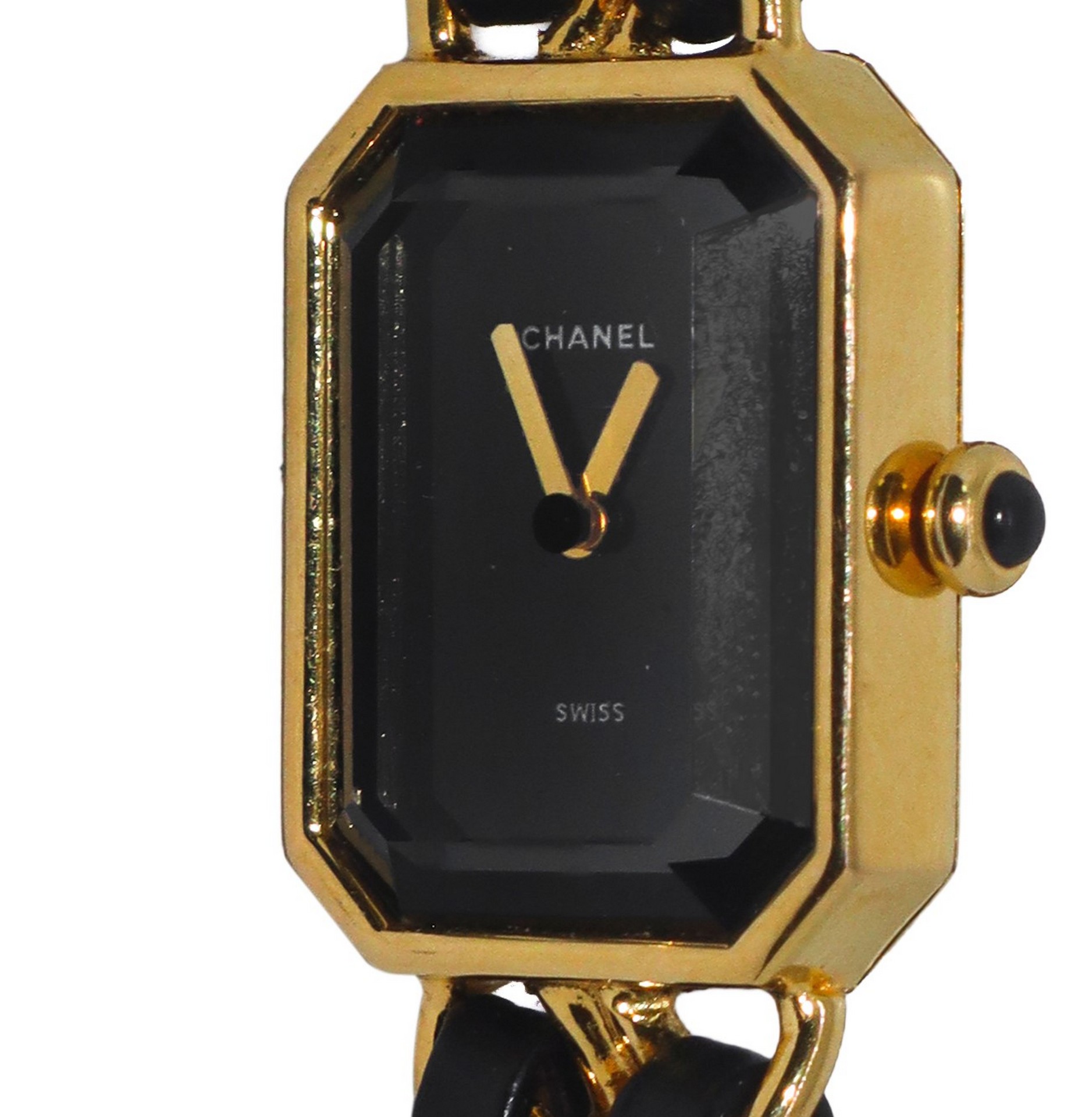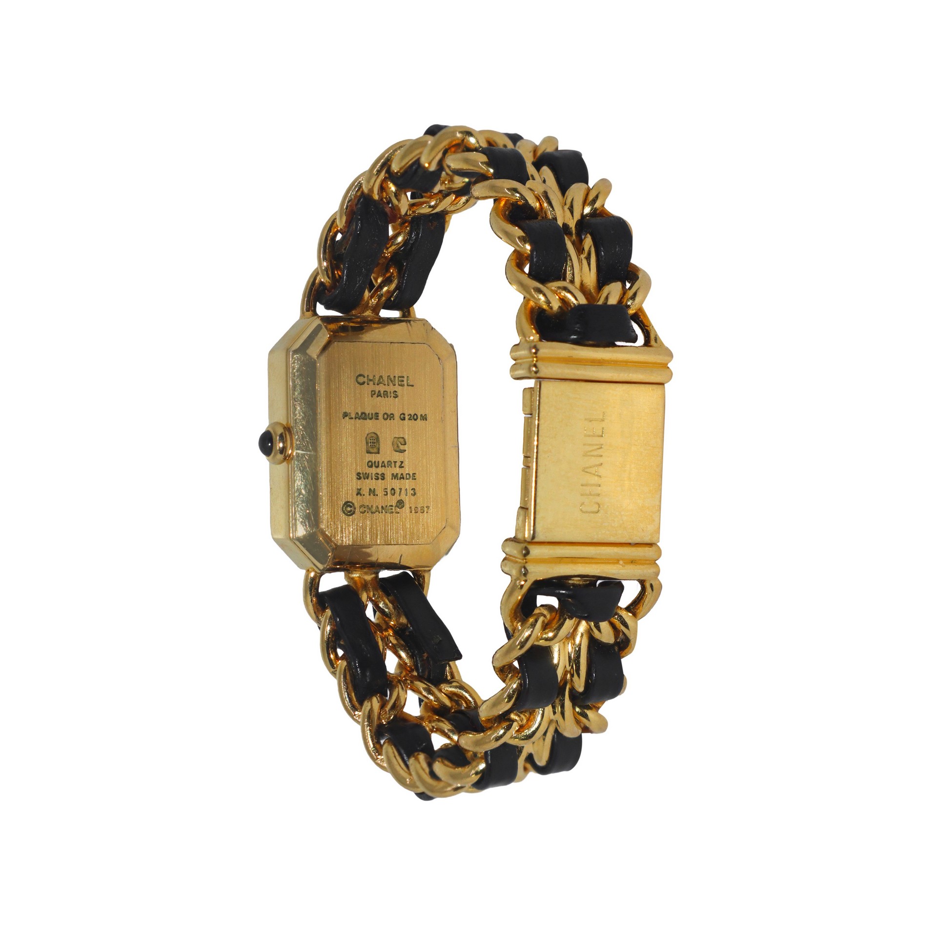 Chanel - Orologio Premiere maglia dorata placcato in oro, 1987 cm 18 Cassa ottagonale, maglia bracciale catena dorata e pelle nera, movimenzo al quarzo. Logo all'interno del quadrante. Retro della cassa marchio Chanel Paris Plaque or g 20 m quartz swiss made X.N. 50713 CHANEL 1987. Piccolissima scollatura della pelle sulla maglia interna.