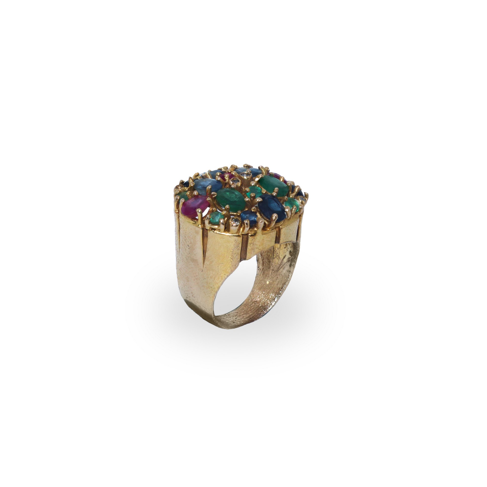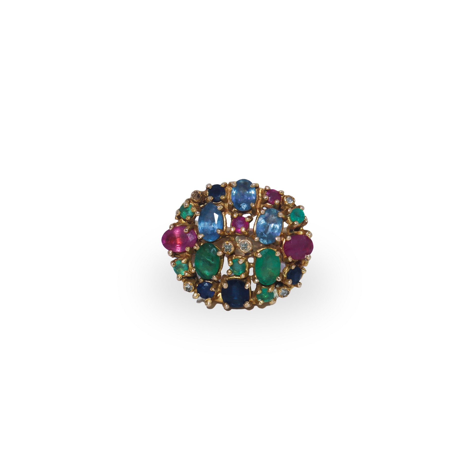 Anello bucheron in metallo dorato con zaffiri, smeraldi, rubini e piccoli brillanti