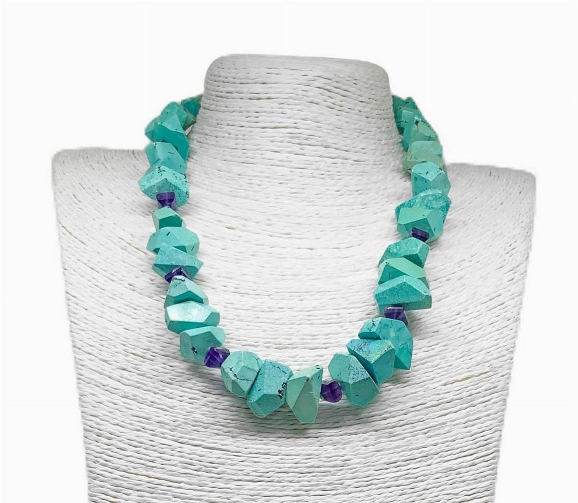 Collana a girocollo con turchese sfaccettato intramezzato da elementi sfaccettati di ametista con chiusura in argento