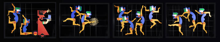 Quattro pannelli in legno ognuno 125x175 con cavi in nylon che reggono le figure