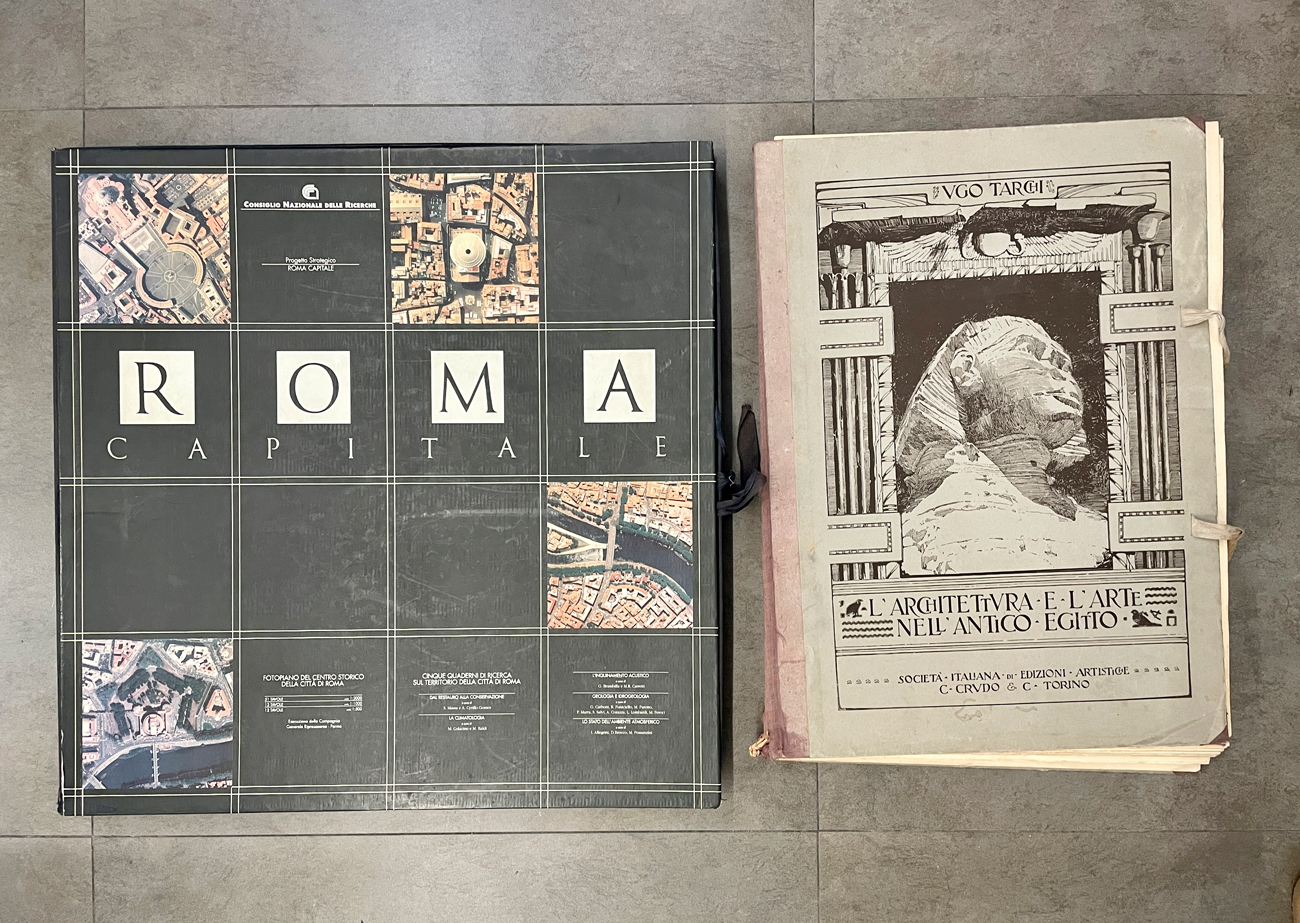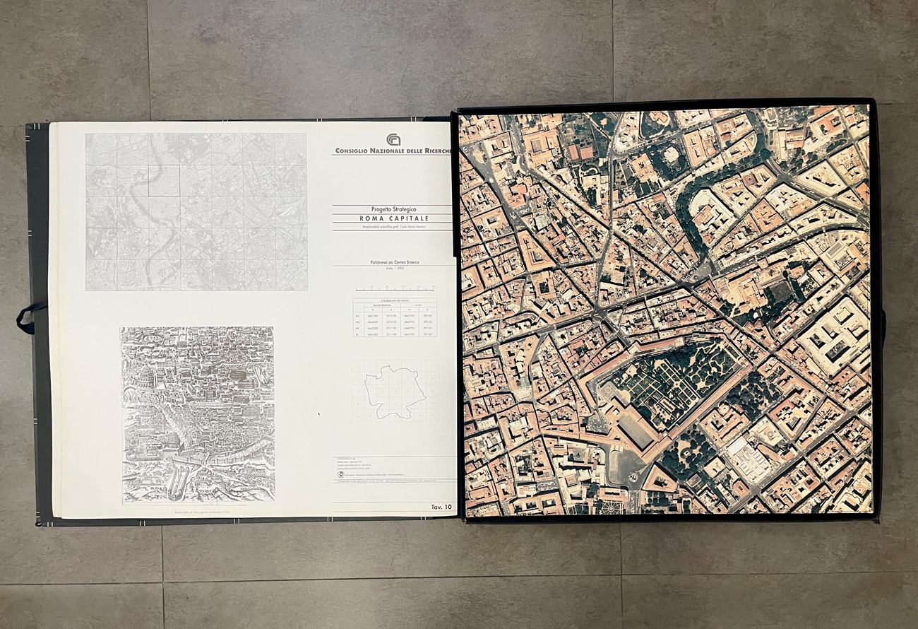 Edizione d'arte composta da cofanetto contenente numerose tavole sciolte raffiguranti scorci di Roma in scala 1:2000 e 1:1000