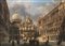 Tra i suoi primi soggetti è appunto il cortile del palazzo Ducale, che conoscevamo in una versione eseguita l'anno del suo arrivo in laguna (Caiati e Salamon, Uno sguardo su Venezia, Catalogo a cura di Teresa Barone, Milano 2009, pp. 42-45). Pressoché coincidente nel taglio della veduta, la tela qui presentata differisce dal più antico esemplare (olio su tela, cm 42,5x55; firmato e datato 1841) per le importanti dimensioni che testimoniano della sicurezza acquisita dal pittore e insieme del precoce successo di questo soggetto, del tutto nuovo al repertorio veneziano almeno nel punto di vista fortemente decentrato lungo l'asse longitudinale del cortile. Esaltati plasticamente dai contrasti di lume, ne sono privilegiati i risalti della facciata orientale del palazzo, ricostruita da Antonio Rizzo dopo l'incendio del 1483 e rifinita dopo il 1498 dalle decorazioni marmoree di Pietro Lombardo. Risalta nella luce pomeridiana la scala detta "dei Giganti", capolavoro del Rizzo, caratterizzata dalle figure monumentali di Nettuno e Mercurio scolpite dal Sansovino nel 1566 quali simbolo della potenza della Serenissima. In fondo, il maestoso arco Foscari conclude l'omonimo porticato sul lato settentrionale, da cui emerge una delle cupole della basilica marciana.