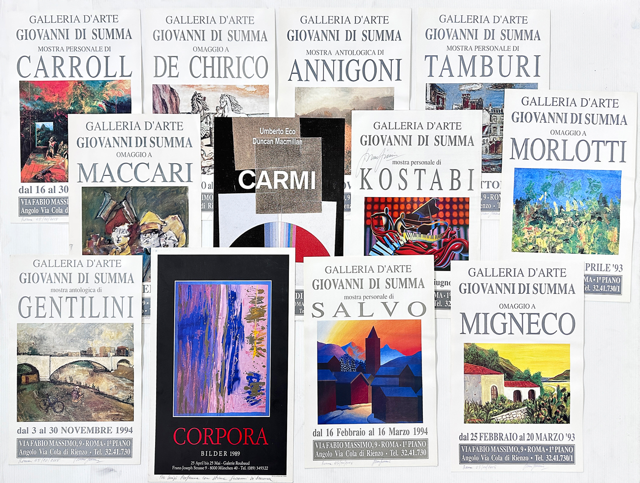 Locandine della mostra presso la Galleria Giovanni Di Summa dei seguenti Artisti: Salvo, Corpora, Gentilini, Kostabi, Maccari, Migneco, Morlotti, De Chirico, Tamburi,Anngoni, Carrol, Scialoia.