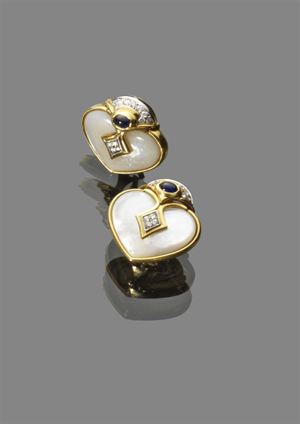 COPPIA DI ORECCHINI Coppia orecchini a forma di cuore in madreperla e oro giallo e bianco con incastonati due piccoli zaffiri taglio cabochon per complessivi ct 0,70 e diamanti taglio brillante per complessivi ct 0,25 Peso gr 22,00 pair of yellow and white gold heart shaped mother of pearl earrings with cabochon cut sopphires approx total 0,70 and brillant cut diamonds approx total 0,70. kt Weight 22.00 gr