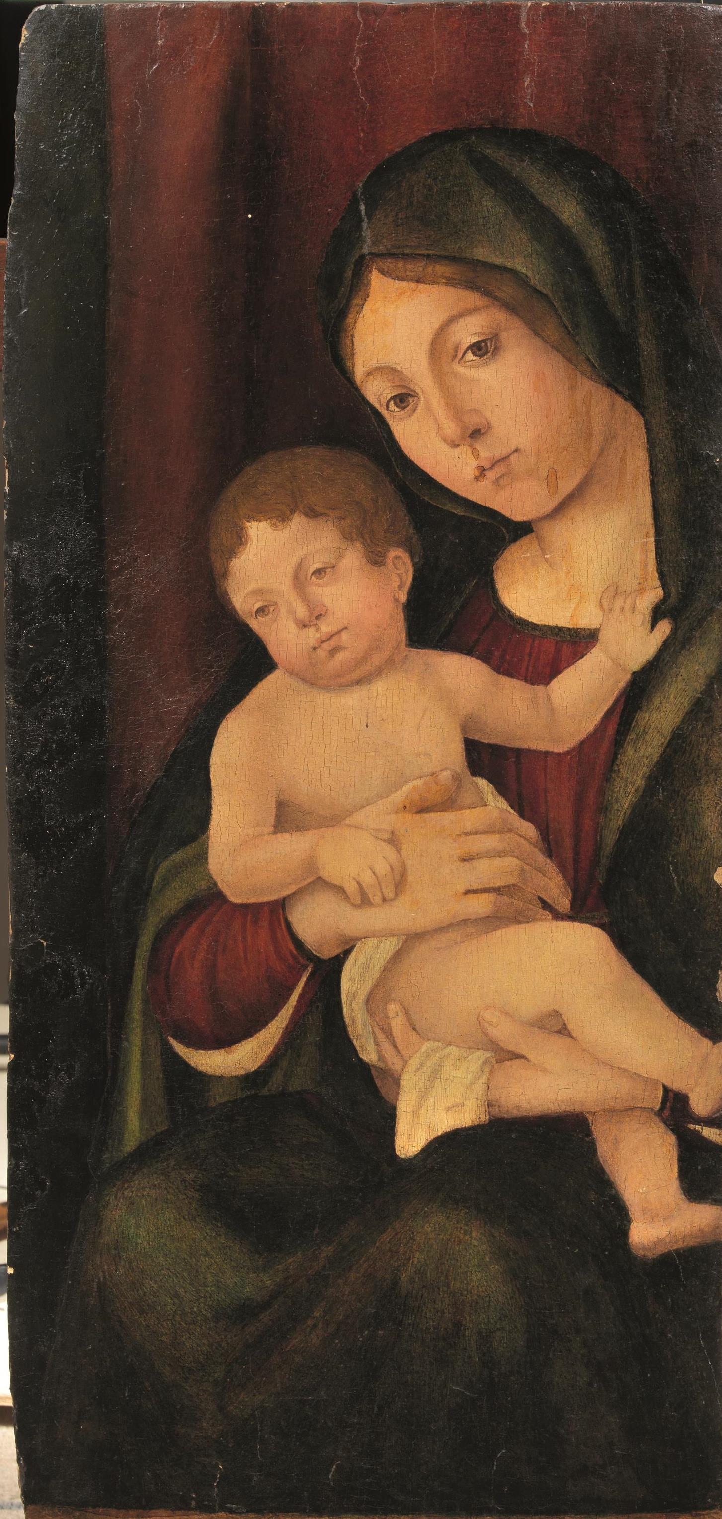 Scuola emiliana, inizi sec. XVIMADONNA CON BAMBINOolio su tavola, cm 67x30...