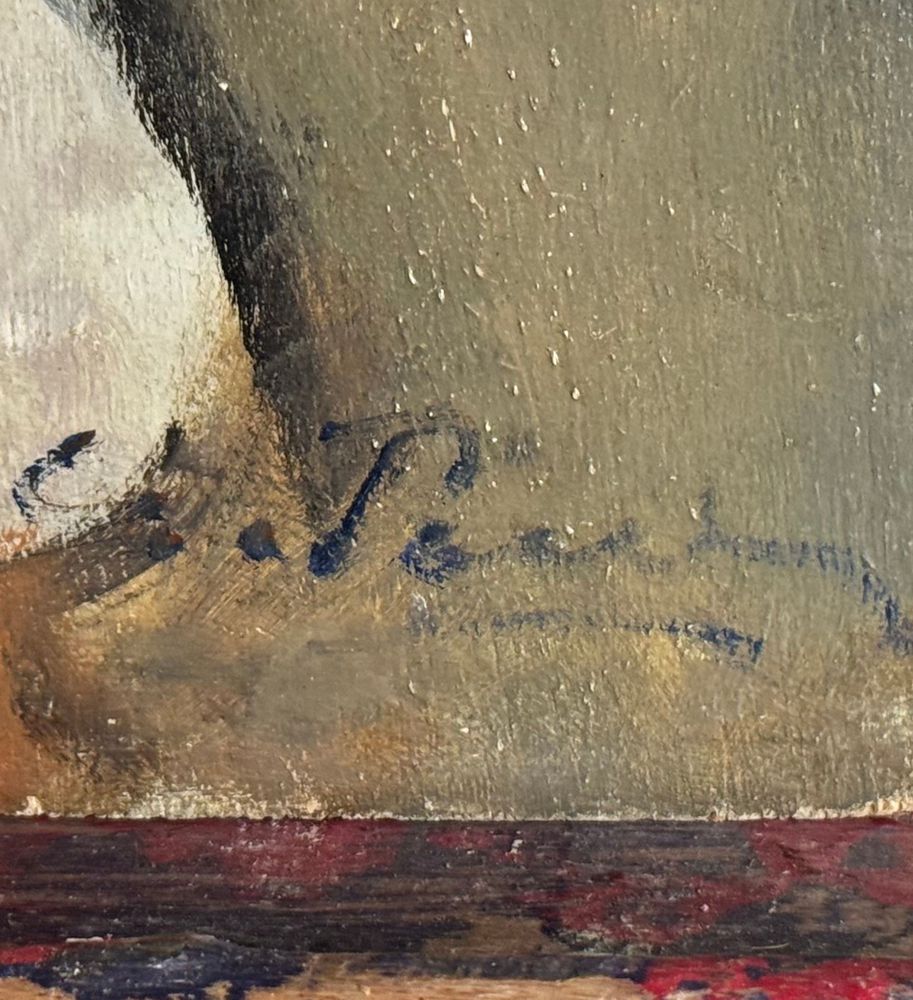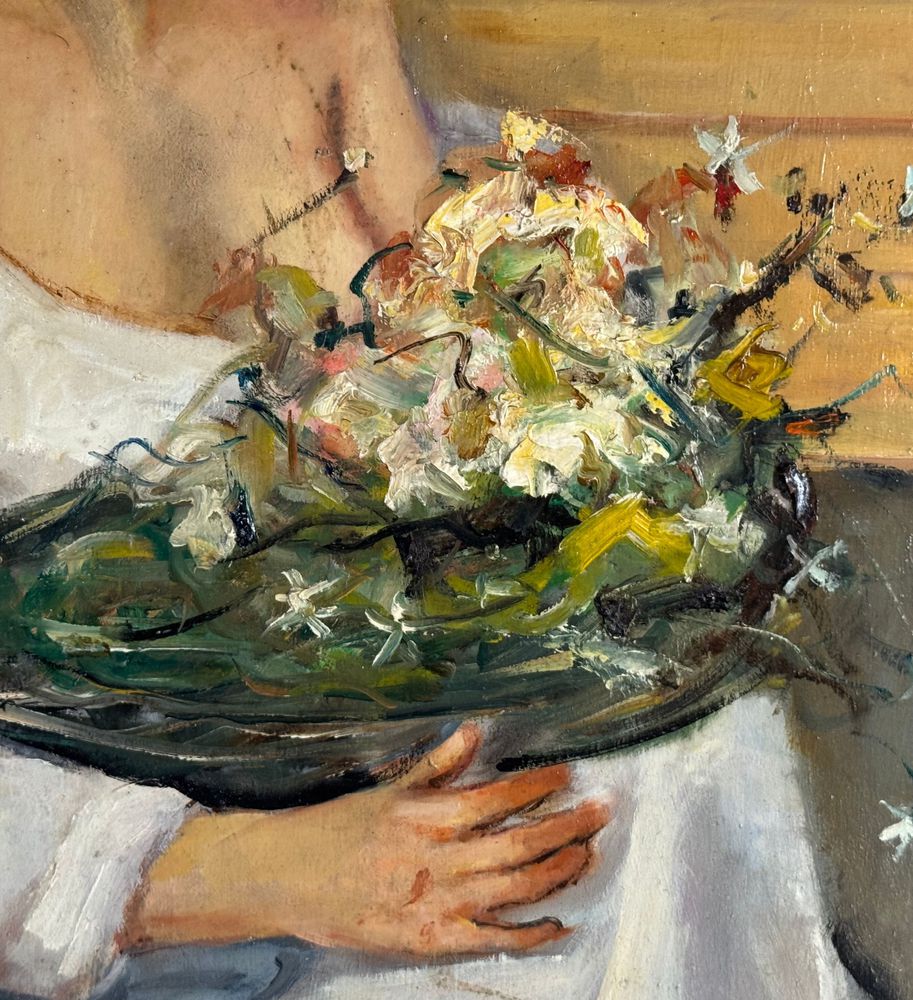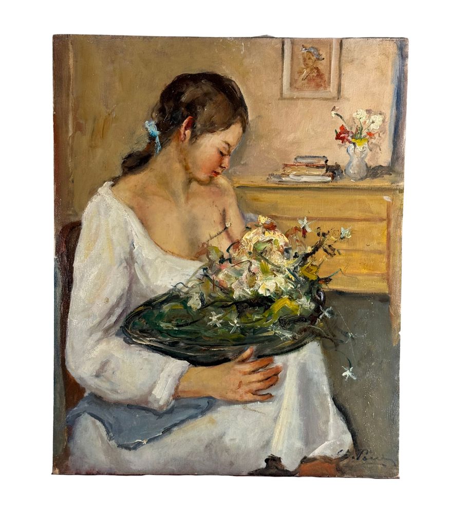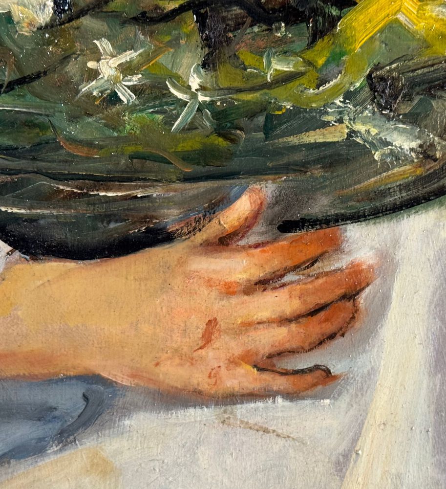 Dipinto olio su tavola, periodo XX secolo, scuola Italiana, raffigurante Ritratto di donna con cestino. Dimensioni: 40x50 cm. Firmato in basso a destra Giovanni Pane. Opera in buone condizioni.
