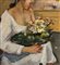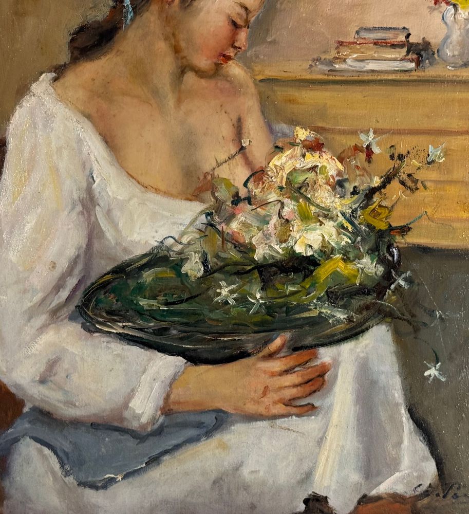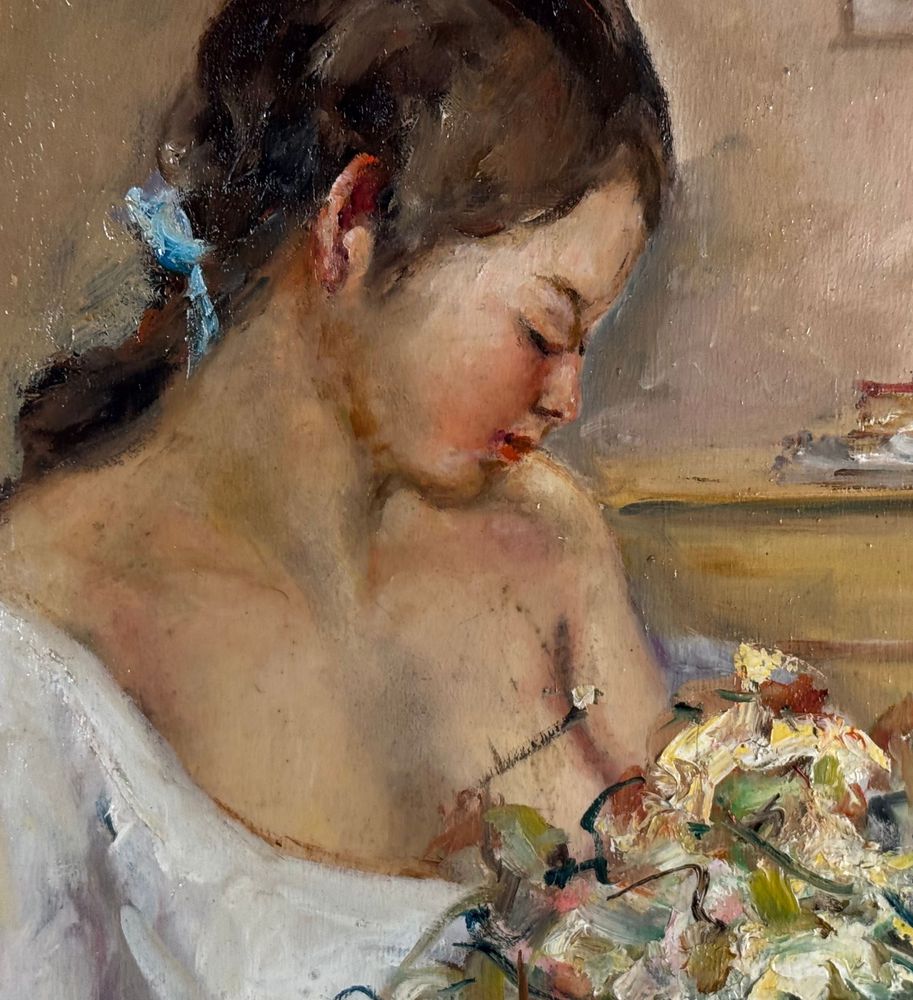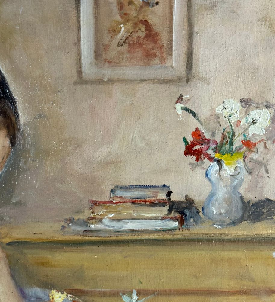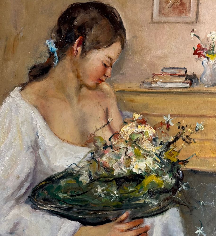 Dipinto olio su tavola, periodo XX secolo, scuola Italiana, raffigurante Ritratto di donna con cestino. Dimensioni: 40x50 cm. Firmato in basso a destra Giovanni Pane. Opera in buone condizioni.