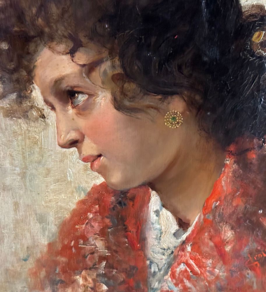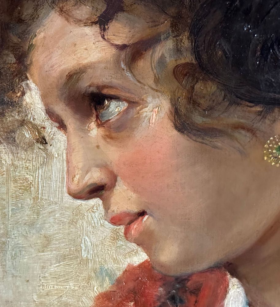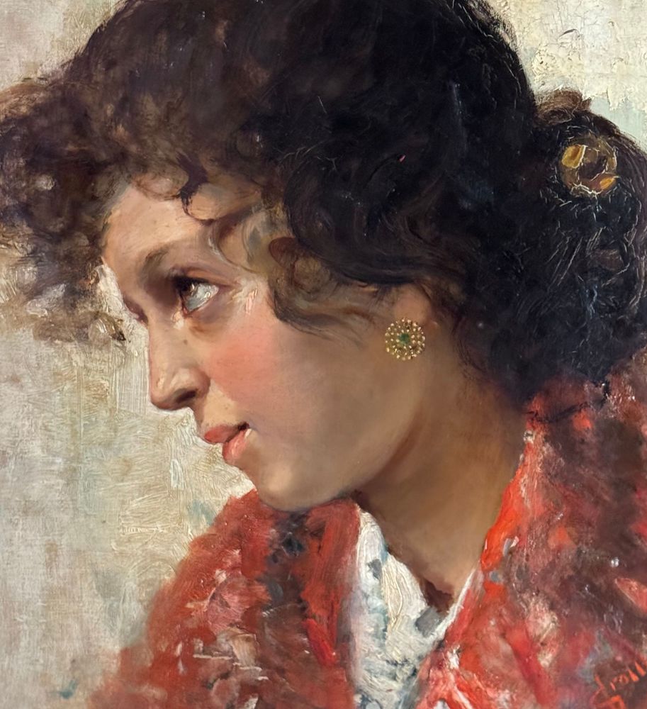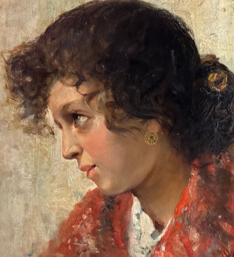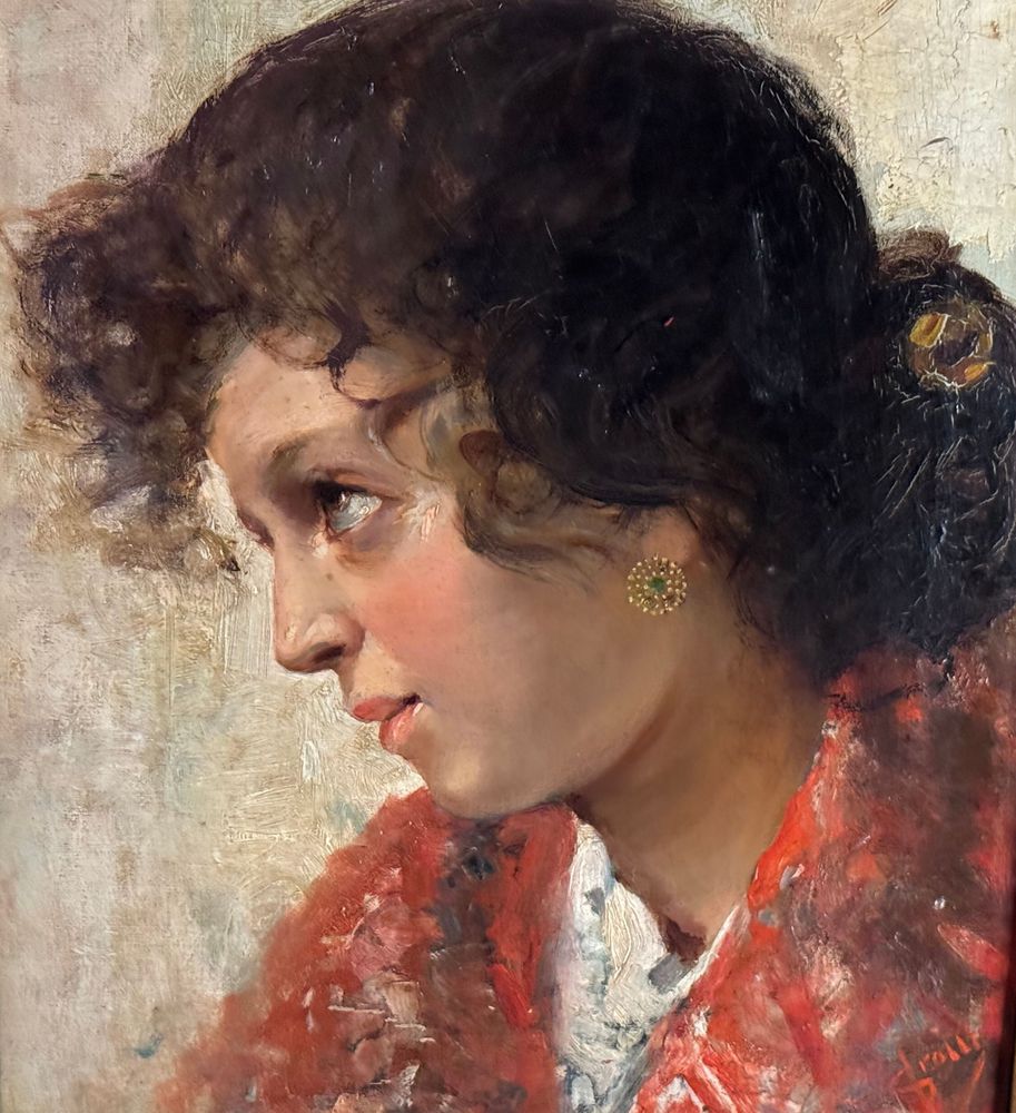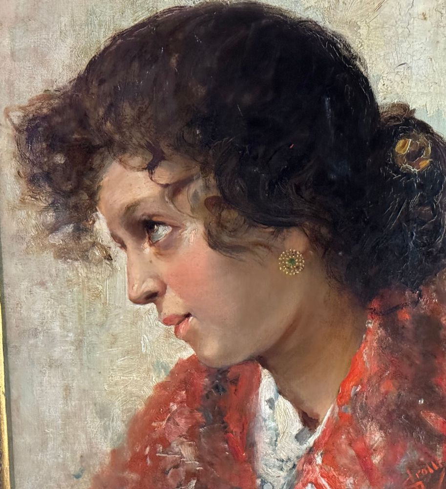 Dipinto olio su tela, periodo XIX/XX secolo, scuola Italiana, raffigurante Ritratto di giovane donna. Dimensioni compreso cornice: 74x59 cm. Dimensioni interno cornice: 36x51 cm. Firmato in basso a destra Vincenzo Irolli. Opera in buone condizioni.