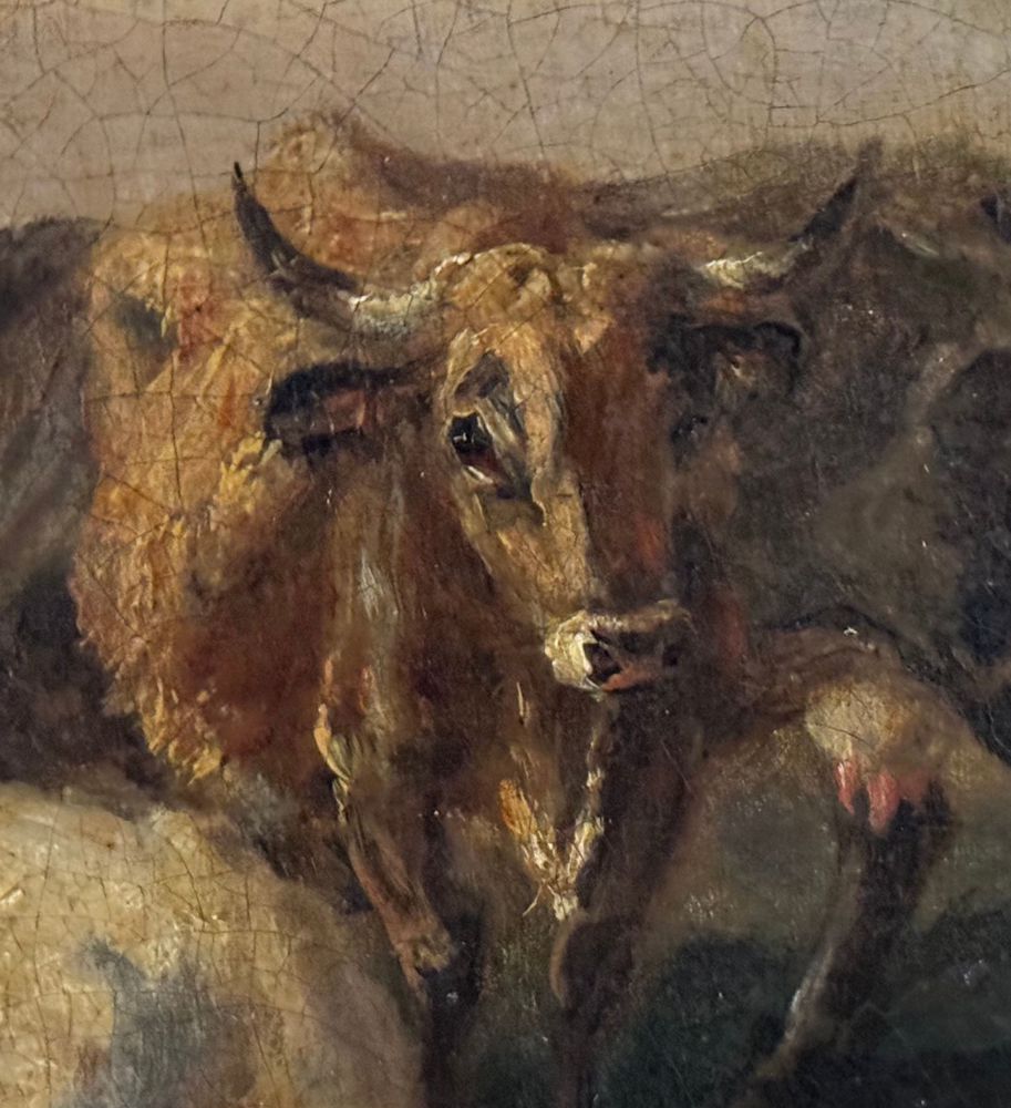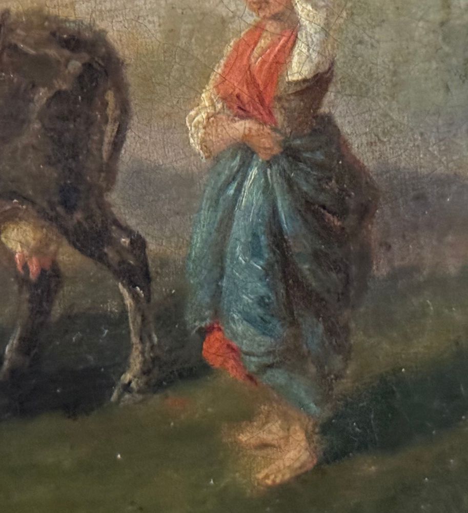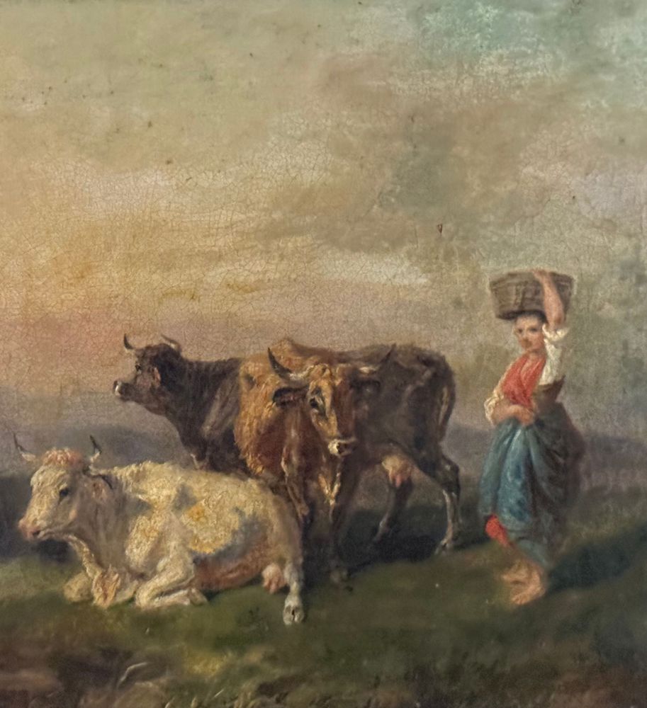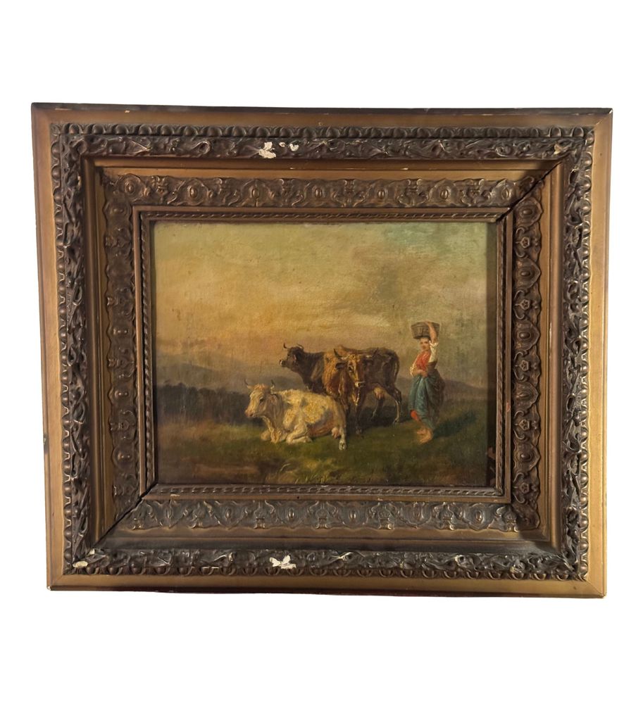 Dipinto olio su tela, periodo XIX secolo, scuola Italiana, raffigurante Contadina con gregge. Dimensioni compreso cornice: 60x52 cm. Dimensioni interno cornice: 37,5x28,5 cm. Attribuito Filippo Palizzi. Opera in buone condizioni con segni di vissuto come da foto allegate.