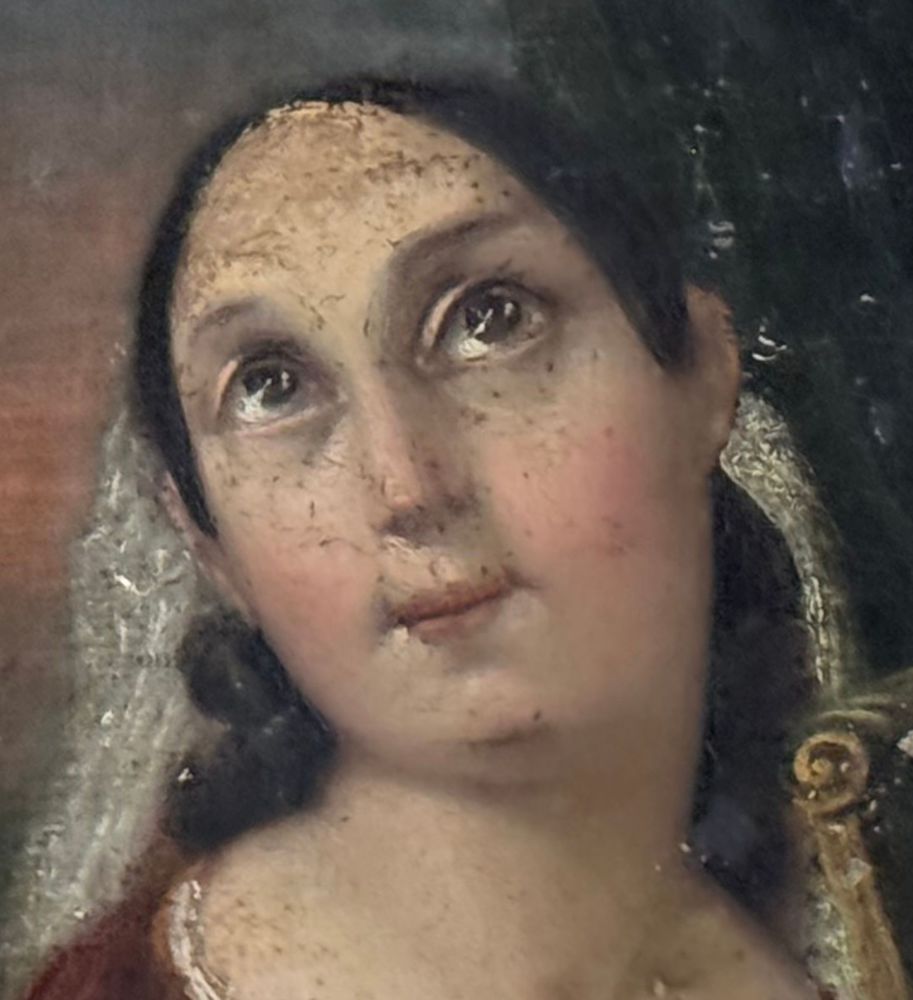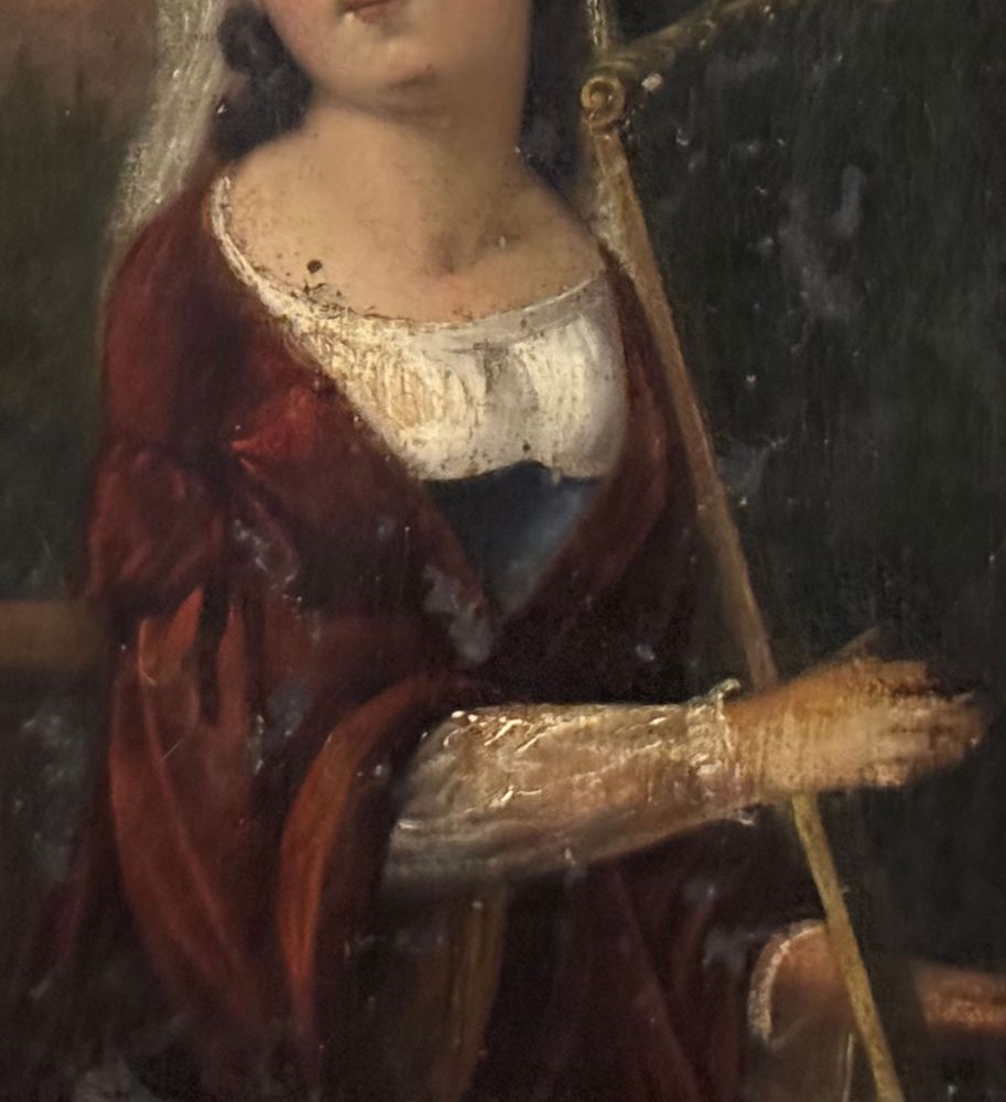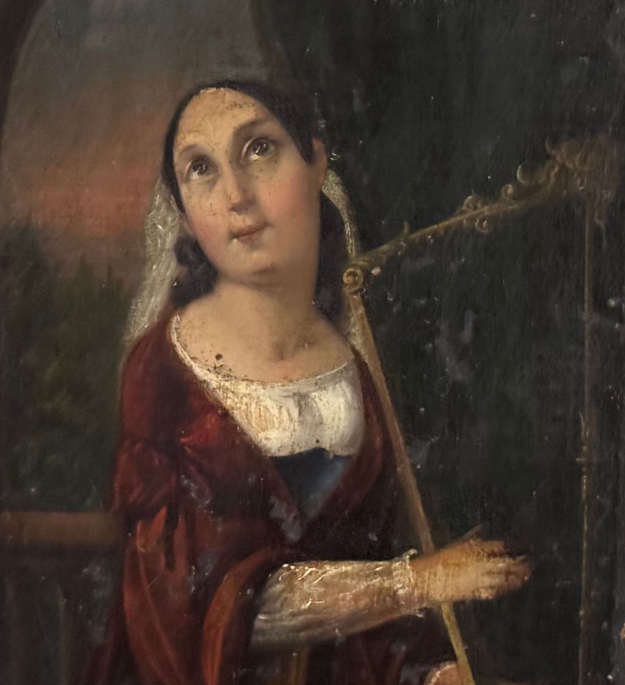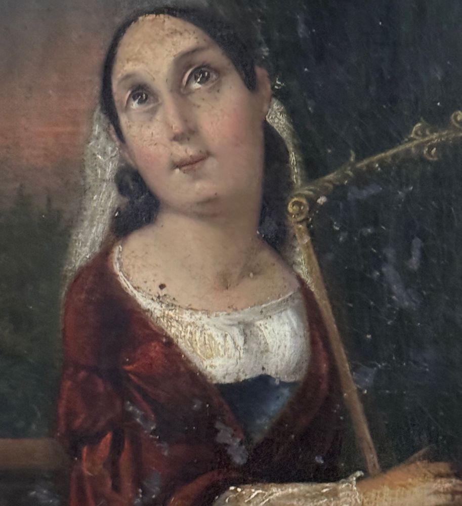 Dipinto olio su tela applicata su pannello, periodo XVIII secolo, scuola Italiana raffigurante Donna con arpa (allegoria della musica). Dimensioni compreso cornice: 52x59 cm. Dimensioni interno cornice: 24,5x32,5 cm. Da artista anonimo. Opera in discrete condizioni come da foto allegate