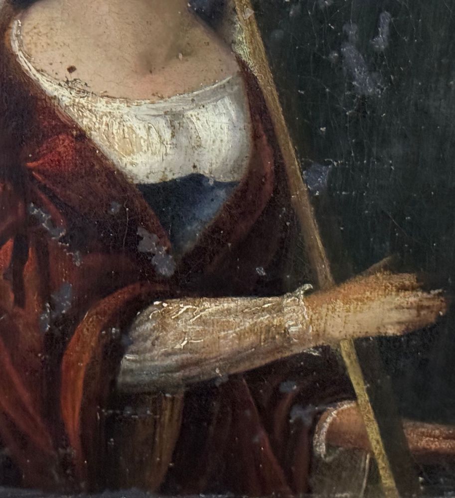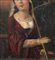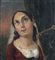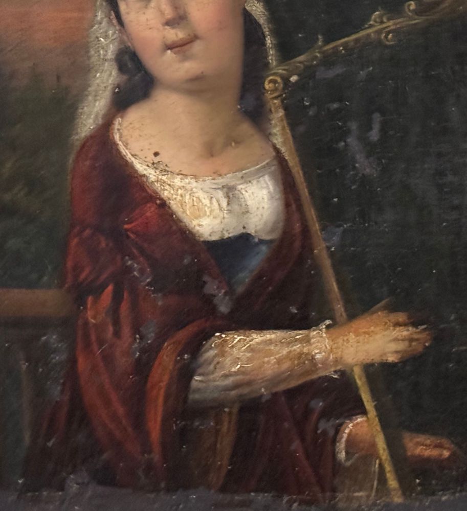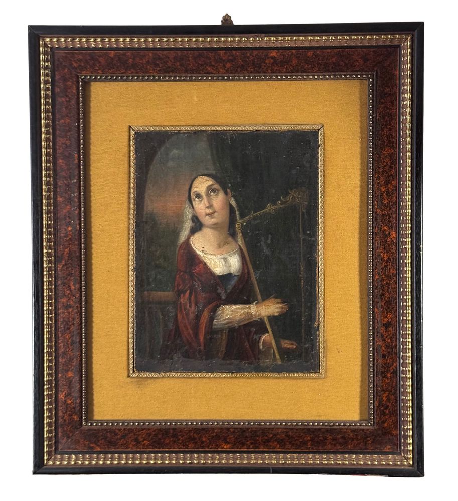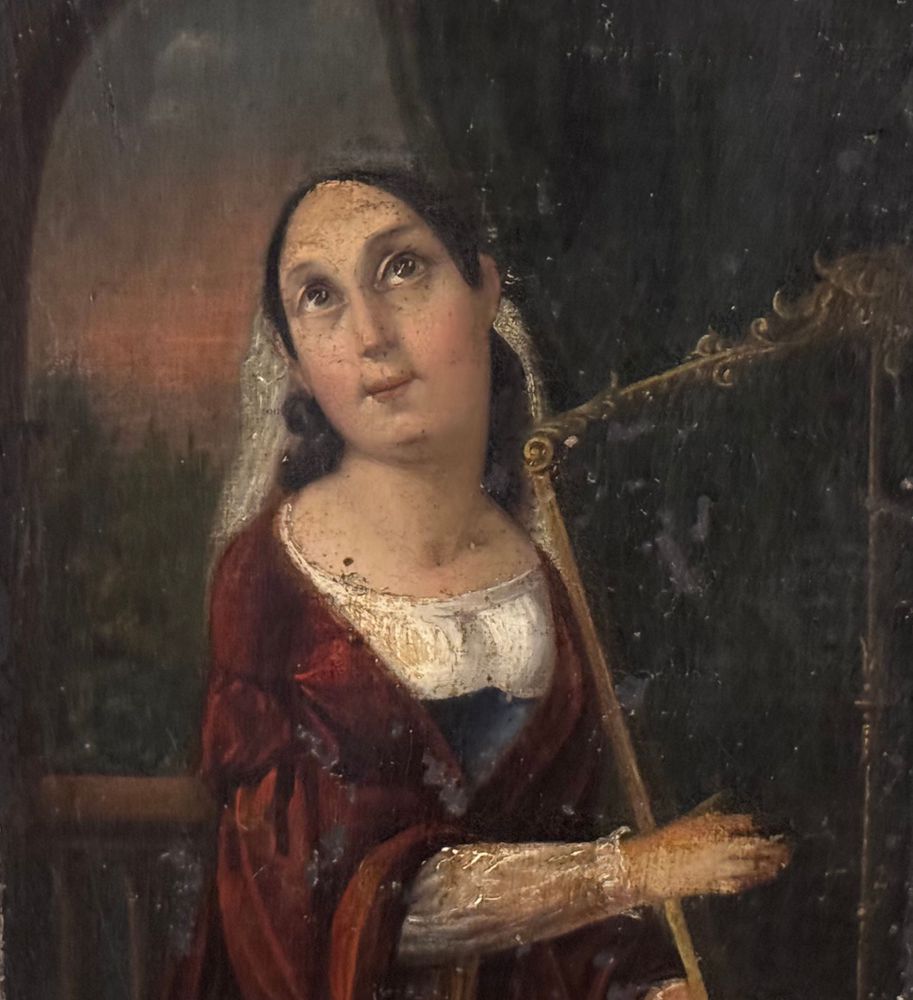 Dipinto olio su tela applicata su pannello, periodo XVIII secolo, scuola Italiana raffigurante Donna con arpa (allegoria della musica). Dimensioni compreso cornice: 52x59 cm. Dimensioni interno cornice: 24,5x32,5 cm. Da artista anonimo. Opera in discrete condizioni come da foto allegate
