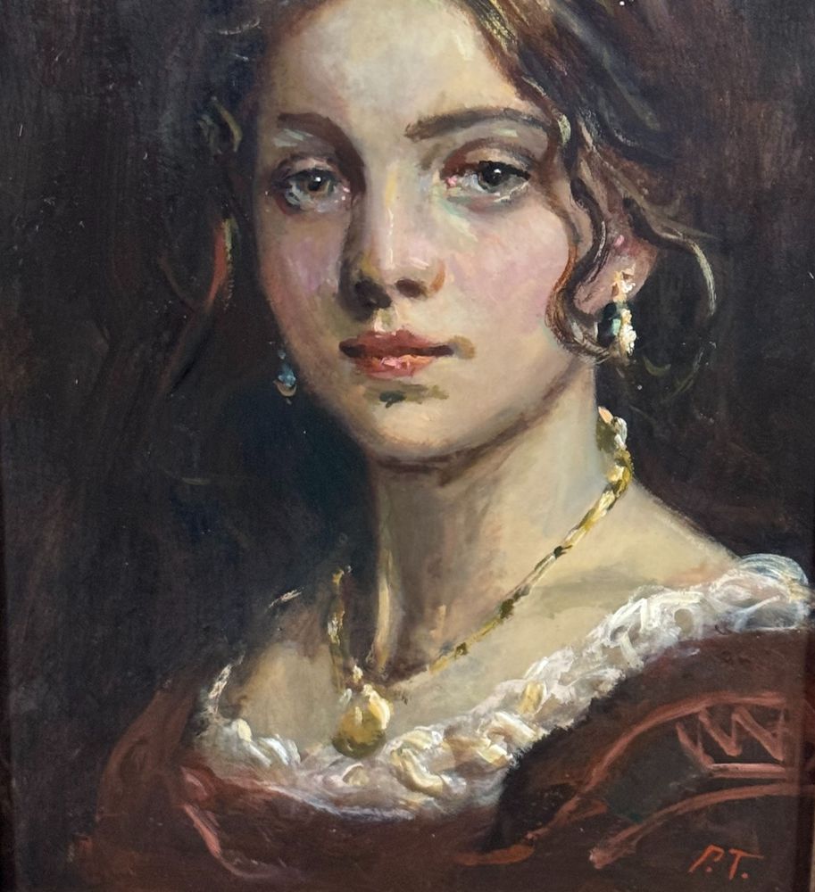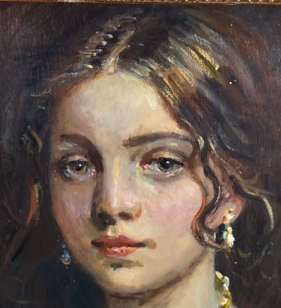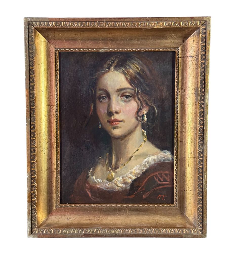 Dipinto olio su pannello, periodo XX secolo, scuola Italiana, raffigurante Ritratto di donna. Dimensioni compreso cornice: 42x50 cm. Dimensioni interno cornice: 30x40 cm. Iniziali in basso a destra artista non identificato. Opera in buone condizioni.