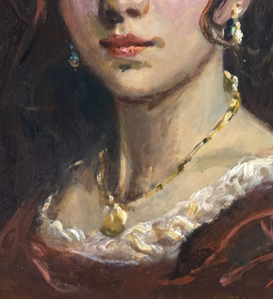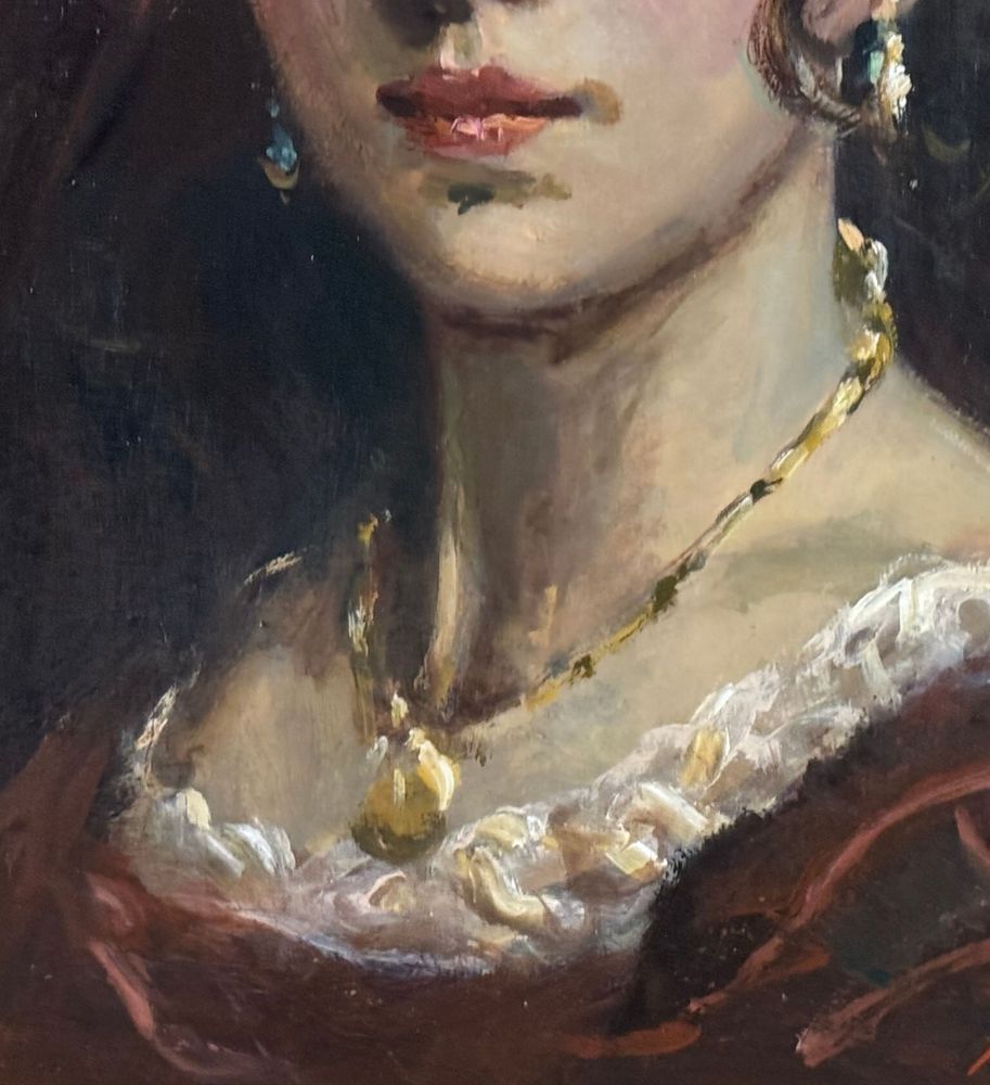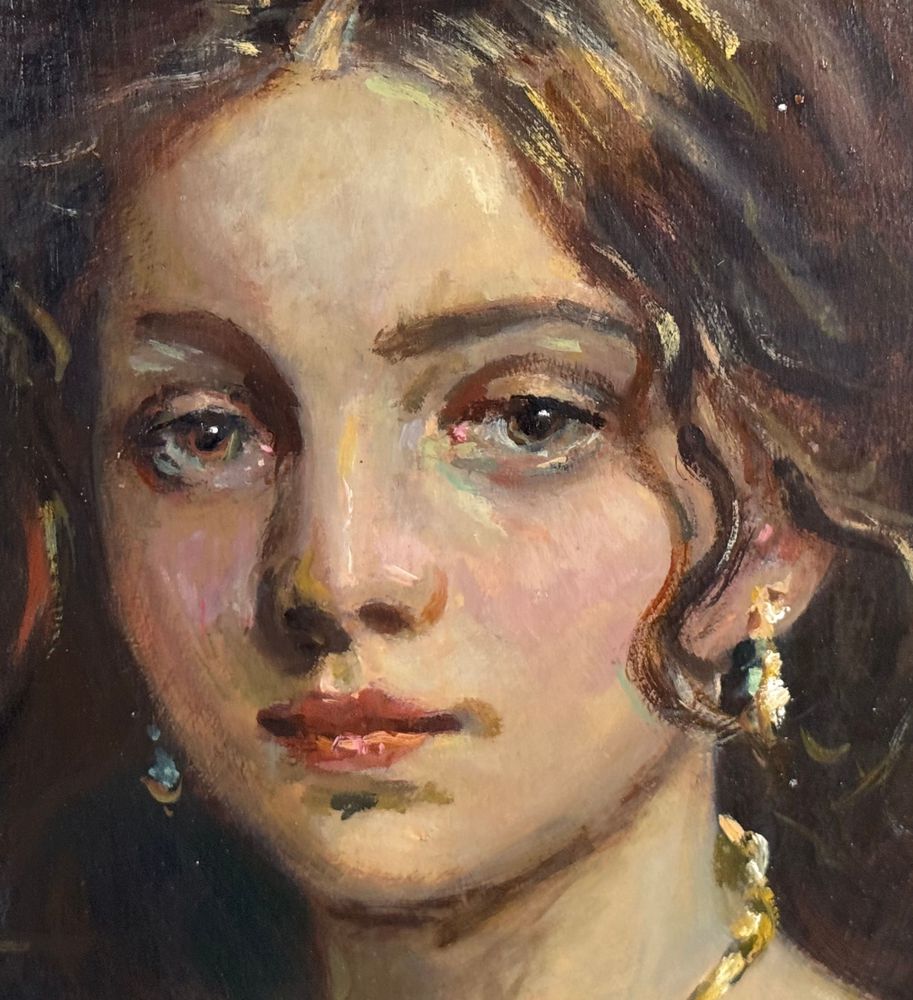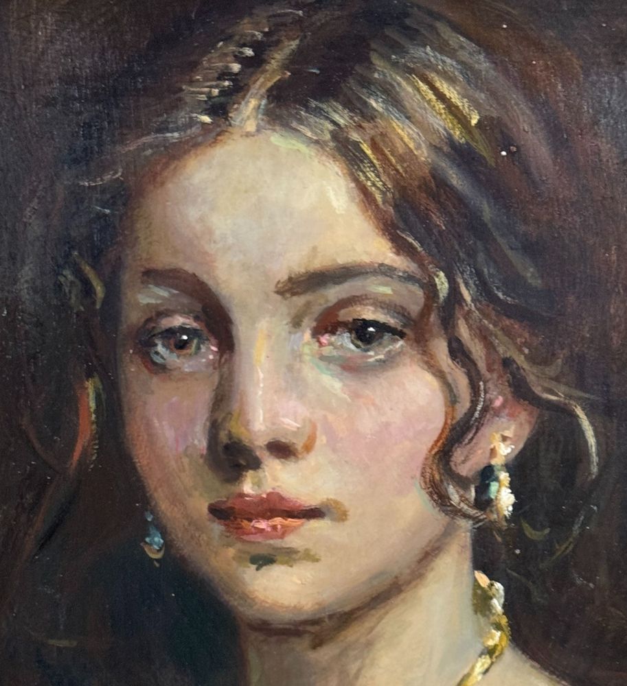 Dipinto olio su pannello, periodo XX secolo, scuola Italiana, raffigurante Ritratto di donna. Dimensioni compreso cornice: 42x50 cm. Dimensioni interno cornice: 30x40 cm. Iniziali in basso a destra artista non identificato. Opera in buone condizioni.