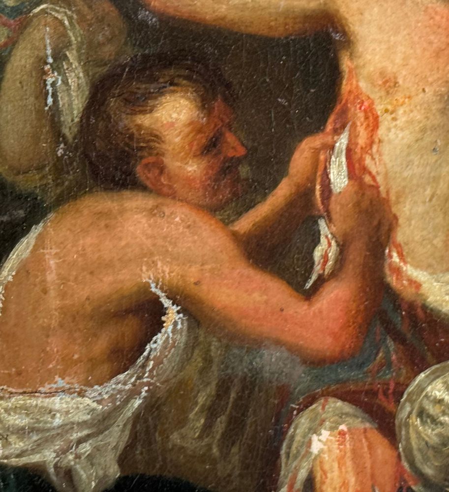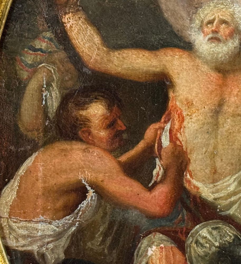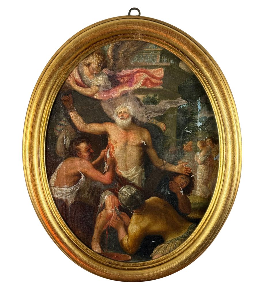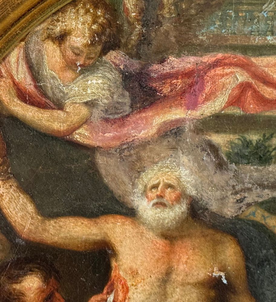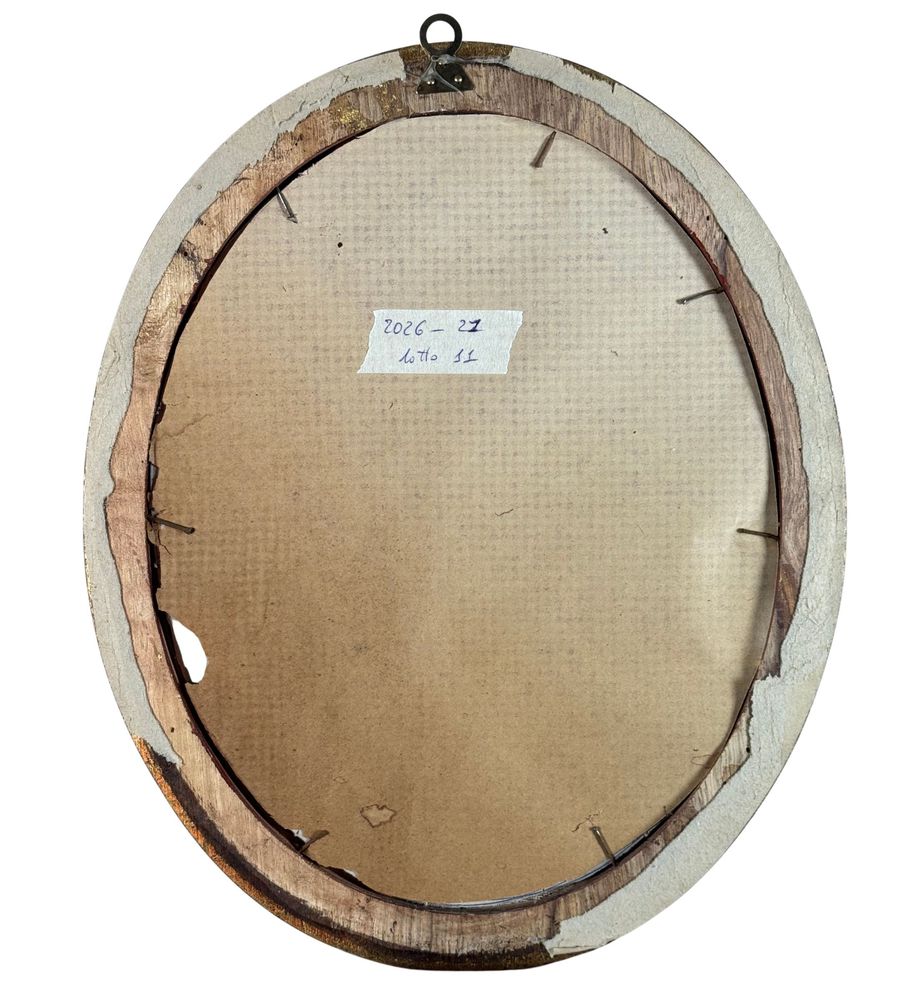 Dipinto olio su tela applicata su cartoncino, periodo XVIII/XIX secolo, scuola Italiana, raffigurante Scena Biblica di forma ovale. Dimensioni compreso cornice: 29x35 cm. Dimensioni interno cornice: 24x30 cm. Artista anonimo. Opera in buone condizioni con lievi segni di vissuto come da foto allegate.