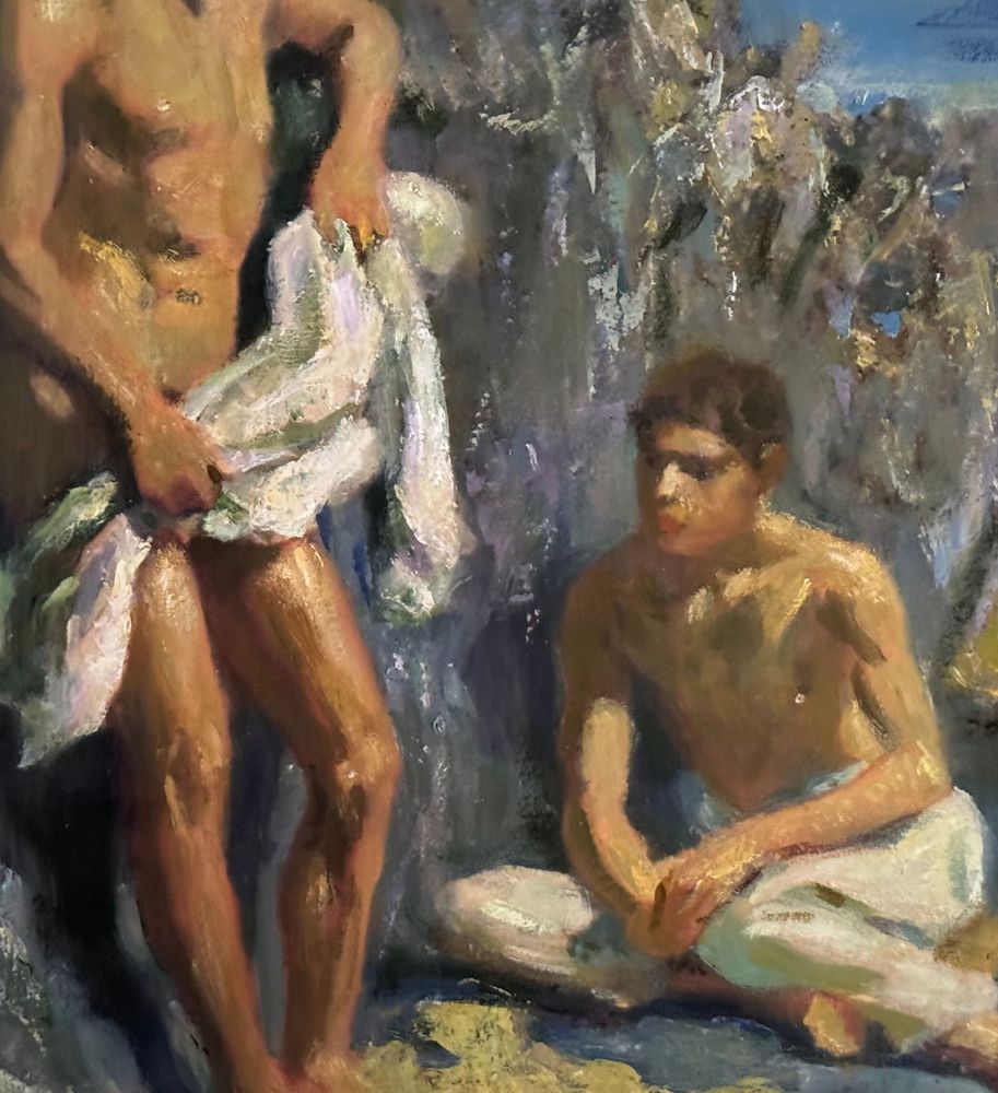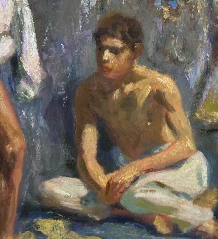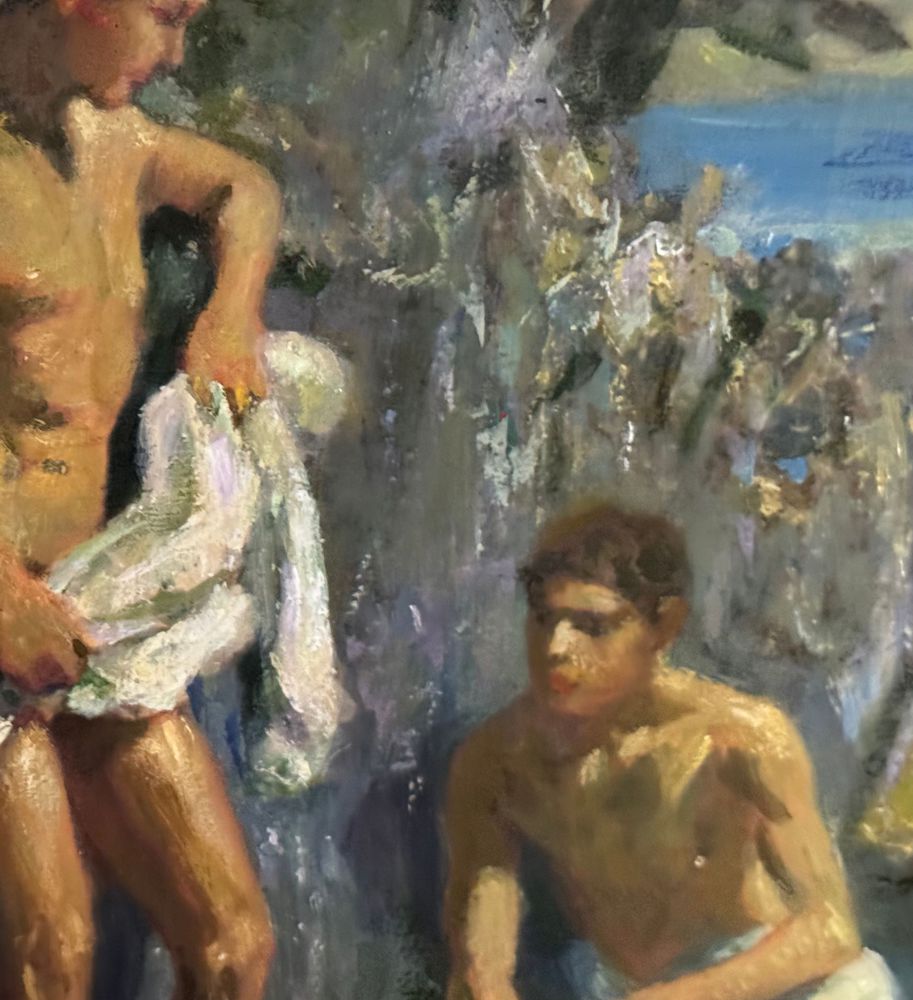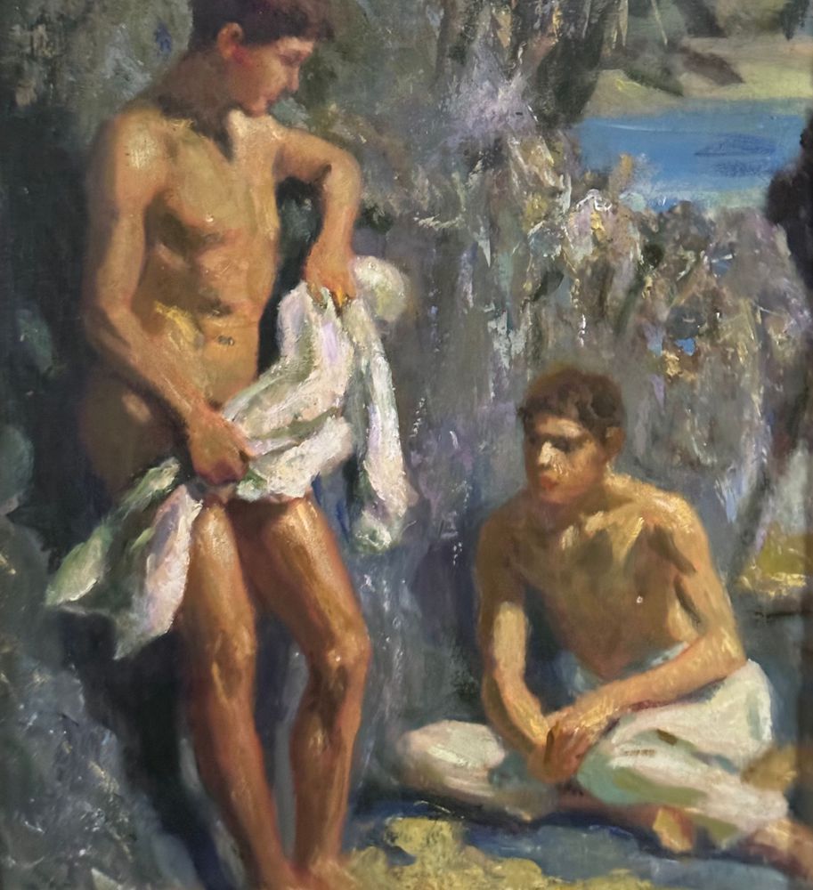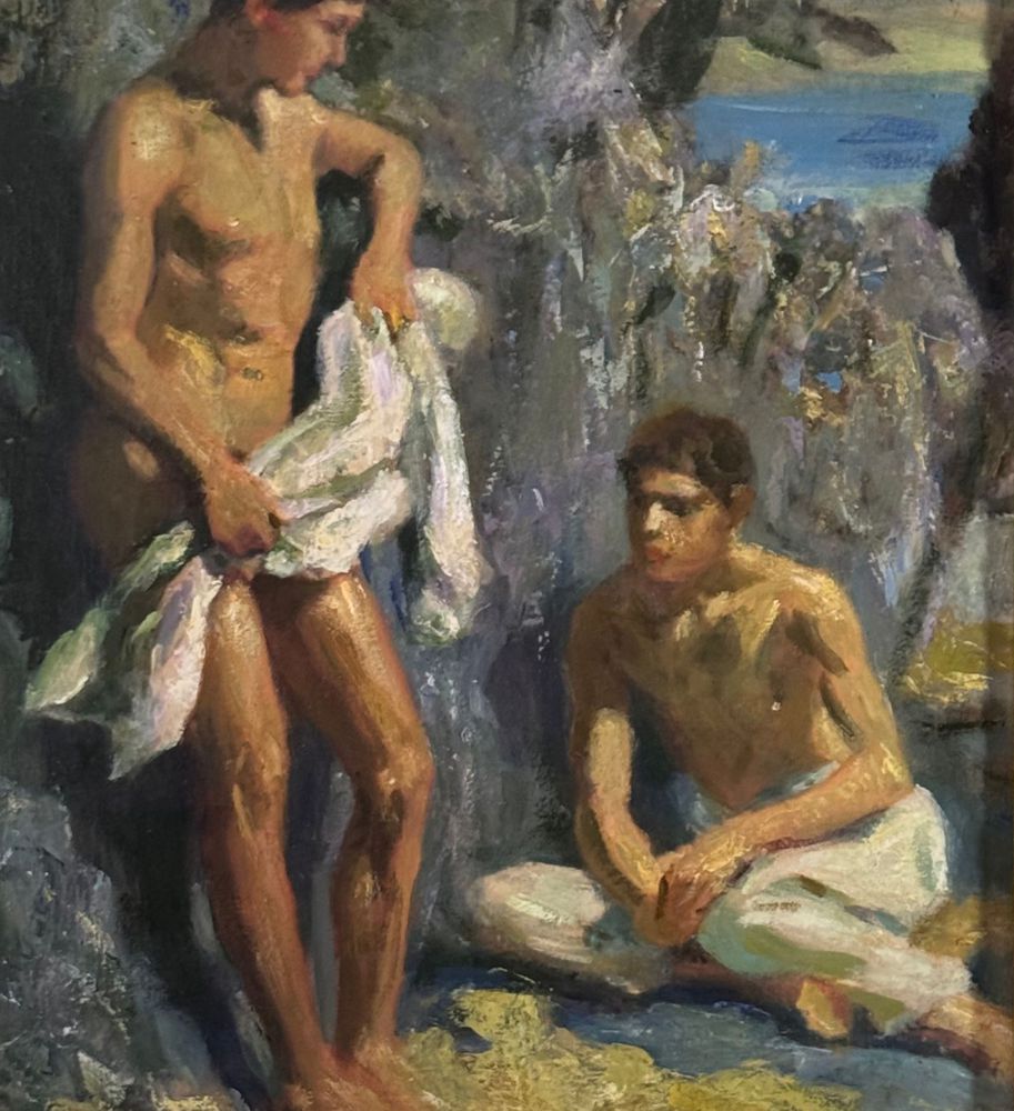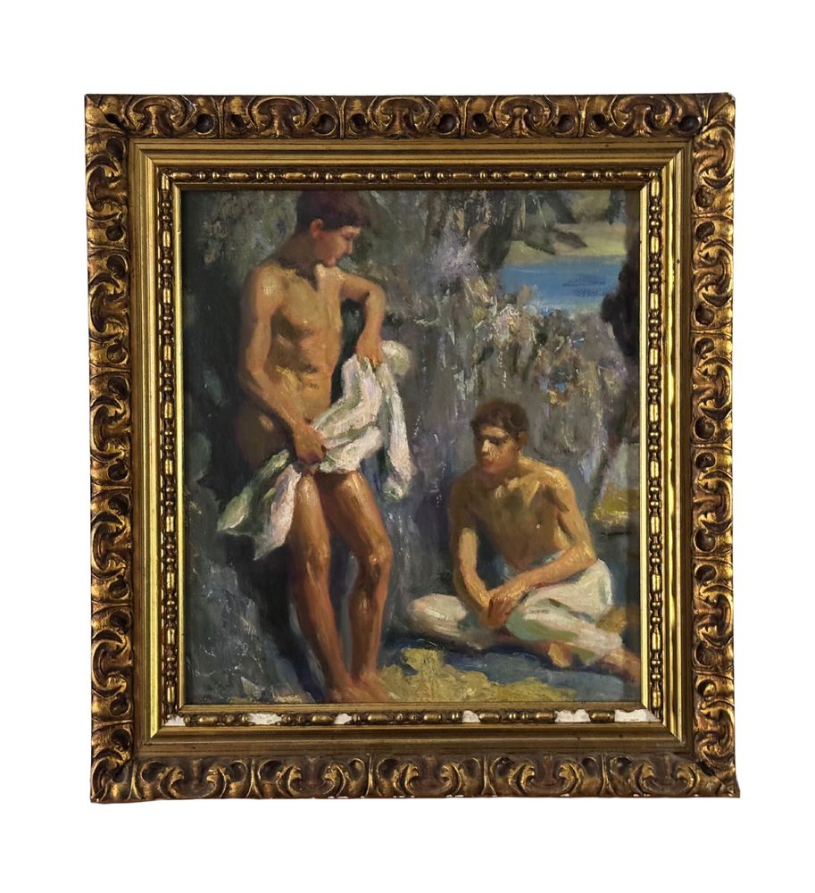 Dipinto olio su tavola, periodo XX secolo, scuola Italiana raffigurante Personaggi maschili su marina. Dimensioni compreso cornice: 46x50 cm. Dimensioni interno cornice: 35x39 cm. Artista anonimo. Opera in buone condizioni.