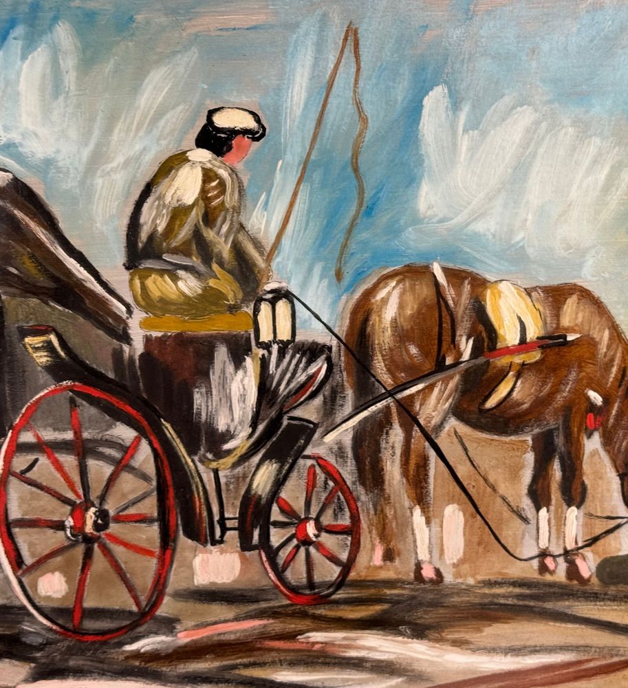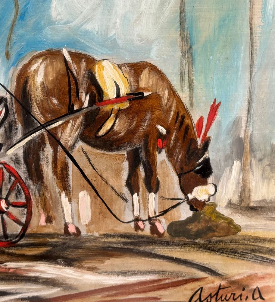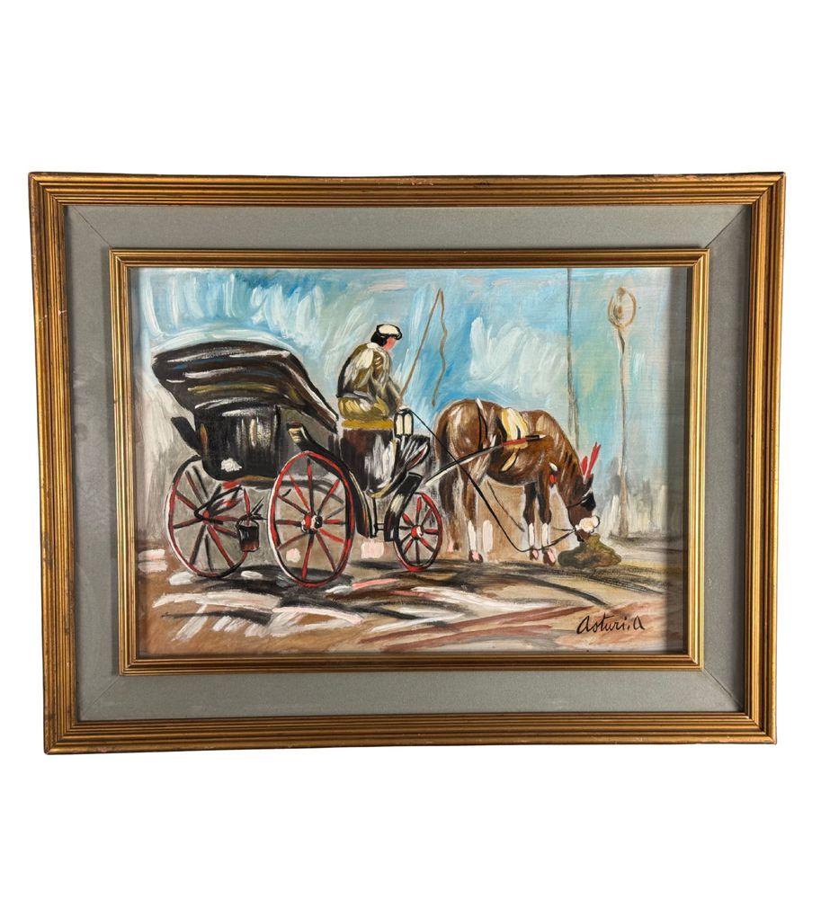Dipinto olio su pannello, periodo XX secolo, scuola Italiana, raffigurante Carrozza. Dimensioni compreso cornice: 64x50 cm. Dimensioni interno cornice: 35x50 cm. Firmato in basso a destra Antonio Asturi. Opera in buone condizioni.