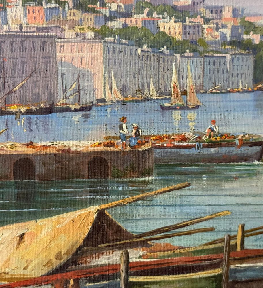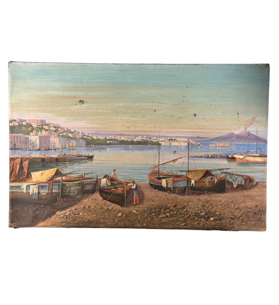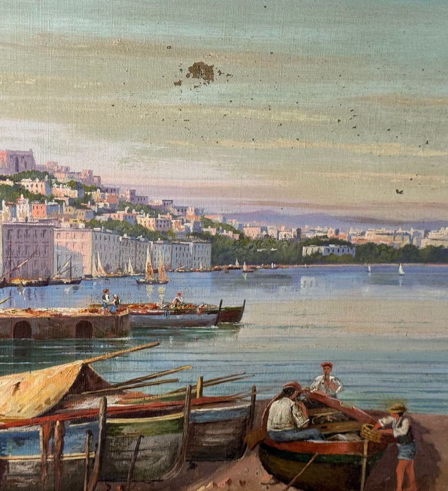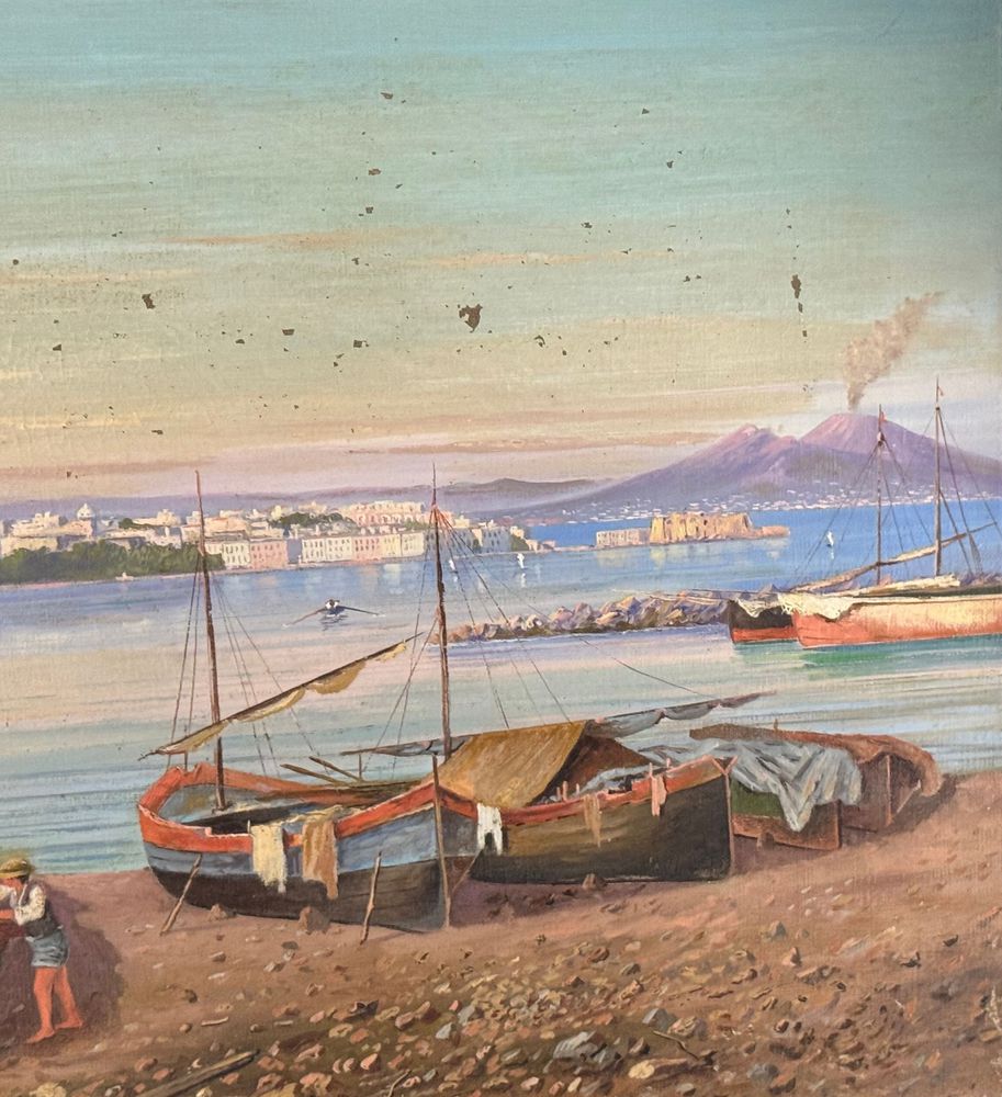 Dipinto olio su tela, periodo XX secolo, scuola Italiana, raffigurante Veduta di Napoli con barche e pescatori. Dimensioni: 70x45 cm. Firmato e datato in basso a sinistra R. Koester 1913. Opera in buone condizioni. Da segnalate piccole cadute di calore nella parte alta della tela, come da foto allegate.