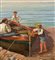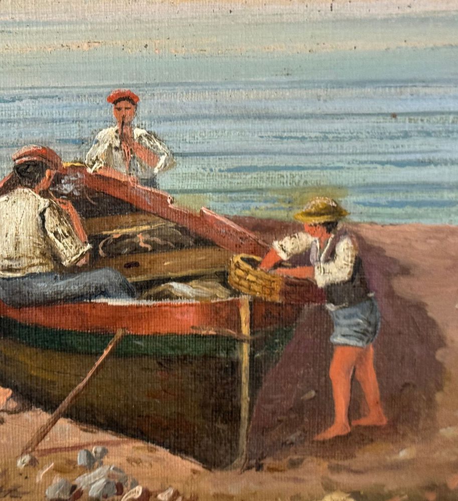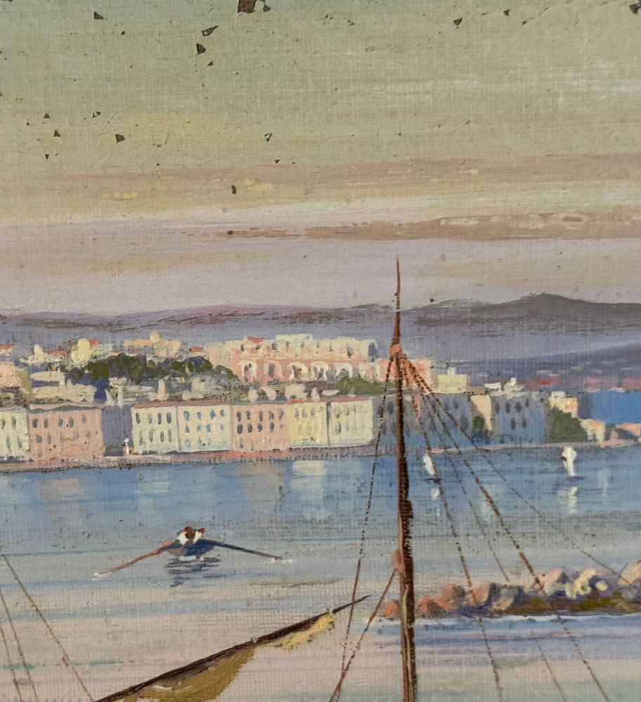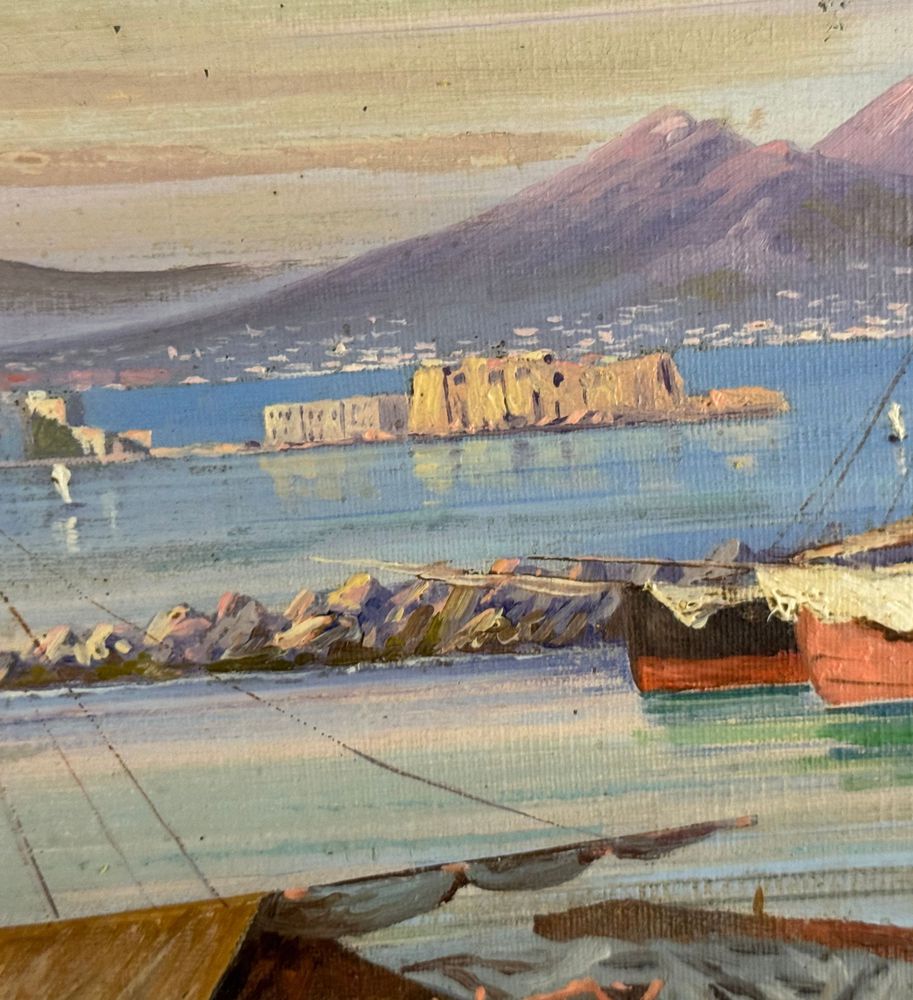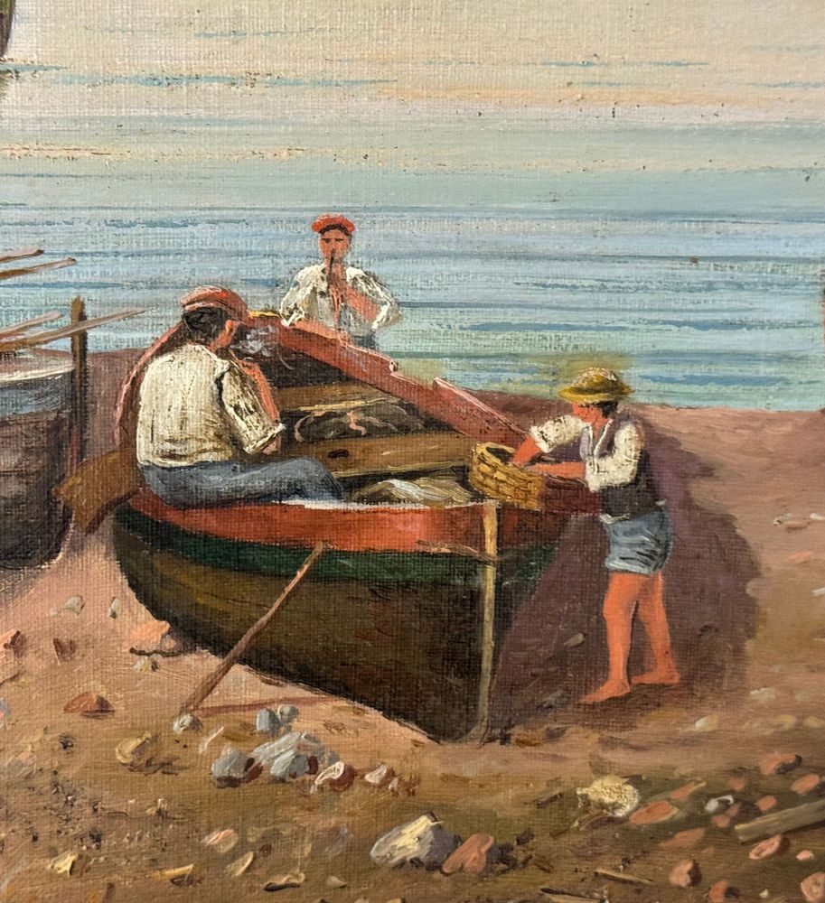 Dipinto olio su tela, periodo XX secolo, scuola Italiana, raffigurante Veduta di Napoli con barche e pescatori. Dimensioni: 70x45 cm. Firmato e datato in basso a sinistra R. Koester 1913. Opera in buone condizioni. Da segnalate piccole cadute di calore nella parte alta della tela, come da foto allegate.