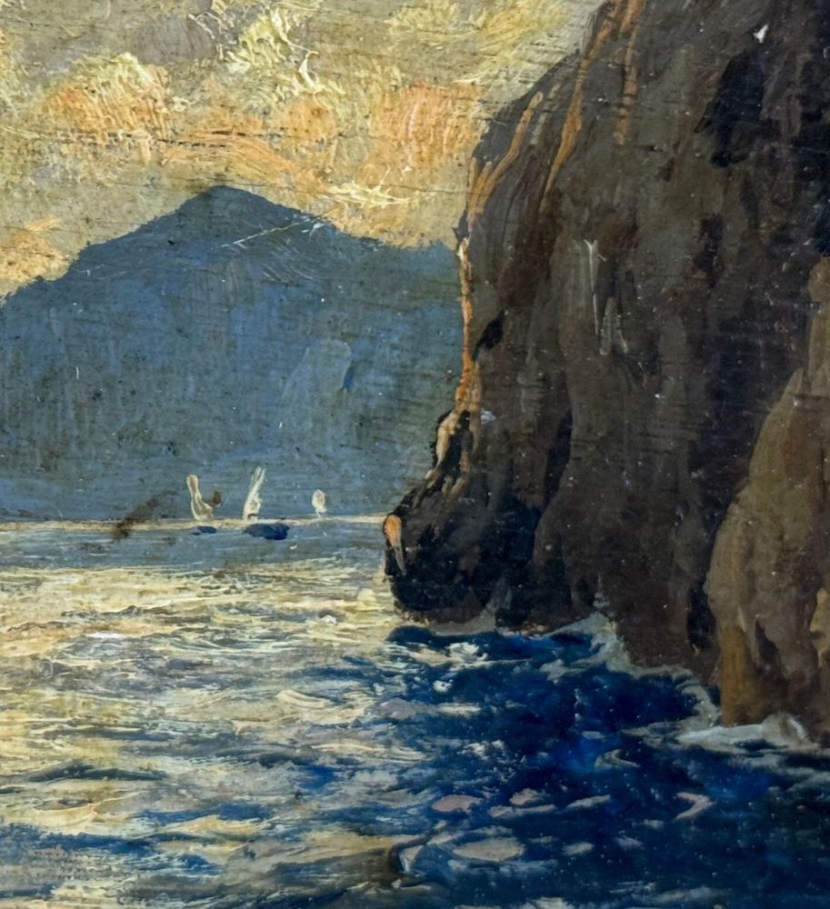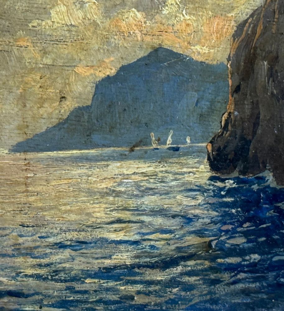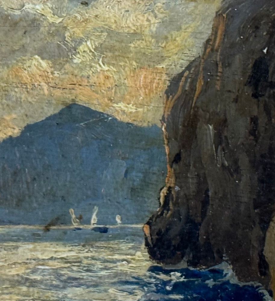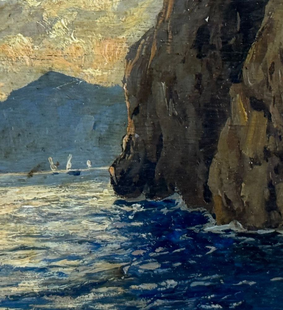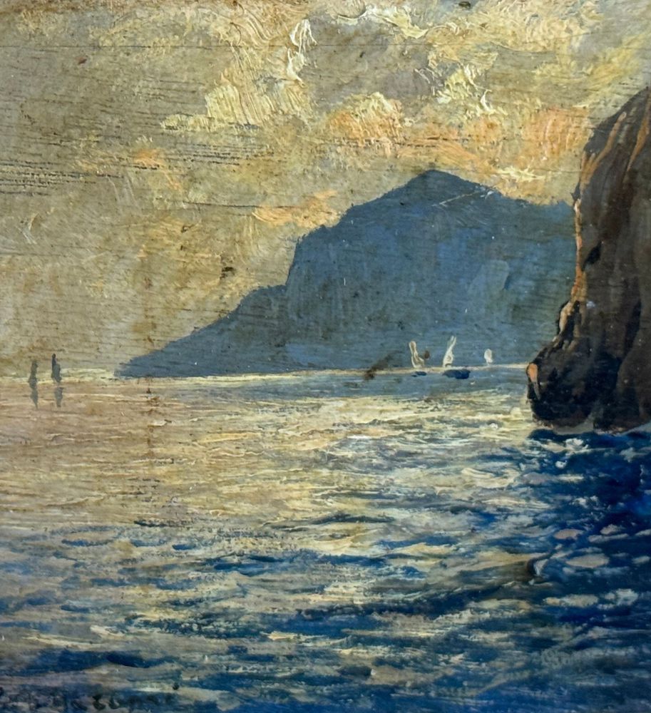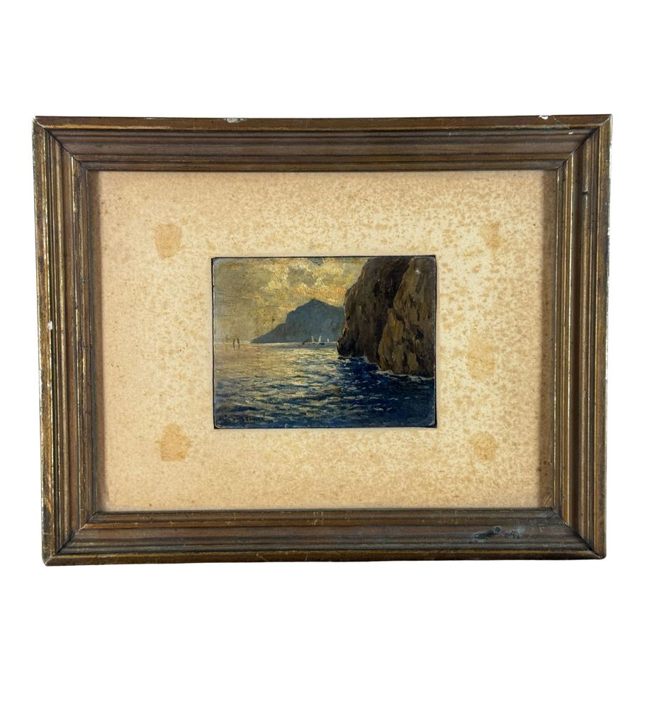 Dipinto olio su cartoncino, periodo XX secolo, scuola Italiana, raffigurante Scorcio di marina di Capri. Dimensioni compreso cornice: 29x23 cm. Dimensioni interno cornice: 12x9 cm. Firmato in basso a sinistra Attilio Pratella. Opera in buone condizioni.