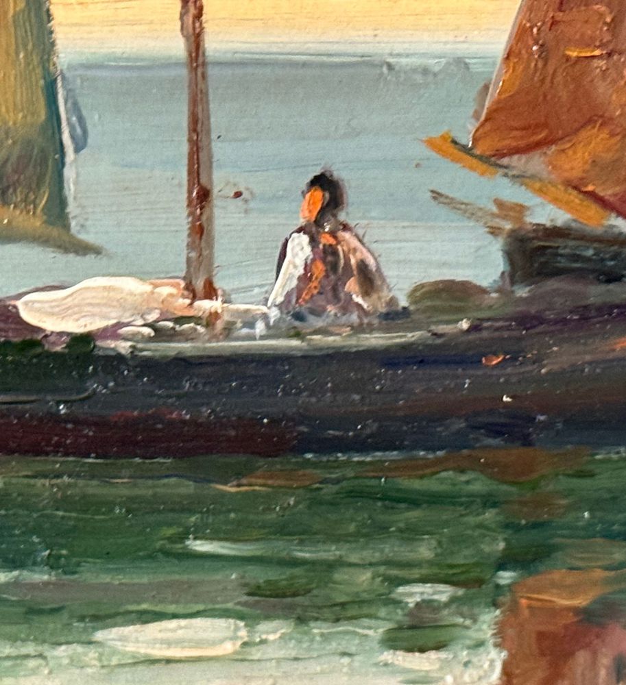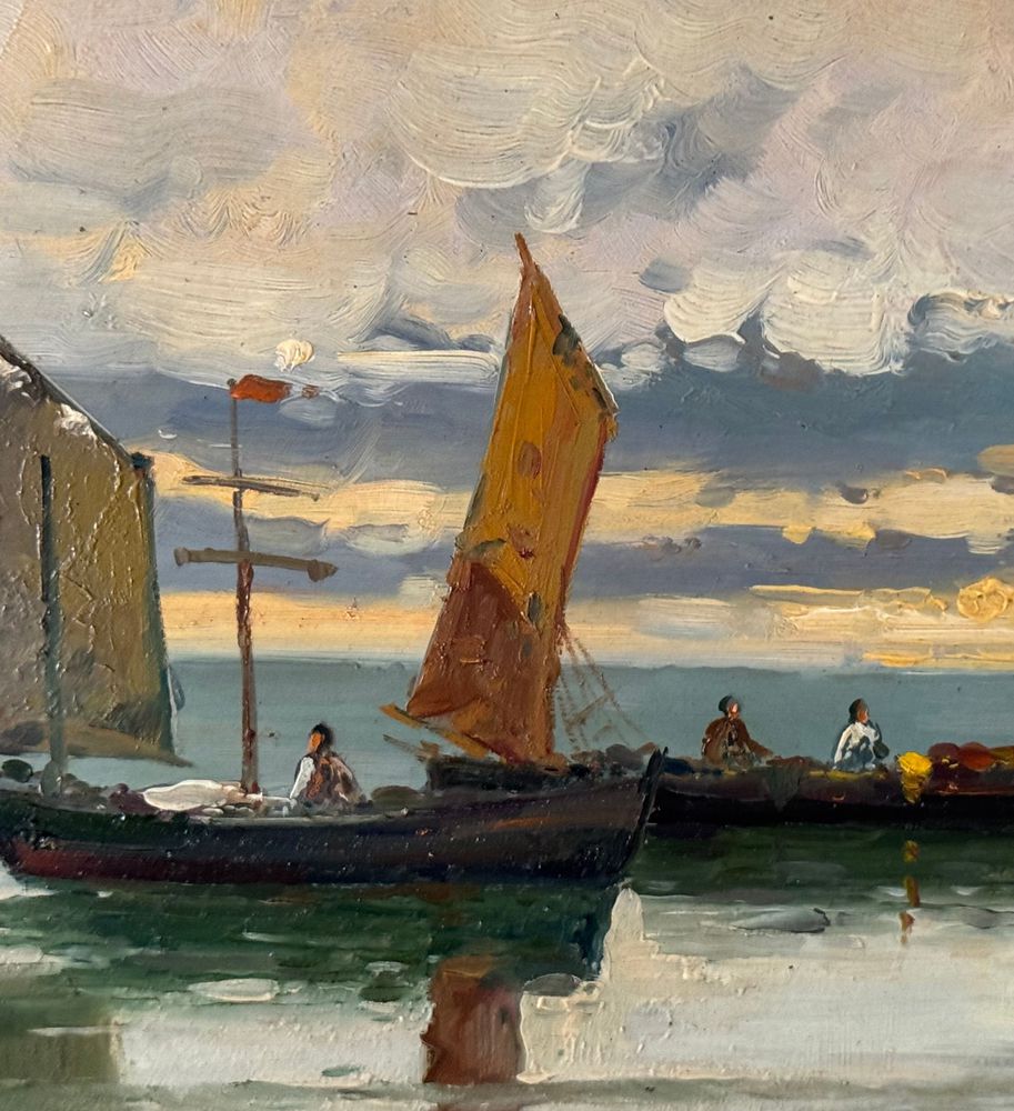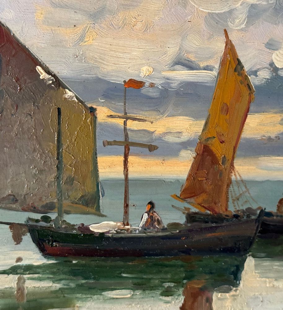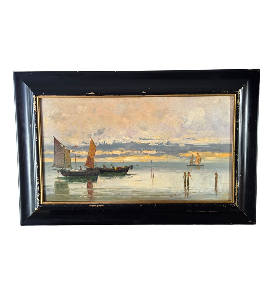 Dipinto olio su cartoncino, periodo XX secolo, scuola Italiana raffigurante Scorcio di marina con barche a vela. Dimensioni compreso cornice: 60x39 cm. Dimensioni interno cornice: 48x27 cm. Artista anonimo. Opera in buone condizioni.