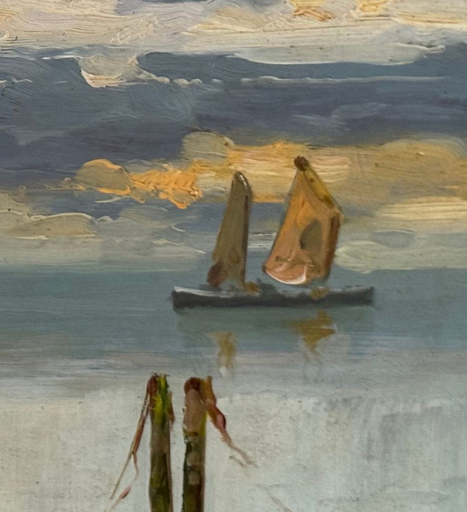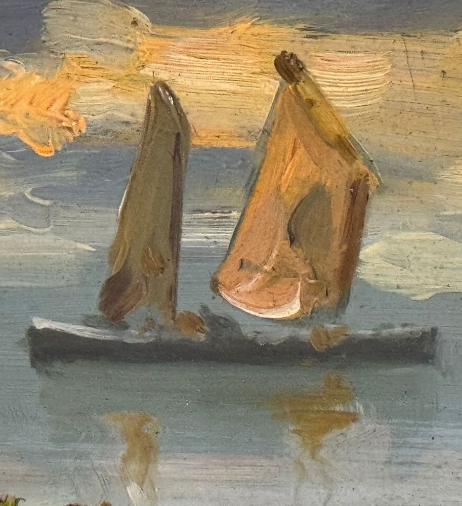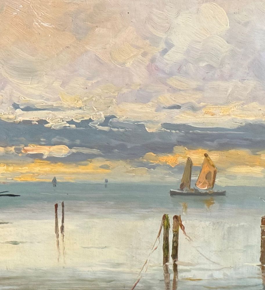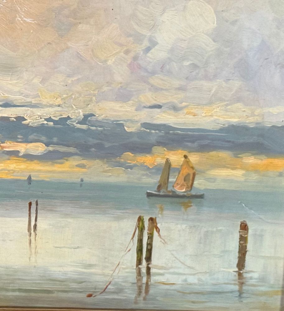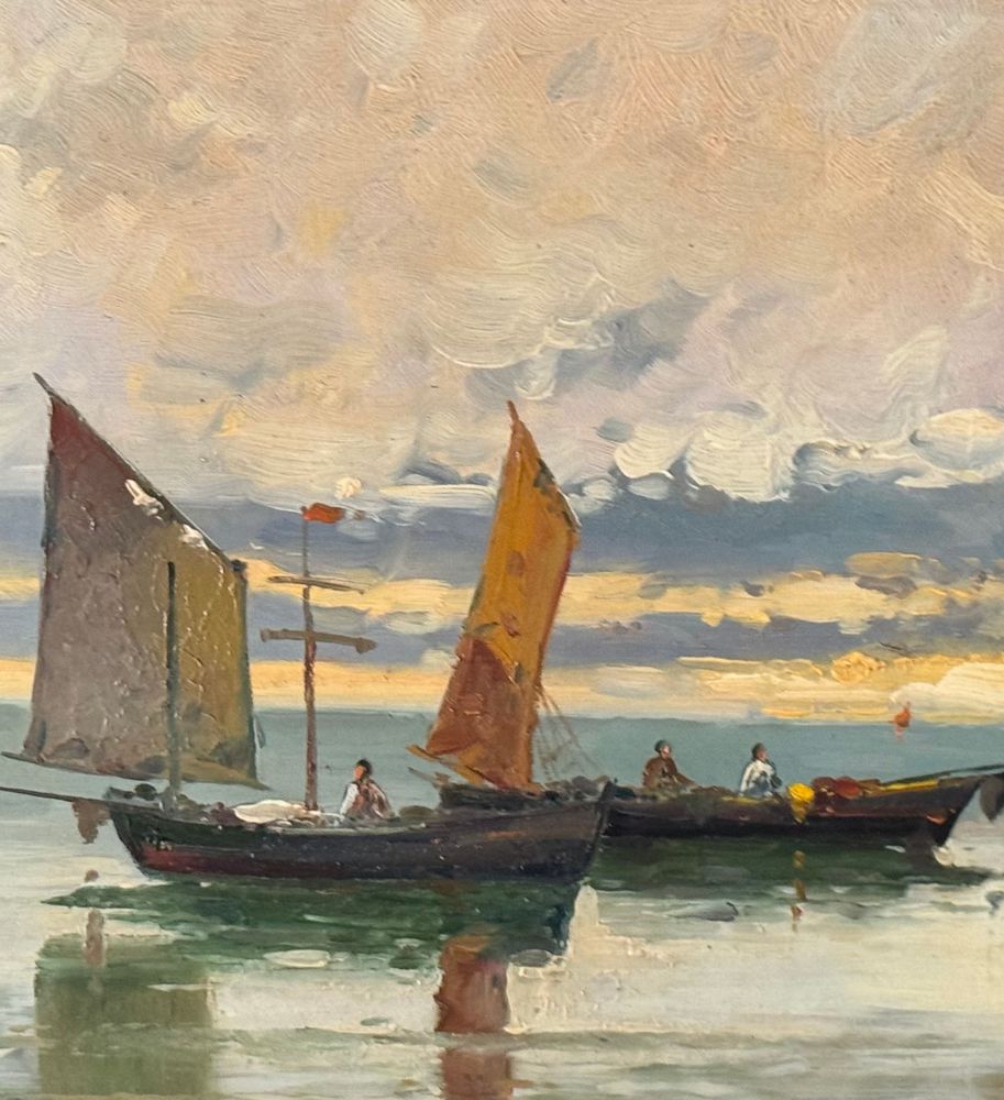 Dipinto olio su cartoncino, periodo XX secolo, scuola Italiana raffigurante Scorcio di marina con barche a vela. Dimensioni compreso cornice: 60x39 cm. Dimensioni interno cornice: 48x27 cm. Artista anonimo. Opera in buone condizioni.